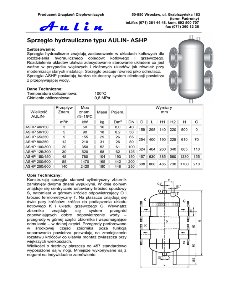 Producent Urządzeń Ciepłowniczych 50-950 Wrocław, ul. Grabiszyńska 163 (teren Fadromy) tel./fax (071) 361 44 48, kom. 693 500 707 fax (071) 360 12 36 Sprzęgło hydrauliczne typu AULIN- ASHP Zastosowanie: Sprzęgła hydrauliczne znajdują zastosowanie w układach kotłowych dla rozdzielenia hydraulicznego obiegów: kotłowego i grzewczego. Rozdzielenie układów ułatwia zdecydowanie sterowanie układem co jest ważne w przypadku większych i złożonych układów jak również przy modernizacji starych instalacji. Sprzęgło pracuje również jako odmulacz. Sprzęgła ASHP posiadają bardzo skuteczny system eliminacji powietrza z przepływającej wody. Dane Techniczne: Temperatura obliczeniowa: Ciśnienie obliczeniowe: Wielkość AULINASHP 40/150 ASHP 50/150 ASHP 65/250 ASHP 80/250 ASHP 100/300 ASHP 125/300 ASHP 150/450 ASHP 200/600 ASHP 250/600 Przepływ Znam. 100°C 0,6 MPa m3/h Moc znam. ∆t=15ºC kW 3 5 9 12 20 30 45 85 140 50 90 155 210 350 520 780 1470 2420 Wymiary mm Masa Pojem. kg Dm3 DN 16 18 29 31 52 58 104 165 180 8,0 8,2 26 26 61 62 193 442 448 40 50 65 80 100 125 150 200 250 Opis Techniczny: Konstrukcję sprzęgła stanowi cylindryczny zbiornik zamknięty dwoma dnami wypukłymi. W dnie dolnym znajduje się centrycznie ustawiony króciec spustowy S, natomiast w górnym króciec odpowietrzający O i króciec termometryczny T. Na płaszczu znajdują się dwie pary króćców: króćce do podłączenia układu kotłowego K i układu grzewczego G. Wewnątrz zbiornika znajduje się system przegród zapewniających dobre odpowietrzenie wody – przegrody w górnej części zbiornika i wspomagające odmulanie – w dolnej części. Przegrody perforowane w środkowej części zbiornika poza funkcją separowania powietrza pozwalają na zmniejszenie rozstawu króćców co ułatwia montaż zwłaszcza przy większych wielkościach. Wielkości o średnicy płaszcza od 457 standardowo wyposażone są w nogi. Mniejsze wykonywane są z nogami na indywidualne zamówienie. D L H1 H2 H C 159 295 140 220 500 0 254 400 190 225 610 70 324 464 260 340 865 110 457 630 385 560 1330 155 608 800 485 730 1700 210