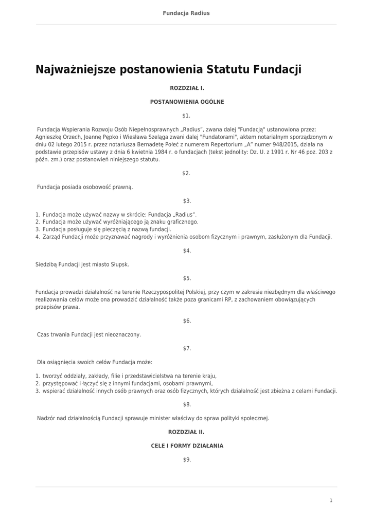 Fundacja Radius Najważniejsze postanowienia Statutu Fundacji ROZDZIAŁ I. POSTANOWIENIA OGÓLNE $1. Fundacja Wspierania Rozwoju Osób Niepełnosprawnych „Radius”, zwana dalej "Fundacją" ustanowiona przez: Agnieszkę Orzech, Joannę Pępko i Wiesława Szeląga zwani dalej "Fundatorami", aktem notarialnym sporządzonym w dniu 02 lutego 2015 r. przez notariusza Bernadetę Połeć z numerem Repertorium „A” numer 948/2015, działa na podstawie przepisów ustawy z dnia 6 kwietnia 1984 r. o fundacjach (tekst jednolity: Dz. U. z 1991 r. Nr 46 poz. 203 z późn. zm.) oraz postanowień niniejszego statutu. $2. Fundacja posiada osobowość prawną. $3. 1. 2. 3. 4. Fundacja może używać nazwy w skrócie: Fundacja „Radius”. Fundacja może używać wyróżniającego ją znaku graficznego. Fundacja posługuje się pieczęcią z nazwą fundacji. Zarząd Fundacji może przyznawać nagrody i wyróżnienia osobom fizycznym i prawnym, zasłużonym dla Fundacji. $4. Siedzibą Fundacji jest miasto Słupsk. $5. Fundacja prowadzi działalność na terenie Rzeczypospolitej Polskiej, przy czym w zakresie niezbędnym dla właściwego realizowania celów może ona prowadzić działalność także poza granicami RP, z zachowaniem obowiązujących przepisów prawa. $6. Czas trwania Fundacji jest nieoznaczony. $7. Dla osiągnięcia swoich celów Fundacja może: 1. tworzyć oddziały, zakłady, filie i przedstawicielstwa na terenie kraju, 2. przystępować i łączyć się z innymi fundacjami, osobami prawnymi, 3. wspierać działalność innych osób prawnych oraz osób fizycznych, których działalność jest zbieżna z celami Fundacji. $8. Nadzór nad działalnością Fundacji sprawuje minister właściwy do spraw polityki społecznej. ROZDZIAŁ II. CELE I FORMY DZIAŁANIA $9. 1 Fundacja Radius Cele Fundacji: 1. 2. 3. 4. 5. 6. 7. 8. 9. 10. 11. 12. 13. 14. 15. 16. 17. 18. 19. Przeciwdziałanie wszelkim formom dyskryminacji i wykluczenia wobec osób niepełnosprawnych. Pomoc osobom niepełnosprawnym i ich rodzinom w pokonywaniu barier związanych z niepełnosprawnością. Organizowanie kompleksowej opieki i wsparcia dla rodzin z dzieckiem niepełnosprawnym. Propagowanie idei integracji i włączania osób niepełnosprawnych w obszarze edukacji, kultury, sportu oraz życia społecznego i zawodowego. Wspieranie i aktywizowanie rozwoju osób niepełnosprawnych w sferze społecznej i zawodowej. Wpływanie na świadomość społeczną i kształtowanie prawidłowych postaw wobec osób niepełnosprawnych. Zwiększanie dostępu do przestrzeni, transportu, informacji i komunikacji osób niepełnosprawnych. Wyrównywanie szans osób niepełnosprawnych w dostępie do wiedzy, nauki i informacji. Popularyzowanie i wdrażanie nowoczesnych rozwiązań oraz technologii ułatwiających funkcjonowanie osobom niepełnosprawnym. Upowszechnianie wiedzy na temat edukacji, rehabilitacji oraz kompleksowego wspomagania osób niepełnosprawnych. Działalność na rzecz przestrzegania i ochrony praw osób niepełnosprawnych. Reprezentowanie interesów środowiska osób niepełnosprawnych, ich rodzin oraz osób z otoczenia. Upowszechnianie czytelnictwa wśród osób niepełnosprawnych, a szczególnie e-czytelnictwa. Promowanie aktywności fizycznej wśród osób niepełnosprawnych i ich rodzin. Wspieranie rozwoju kulturalnego osób niepełnosprawnych. Upowszechnianie alternatywnych metod komunikacji, w tym metod porozumiewania się osób niesłyszących, głuchoniewidomych, z zaburzeniami mowy. Inicjowanie i wdrażanie rozwiązań ułatwiających funkcjonowanie osobom niepełnosprawnym w przestrzeni publicznej. Pomoc dzieciom, młodzieży i dorosłym niepełnosprawnym w nauce i adaptacji do społeczeństwa osób sprawnych oraz prowadzenie działań zmierzających do integracji obu środowisk. Wspieranie działań woluntarystycznych i samopomocowych. #10. Cele te Fundacja może realizować w ramach: Działalność nieodpłatną pożytku publicznego poprzez: 1. Organizowanie wsparcia psychologicznego, pedagogicznego i socjoterapeutycznego dla osób niepełnosprawnych, ich rodzin oraz osób z otoczenia. 2. Prowadzenie doradztwa prawnego w zakresie rozwiązywania problemów związanych z niepełnosprawnością. 3. Aktywizację zawodową osób niepełnosprawnych pozostających bez pracy lub zagrożonych utratą pracy w tym: promocja zatrudnienia, poradnictwo zawodowe i pośrednictwo pracy. 4. Prowadzenie działalności edukacyjnej, szkoleniowej dla rodzin i osób zajmujących się pracą i współpracą z osobami niepełnosprawnymi. 5. Kształcenie kadr świadczących usługi osobom niepełnosprawnym w obszarze edukacji, rehabilitacji, aktywizacji zawodowej, integracji społecznej. 6. Upowszechnianie i monitorowanie wdrażania konwencji, dokumentów krajowych, europejskich i światowych dotyczących praw osób niepełnosprawnych. 7. Organizowanie konferencji, sympozjów, szkoleń, warsztatów i wystaw dotyczących problematyki związanej z niepełnosprawnością. 8. Prowadzenie działalności naukowo-badawczej, w tym analiz, ekspertyz i programów działania na rzecz osób niepełnosprawnych. 9. Współpraca z instytucjami publicznymi oraz organizacjami krajowymi i zagranicznymi, których działalność może przyczynić się do realizacji celów Fundacji. 10. Organizowanie i prowadzenie obozów, turnusów rehabilitacyjnych i specjalistycznych dla osób niepełnosprawnych, ich rodzin oraz osób z otoczenia. 11. Wydawanie pism, biuletynów i innych publikacji drukowanych, elektronicznych oraz w innych formach, w tym pismem Braille’a. 2 Fundacja Radius 12. Popularyzowanie wiedzy na temat możliwości, specyficznych potrzeb i funkcjonowania osób niepełnosprawnych. 13. Organizowanie turystyki oraz imprez sportowych i rekreacyjnych. 14. Uczestnictwo w różnych dziedzinach kultury i rozwijanie umiejętności artystycznych. 15. Prowadzenie kampanii informacyjnych na rzecz osób niepełnosprawnych z wykorzystaniem mediów lokalnych i kra