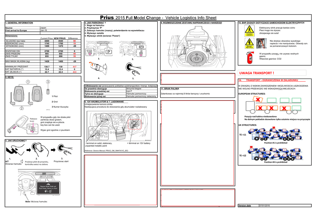 Prius 2015 Full Model Change - Vehicle Logistics Info Sheet 1. GENERAL INFORMATION Source First arrival to Europe 4. JAK PARKOWAC ? 1. Noga na hamulcu 2. Przytrzymac 'P' 3. Zalaczyc hamulec (nozny), potwierdzenie na wyswietlaczu 4. Wylaczyc swiatla 5. Wylaczyc silnik (wcisnac 'Power') Japan Jan-16 Dimensions: Current Prius NEW PRIUS 4460 4540 1745 1760 1499 1470 DLUGOSC bez haka SZEROKOSC (mm) WYSOKOSC (mm) 9. ROZMIESZCZENIE ZESTAWU NAPRAWCZEGO I NARZEDZI 15. BHP ZASADY DOTYCZACE SAMOCHODOW ELEKTRYCZNYCH Elektryczny silnik pracuje bardzo cicho Piesi moga nie slyszec zbizajacego sie auta! Difference 80 15 -29 ROZSTAW OSI ZWIS PRZEDNI ZWIS TYLNY 2700 905 855 2700 950 890 0 45 35 MAX MASA WLASNA (kg) 1428 1400 -28 MINIMALNY PRZESWIT KAT NATARCIA (°) KAT ZEJSCIA (°) 130.7 12.4 22.7 130 12.4 22.4 -0.7 0 -0.3 Nie dotykac obwodow wysokiego napiecia i nie manipulowac. Obwody ozn. sa pomaranczowym kolorem. 2. W przypadku pozaru, nie uzywac wodnych gasnic. Wlasciwe gasnice: CO2 3. UWAGA TRANSPORT ! 10. TORQUE ON WHEEL NUTS 2. KEYS: 4. 1 Pilot 2 Grot 3 Numer kluczyka 5. 5.Blokowanie osi (przesuwanie pokladow autotransportera i transp. kolejowy)) skrzynia biegow Os przednia obsluguje tryb P Blokowanie przedniej osi Hamulec pomocniczy Tylna os obsluguje Hamulec pomocniczy zalaczony Blokowanie tylnej osi 6. 12V AKUMULATOR & 7. LADOWANIE Umiejscowienie komora sinika Nastepujaca procedura do stosowania gdy akumulator rozladowany Wheel nuts to be torqued to 103 Nm 16. 11. BRAK PALIWA W ZWIAZKU Z NISKIM ZAWIESZENIEM I MOZLIWOSCIA USZKODZENIA NIE WOLNO PRZEWOZIC WE WSKAZANYCH MIEJSCACH: Zatankowac co najmniej 8 litrów benzyny i uruchomic EUROPEAN STRUCTURES: TRANSPORT - OGRANICZENIA W ZALADUNKU 12. HOLOWANIE Jesli auto musi byc holowane, to z podniesiona przednia osia (jesli przednie kola na ziemi, silnik elektryczny generuje energie eletryczna zagrozenie pozarem) Pozycja nad kabina niedozwolona Na dolnym pokladzie dozwolone tylko ostatnie miejsce na przyczepie W przypadku gdy nie dziala pilot zamknac drzwi grotem, grot znajduje sie w pilocie. key box can be used. 13. VESSEL TRANSPORT - TIE DOWN INSTRUCTION UK STRUCTURES: Wyjac grot zgodnie z rysunkiem TE +11 3. JAK URUCHOMIC? Position #1 is prohibited + terminal on 12V battery A/T Wcisnac hamulec 2. Przylozyc pilot do przycisku, kontrolka swieci na zielono 3. Przycisnac start TE +12 Lashing angles 8. UZYCIE PODNOSNIKA 1. Rear Front Reference: Owners Manual, PRIUS_OM_OM47A31E_(EE) 80º 80º 80º Front RH - terminal on solid, stationary, unpainted metallic point Position #4 is prohibited 80º 80º 80º 14. RAIL TRANSPORT ATTENTION POINTS For each loading ramp and wagon type it is necessary to perform load trial. Note: Wcisnac hamulec Attention points: 1) Damage to vehicle underbody at ramp and wagon crossings. 2) Clearance between chock and wheel arch. Prefered chocking on rear axle. Version date 07/01/2016