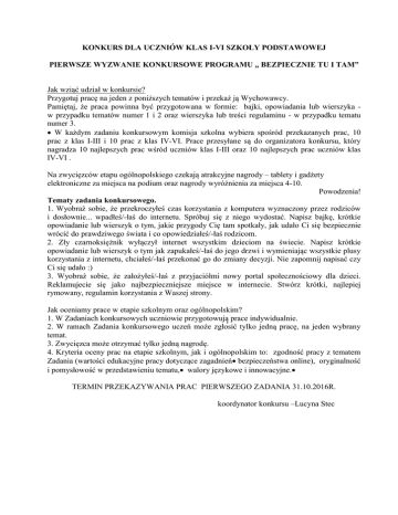 KONKURS DLA UCZNIÓW KLAS I-VI SZKOŁY PODSTAWOWEJ PIERWSZE WYZWANIE KONKURSOWE PROGRAMU „ BEZPIECZNIE TU I TAM” Jak wziąć udział w konkursie? Przygotuj pracę na jeden z poniższych tematów i przekaż ją Wychowawcy. Pamiętaj, że praca powinna być przygotowana w formie: bajki, opowiadania lub wierszyka w przypadku tematów numer 1 i 2 oraz wierszyka lub treści regulaminu - w przypadku tematu numer 3. W każdym zadaniu konkursowym komisja szkolna wybiera spośród przekazanych prac, 10 prac z klas I-III i 10 prac z klas IV-VI. Prace przesyłane są do organizatora konkursu, który nagradza 10 najlepszych prac wśród uczniów klas I-III oraz 10 najlepszych prac uczniów klas IV-VI . Na zwycięzców etapu ogólnopolskiego czekają atrakcyjne nagrody – tablety i gadżety elektroniczne za miejsca na podium oraz nagrody wyróżnienia za miejsca 4-10. Powodzenia! Tematy zadania konkursowego. 1. Wyobraź sobie, że przekroczyłeś czas korzystania z komputera wyznaczony przez rodziców i dosłownie... wpadłeś/-łaś do internetu. Spróbuj się z niego wydostać. Napisz bajkę, krótkie opowiadanie lub wierszyk o tym, jakie przygody Cię tam spotkały, jak udało Ci się bezpiecznie wrócić do prawdziwego świata i co opowiedziałeś/-łaś rodzicom. 2. Zły czarnoksiężnik wyłączył internet wszystkim dzieciom na świecie. Napisz krótkie opowiadanie lub wierszyk o tym jak zapukałeś/-łaś do jego drzwi i wymieniając wszystkie plusy korzystania z internetu, chciałeś/-łaś przekonać go do zmiany decyzji. Nie zapomnij napisać czy Ci się udało :) 3. Wyobraź sobie, że założyłeś/-łaś z przyjaciółmi nowy portal społecznościowy dla dzieci. Reklamujecie się jako najbezpieczniejsze miejsce w internecie. Stwórz krótki, najlepiej rymowany, regulamin korzystania z Waszej strony. Jak oceniamy prace w etapie szkolnym oraz ogólnopolskim? 1. W Zadaniach konkursowych uczniowie przygotowują̨ prace indywidualnie. 2. W ramach Zadania konkursowego uczeń może zgłosić tylko jedną pracę, na jeden wybrany temat. 3. Zwycięzca może otrzymać tylko jedną nagrodę. 4. Kryteria oceny prac na etapie szkolnym, jak i ogólnopolskim to: zgodność pracy z tematem Zadania (wartości edukacyjne pracy dotyczące zagadnień bezpieczeństwa online), oryginalność i pomysłowość w przedstawieniu tematu, walory językowe i innowacyjne. TERMIN PRZEKAZYWANIA PRAC PIERWSZEGO ZADANIA 31.10.2016R. koordynator konkursu –Lucyna Stec