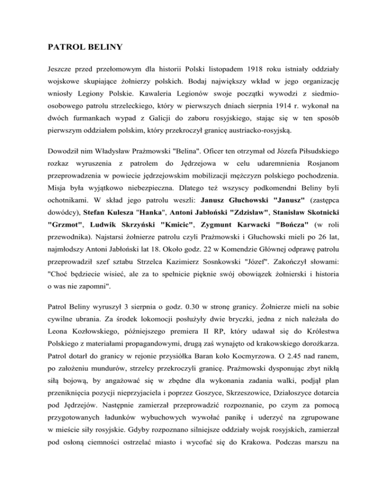 PATROL BELINY Jeszcze przed przełomowym dla historii Polski listopadem 1918 roku istniały oddziały wojskowe skupiające żołnierzy polskich. Bodaj największy wkład w jego organizację wniosły Legiony Polskie. Kawaleria Legionów swoje początki wywodzi z siedmioosobowego patrolu strzeleckiego, który w pierwszych dniach sierpnia 1914 r. wykonał na dwóch furmankach wypad z Galicji do zaboru rosyjskiego, stając się w ten sposób pierwszym oddziałem polskim, który przekroczył granicę austriacko-rosyjską. Dowodził nim Władysław Prażmowski "Belina". Oficer ten otrzymał od Józefa Piłsudskiego rozkaz wyruszenia z patrolem do Jędrzejowa w celu udaremnienia Rosjanom przeprowadzenia w powiecie jędrzejowskim mobilizacji mężczyzn polskiego pochodzenia. Misja była wyjątkowo niebezpieczna. Dlatego też wszyscy podkomendni Beliny byli ochotnikami. W skład jego patrolu weszli: Janusz Głuchowski "Janusz" (zastępca dowódcy), Stefan Kulesza "Hanka", Antoni Jabłoński "Zdzisław", Stanisław Skotnicki "Grzmot", Ludwik Skrzyński "Kmicic", Zygmunt Karwacki "Bończa" (w roli przewodnika). Najstarsi żołnierze patrolu czyli Prażmowski i Głuchowski mieli po 26 lat, najmłodszy Antoni Jabłoński lat 18. Około godz. 22 w Komendzie Głównej odprawę patrolu przeprowadził szef sztabu Strzelca Kazimierz Sosnkowski "Józef". Zakończył słowami: "Choć będziecie wisieć, ale za to spełnicie pięknie swój obowiązek żołnierski i historia o was nie zapomni". Patrol Beliny wyruszył 3 sierpnia o godz. 0.30 w stronę granicy. Żołnierze mieli na sobie cywilne ubrania. Za środek lokomocji posłużyły dwie bryczki, jedna z nich należała do Leona Kozłowskiego, późniejszego premiera II RP, który udawał się do Królestwa Polskiego z materiałami propagandowymi, drugą zaś wynajęto od krakowskiego dorożkarza. Patrol dotarł do granicy w rejonie przysiółka Baran koło Kocmyrzowa. O 2.45 nad ranem, po założeniu mundurów, strzelcy przekroczyli granicę. Prażmowski dysponując zbyt nikłą siłą bojową, by angażować się w zbędne dla wykonania zadania walki, podjął plan przeniknięcia pozycji nieprzyjaciela i poprzez Goszyce, Skrzeszowice, Działoszyce dotarcia pod Jędrzejów. Następnie zamierzał przeprowadzić rozpoznanie, po czym za pomocą przygotowanych ładunków wybuchowych wywołać panikę i uderzyć na zgrupowane w mieście siły rosyjskie. Gdyby rozpoznano silniejsze oddziały wojsk rosyjskich, zamierzał pod osłoną ciemności ostrzelać miasto i wycofać się do Krakowa. Podczas marszu na Jędrzejów rozpuszczał wśród ludności wieść, iż jego patrol stanowi awangardę silnej grupy strzelców. W ten sposób zamierzał wywrzeć presję psychologiczną na władze rosyjskie w Jędrzejowie. Maszerujący patrol kilkakrotnie musiał zmieniać mundury na ubrania cywilne. O godzinie 4.00 strzelcy zatrzymali się w Goszycach u Zofii Zawiszanki, członkini Drużyn Strzeleckich. Uzyskali od niej niezbędne informacje i otrzymali dwie furmanki wraz ze zaznajomionymi z miejscową topografią woźnicami. Z Goszyc wysłał Belina meldunek do Piłsudskiego. Ponownie założywszy ubrania cywilne patrol o godz. 6.30 wymaszerował do Działoszyc, gdzie przed urzędem gminnym napotkał rosyjskiego strażnika, lecz bez żadnych kłopotów przejechał dalej. Pomiędzy godz. 11.15 a 13.00 Polacy odpoczywali w lasku na północ od Kropidła, po czym podjęli dalszy marsz. O 14.05 o 10 km od Jędrzejowa napotkali grupki mężczyzn wracających z punktów mobilizacyjnych. Strzelcy dowiedzieli się od nich, iż władze rosyjskie, pod wpływem wieści o marszu oddziałów strzeleckich z Krakowa na Jędrzejów, zaniechały mobilizacji i podjęły natychmiastową ewakuację, opuszczając miasto. Po potwierdzeniu zdobytych informacji u kolejnych grup niedoszłych rekrutów, Belina uznał swoje zadanie za wykonane i wydał rozkaz powrotu do Krakowa. Aby maksymalnie wykorzystać udane przekroczenie granicy postanowił zrobić to, rozpoznając jednocześnie Słomniki, gdzie stacjonowała rosyjska straż graniczna. Patrol przez Giebułtów, Maciejów, Janowice, Kalinę, Jachowice i Sławice po zapadnięciu zmroku dotarł do wzgórza 315 pod Słomnikami, gdzie zatrzymał się na kolejny odpoczynek. O godz. 21.00 Głuchowski "Janusz" i Karwacki "Bończa" udali się do miasteczka celem rozpoznania stacjonujących tam oddziałów wroga. Stwierdzili oni obecność sześciu pieszych plutonów straży granicznej, które zgrupowane na rynku wkrótce miały odmaszerować na Miechów i Jędrzejów. Ze względu na dużą liczbę cywilów, obserwujących wymarsz rosyjskich wojsk, Polacy nie otworzyli ognia. Na noc strzelcy zatrzymali się w polu około 500 m od wsi Prandocin ubezpieczając się od strony Prandocina i Słomnik. Nad ranem zostali zaalarmowani pojawieniem się w odległości kilkuset kroków rosyjskiego patrolu, który spostrzegł biwakujących Polaków. Gęsta mgła sprawiła, że Rosjanie nie podjęli walki, spodziewając się, że Polaków może być znacznie więcej. Wysłani o godz. 3.00 przez Belinę na zwiady Głuchowski i Karwacki zameldowali, że przebywający w Prandocinie szwadron straży granicznej właśnie zaczął się wycofywać na wschód. W zaistniałej sytuacji Prażmowski wydał rozkaz marszu z bagnetem na broni na Prandocin i zajęcia miejscowości. W Prandocinie strzelcy zostali pobłogosławieni przez polskiego księdza. Był to ks. Wiadrowski, powstaniec z 1863 r., spoczywający obecnie na cmentarzu w Prandocinie. Wobec braku styczności z nieprzyjacielem patrol podjął marsz do Krakowa przez Skrzeszowice-Goszyce. W Skrzeszowicach Prażmowski zatrzymał się w majątku zarządzanym przez Bogusława Kleszczyńskiego. Do strzelców ochotniczo dołączył wówczas brat właściciela tamtejszego majątku Edward Kleszczyński, który przybrał pseudonim "Dzik". Za cichym przyzwoleniem brata (a bez wiedzy matki, Heleny Kleszczyńskiej, faktycznie spra