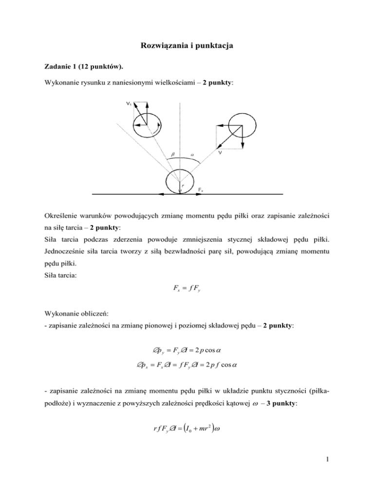 - zapisanie zależności na zmianę momentu pędu piłki w układzie punktu styczności (piłkapodłoże) i wyznaczenie z powyższych zależności prędkości kątowej ω – 3 punkty: