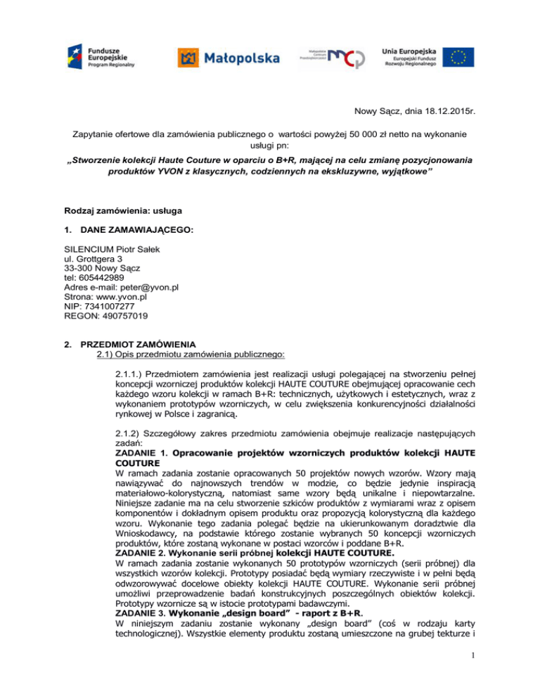 Nowy Sącz, dnia 18.12.2015r. Zapytanie ofertowe dla zamówienia publicznego o wartości powyżej 50 000 zł netto na wykonanie usługi pn: „Stworzenie kolekcji Haute Couture w oparciu o B+R, mającej na celu zmianę pozycjonowania produktów YVON z klasycznych, codziennych na ekskluzywne, wyjątkowe” Rodzaj zamówienia: usługa 1. DANE ZAMAWIAJĄCEGO: SILENCIUM Piotr Sałek ul. Grottgera 3 33-300 Nowy Sącz tel: 605442989 Adres e-mail: [email protected] Strona: www.yvon.pl NIP: 7341007277 REGON: 490757019 2. PRZEDMIOT ZAMÓWIENIA 2.1) Opis przedmiotu zamówienia publicznego: 2.1.1.) Przedmiotem zamówienia jest realizacji usługi polegającej na stworzeniu pełnej koncepcji wzorniczej produktów kolekcji HAUTE COUTURE obejmującej opracowanie cech każdego wzoru kolekcji w ramach B+R: technicznych, użytkowych i estetycznych, wraz z wykonaniem prototypów wzorniczych, w celu zwiększenia konkurencyjności działalności rynkowej w Polsce i zagranicą. 2.1.2) Szczegółowy zakres przedmiotu zamówienia obejmuje realizacje następujących zadań: ZADANIE 1. Opracowanie projektów wzorniczych produktów kolekcji HAUTE COUTURE W ramach zadania zostanie opracowanych 50 projektów nowych wzorów. Wzory mają nawiązywać do najnowszych trendów w modzie, co będzie jedynie inspiracją materiałowo-kolorystyczną, natomiast same wzory będą unikalne i niepowtarzalne. Niniejsze zadanie ma na celu stworzenie szkiców produktów z wymiarami wraz z opisem komponentów i dokładnym opisem produktu oraz propozycją kolorystyczną dla każdego wzoru. Wykonanie tego zadania polegać będzie na ukierunkowanym doradztwie dla Wnioskodawcy, na podstawie którego zostanie wybranych 50 koncepcji wzorniczych produktów, które zostaną wykonane w postaci wzorców i poddane B+R. ZADANIE 2. Wykonanie serii próbnej kolekcji HAUTE COUTURE. W ramach zadania zostanie wykonanych 50 prototypów wzorniczych (serii próbnej) dla wszystkich wzorów kolekcji. Prototypy posiadać będą wymiary rzeczywiste i w pełni będą odwzorowywać docelowe obiekty kolekcji HAUTE COUTURE. Wykonanie serii próbnej umożliwi przeprowadzenie badań konstrukcyjnych poszczególnych obiektów kolekcji. Prototypy wzornicze są w istocie prototypami badawczymi. ZADANIE 3. Wykonanie „design board” - raport z B+R. W niniejszym zadaniu zostanie wykonany „design board” (coś w rodzaju karty technologicznej). Wszystkie elementy produktu zostaną umieszczone na grubej tekturze i 1 opisane, tak aby wykonawca miał dokładną informacje jak wytworzyć dany produkt. Po wykonaniu serii próbnej konstruktor będzie miał gotową koncepcję techniczną produkcji, którą umieści na „design board”. „Design board” będzie w istocie rzeczy raportem z B+R, w którym zostaną przedstawione wszystkie uwarunkowania produktu w celu wprowadzenia go w proces produkcyjny. ZADANIE 4. Wykonanie dokumentacji fotograficznej kolekcji HAUTE COUTURE W ramach zadania wykonana zostanie dokumentacja fotograficzna, w postaci minimum 5 zdjęć dla każdego produktu. Zdjęcia odnosić się będą do kluczowych zagadnień konstrukcyjnych, dla każdego wyodrębnionego zagadnienia powstanie minimum jedno zdjęcie. Opis zagadnień konstrukcyjnych zobrazowanych zdjęciem zostanie przedstawiony w zadaniu 3. ZADANIE 5. Wykonanie badań rynkowych. Realizacja tego zdania składać się będzie z dwóch części: 1) wykonanie badań o charakterze pierwotnym, 2) opracowanie raportu badawczego. Sporządzony raport zawierać będzie następujące części: 1. Identyfikacja rynku. 2. Segmentacja rynku. 3. Cele badania. 4. Metody badawcze. 5. Dobór próby i kwestionariusze badawcze. 6. Przebieg badania bezpośredniego. 7. Wnioskowanie: analizy i diagnozy. ZADANIE 6. Opracowanie strategii rynkowej. Realizacja tego zadania polegać będzie na przygotowaniu strategii działań rynkowych zarówno na rynku polskim, jak i zagranicznym wraz z operacjonalizacją kluczowych aktywności marketingowych. Strategia zawierać będzie następujące części: 1.Analiza rynku i koncepcji marketingu; 2. Analiza finansowa. 2.1.3) Wzornictwo Haute Couture ma uwzględniać zastosowanie produktu niszowego przez wybór trudnodostępnych materiałów (takich jak: crystal stone no.6, skóra bydlęca na wzór sierści konia z miękkim włosiem oraz innych w uzgodnieniu z Zamawiającym) użycie niespotykanych form (romb, trapez) jak i łączeń kolorystycznych. Wykonawca musi posiadać potencjał umożliwiający realizację usługi. Niedopuszczalne jest podzlecanie usług (w jakimkolwiek zakresie) innym podmiotom. 2.2) Wspólny Słownik Zamówień: 73200000-4; 18510000-7 2.3) Termin realizacji zamówienia: 31.07.2016r, w tym termin wykonania poszczególnych zadań: Zadanie 1: 31.03.2016r. Zadanie 2: 31.05.2016r. Zadanie 3: 30.06.2016 Zadanie 4: 30.06.2016r. zadanie 5: 31.07.2016r. zadanie 6: 31.07.2016r. 3. WARUNKI UDZIAŁU W POSTĘPOWANIU ORAZ OPIS SPOSOBU DOKONYWANIA OCENY SPEŁNIANIA TYCH WARUNKÓW 3.1) Warunki udziału w postępowaniu: O zamówienie mogą ubiegać się wykonawcy, którzy spełniają następujące warunki: 3.1.1) Należą do jednej z poniżej wymienionych kategorii: 1) jednostka naukowa, w rozumieniu ustawy z dn. 30 kwietnia 2010 r. o zasadach finansowania nauki, posiadająca przyznaną kategorię naukową A+, A lub B, o której mowa w ww. ustawie i posiadająca siedzibę na terytorium RP, 2 2) przedsiębiorca posiadający status centrum badawczo-rozwojowego w rozumieniu ustawy z dn. 30 maja 2008 r. o niektórych formach wspierania działalności innowacyjnej, oraz posiadający siedzibę na terytorium RP, 3) niezależna jednostka, stanowiąca akredytowane laboratorium (posiadająca akredytację Polskiego Centrum Akredytacji) lub notyfikowane laboratorium (ujęte w aktualnym obwieszczeniu Ministra Gospodarki w sprawie informacji o notyfikowanych jednostkach certyfikujących i jednostkach kontrolujących oraz notyfikowanych laboratoriach), posiadające siedzibę na terytoriu