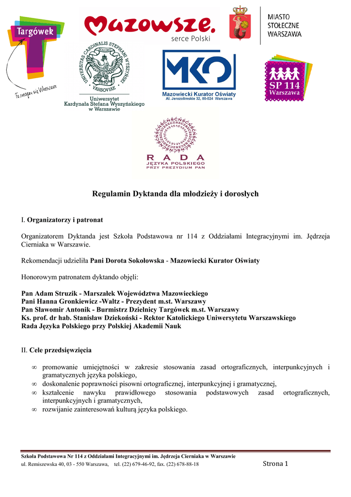 Regulamin Dyktanda dla młodzieży i dorosłych I. Organizatorzy i patronat Organizatorem Dyktanda jest Szkoła Podstawowa nr 114 z Oddziałami Integracyjnymi im. Jędrzeja Cierniaka w Warszawie. Rekomendacji udzieliła Pani Dorota Sokołowska - Mazowiecki Kurator Oświaty Honorowym patronatem dyktando objęli: Pan Adam Struzik - Marszałek Województwa Mazowieckiego Pani Hanna Gronkiewicz -Waltz - Prezydent m.st. Warszawy Pan Sławomir Antonik - Burmistrz Dzielnicy Targówek m.st. Warszawy Ks. prof. dr hab. Stanisław Dziekoński - Rektor Katolickiego Uniwersytetu Warszawskiego Rada Języka Polskiego przy Polskiej Akademii Nauk II. Cele przedsięwzięcia • • • • promowanie umiejętności w zakresie stosowania zasad ortograficznych, interpunkcyjnych i gramatycznych języka polskiego, doskonalenie poprawności pisowni ortograficznej, interpunkcyjnej i gramatycznej, kształcenie nawyku prawidłowego stosowania podstawowych zasad ortograficznych, interpunkcyjnych i gramatycznych, rozwijanie zainteresowań kulturą języka polskiego. Szkoła Podstawowa Nr 114 z Oddziałami Integracyjnymi im. Jędrzeja Cierniaka w Warszawie ul. Remiszewska 40, 03 - 550 Warszawa, tel. (22) 679-46-92, fax. (22) 678-88-18 Strona 1 III. Zasady uczestnictwa 1. Uczestnikiem Dyktanda mogą być uczniowie szkół ponadgimnazjalnych oraz każda chętna osoba, która ukończyła 18 lat. 2. Dyktando ma charakter otwarty. Liczba uczestników jest ograniczona, decyduje kolejność zgłoszeń. 3. Stopień trudności jest dla wszystkich jednakowy. 4. Warunkiem wzięcia udziału jest zgłoszenie uczestnictwa na adres email: [email protected] (uwaga – pomiędzy wyrazami Dyktando i Targowek należy zaznaczyć podkreślnik). 5. Termin nadsyłania zgłoszeń upływa 15 września 2015r. 6. Zgłaszający się są zobowiązani do podania swoich danych osobowych, tj. imię, nazwisko, adres, telefon, adres email. 7. Zgłoszenie uczestnictwa jest równoznaczne z wyrażeniem zgody na przetwarzanie danych osobowych do celów organizacyjnych i marketingowych organizatora Dyktanda (zgodnie z ustawą z dnia 29 sierpnia 1997 r. o ochronie danych osobowych - Dz. U. z 2002 r. Nr 101, poz. 926, ze zm.). Uzyskane dane nie będą przekazywane innym podmiotom. 8. Każdy z uczestników wyraża nieodwołalną zgodę na bezpłatne zarejestrowanie w czasie trwania Dyktanda, utrwalenie na nośnikach audiowizualnych jego wizerunku i danych w materiałach wydawanych i rozpowszechnianych publicznie i niepublicznie, w każdej formie i technice, służące pośrednio lub bezpośrednio promocji konkursu. 9. Udział w Dyktandzie jest bezpłatny. Organizator nie zwraca uczestnikom kosztów podróży. IV. Jury Nad przebiegiem Dyktanda czuwa jury powołane przez Organizatora. Decyzje jury są ostateczne. V. Przebieg Konkursu 1. DYKTANDO odbędzie się w Sali Konferencyjnej Urzędu Dzielnicy Targówek, m.st. Warszawy, ul. Kondratowicza 20, 00-983 Warszawa. (28 września 2015r. o godz. 17.30). W przypadku dużej liczby chętnych dyktando może zostać przeprowadzone w siedzibie szkoły. O tym fakcie organizator poinformuje piszących. 2. Rejestracja uczestników DYKTANDA rozpocznie się 1 września 2015r. Rejestracja opisana jest w punkcie III.4. Uwaga liczba miejsc ograniczona! Decydować będzie kolejność zgłoszeń. 3. Indywidualne prace zostaną zakodowane zgodnie z ustaleniami Organizatora. Prace zostaną odkodowane po sprawdzeniu. 4. Podczas pisania tekstu nie wolno korzystać z żadnych pomocy naukowych, porozumiewać się z innymi uczestnikami, opuszczać sali przed zebraniem prac, korzystać z wszelkich urządzeń elektronicznych (telefony komórkowe, notesy, laptopy, tablety) oraz ze słowników itp. Szkoła Podstawowa Nr 114 z Oddziałami Integracyjnymi im. Jędrzeja Cierniaka w Warszawie ul. Remiszewska 40, 03 - 550 Warszawa, tel. (22) 679-46-92, fax. (22) 678-88-18 Strona 2 5. Niedostosowanie się do zasad regulaminu objętych punktem 4. wpływa na dyskwalifikację piszącego. 6. Nie wolno pisanego tekstu pisać wersalikami, czyli wielkimi literami drukowanymi. 7. Prace nieczytelne nie będą podlegały sprawdzaniu i ocenie. 8. Ocenie podlegać będzie zarówno poprawność ortograficzna, interpunkcyjna, jak i gramatyczna. 9. Wszelkie nieczytelne i niejednoznaczne zapisy wyrazów, grup wyrazowych i znaków interpunkcyjnych będą interpretowane na niekorzyść piszącego. Ewentualne poprawki należy nanieść przez skreślenie wyrazu błędnego i napisanie powyżej wersji poprawnej. Skreślenia muszą być wyraźnie zaznaczone. Również w poprawkach nie wolno używać wersalików, czyli wielkich liter drukowanych. 10. Sprawdzenie prac i ogłoszenie wyników odbędzie się w ciągu 7 dni od napisaniu Dyktanda. (Organizator zastrzega sobie prawo zmiany terminu ogłoszenia wyników). Wyniki zostaną ogłoszone na stronach www.targowek.waw.pl oraz www.sp114.edu.pl/konkursy. 11. Organizator nie zwraca prac. Wgląd do własnych prac będzie możliwy po ogłoszeniu wyników. Wyniki zostaną ogłoszone na stronach www.targowek.waw.pl oraz www.sp114.edu.pl/konkursy. 12. Przy sprawdzaniu prac obowiązywać będą zasady zawarte w "Słowniku ortograficznym języka polskiego PWN". VI. Nagrody 1. Nagrodą za zdobycie pierwszego miejsca będzie puchar Mistrza Ortografii Targówka 2015 oraz dyplom. 2. Nagrodami za zajęcie drugiego i trzeciego miejsca będą nagrody książkowe oraz dyplomy. 3. Wyróżnieni otrzymają nagrody niespodzianki oraz dyplomy. 4. Uroczyste wręczenie nagród odbędzie się w październiku 2015r. O dokładnym terminie spotkania zwycięzcy zostaną powiadomieni drogą mailową oraz zostaną przesłane zaproszenia. VII. Postanowienia końcowe 1. Udział w Dyktandzie jest dobrowolny i oznacza przyjęcie w pełni niniejszego regulaminu. 2. Organizator zastrzega sobie prawo do zmiany terminu Dyktanda. O wszelkich zmianach zgłoszone osoby zostaną poinformowane przez Organizatora. 3. Uczestnicy nie respektujący zasad określonych 
