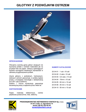 GILOTYNY Z PODWÓJNYM OSTRZEM WPROWADZENIE Oferujemy szeroką gamę gilotyn służących do wycinania próbek z cienkich materiałów jak na przykład folie lub papier. Gilotyny spełniających wysokie wymagania światowych standardów w zakresie przygotowywania próbek. NUMERY KATALOGOWE 22-34-01 - 1 cal x 10 cali 22-34-02 - 2 cale x 10 cali Użycie gilotyny z podwójnym, hartowanym, stalowym ostrzem gwarantuje, iż próbka będzie prosta, a krawędzie równoległe z dokładnością do 0.001 cala (0,025mm). Solidna i mocna konstrukcja gwarantuje bezawaryjną pracę urządzenia przez wiele lat. ZASTOSOWANIE 22-34-03 - 0,5 cala x 10 cali 22-34-04 - 15mm x 10 cali 22-34-05 - 63 mm x 10 cali 22-34-06 - 25 mm x 10 cali 22-34-10 - 50 mm x 10 cali Papier, materiały włókiennicze, cienkie plastikowe powierzchnie, folie, włókniny. PRZEDSIĘBIORSTWO INŻYNIERSKIE KONTECH Sp. z o.o. 91-071 Łódź, ul. Ogrodowa 74 tel/fax (48-42) 253-45-44 [email protected]