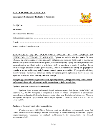 KARTA ZGŁOSZENIA DZIECKA na zajęcia w Sali Zabaw Radocha