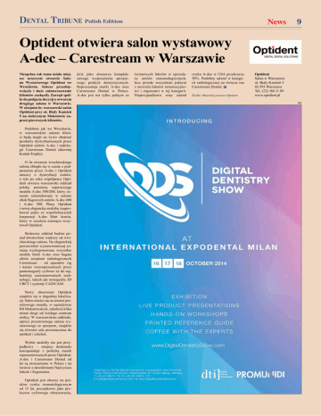 DENTAL TRIBUNE Polish Edition News 9 Optident otwiera salon wystawowy A-dec – Carestream w Warszawie Niespełna rok temu miało miejsce uroczyste otwarcie Salonu Wystawowego Optident we Wrocławiu. Sukces przedsięwzięcia i duże zainteresowanie klientów zachęciły Zarząd spółki do podjęcia decyzji o otwarciu drugiego salonu w Warszawie. W sierpniu br. warszawski salon Optident przy ul. Biały Kamień 5 na stołecznym Mokotowie zaprosi pierwszych klientów. Podobnie jak we Wrocławiu, w warszawskim salonie klienci będą mogli na żywo obejrzeć produkty dystrybuowanych przez Optident unitów A-dec i radiologii Carestream Dental (dawniej Kodak-Trophy). O ile otwarcie wrocławskiego salonu zbiegło się w czasie z podpisaniem przez A-dec i Optident umowy o dystrybucji unitów, o tyle po roku współpracy Optident otwiera warszawski oddział polską premierą najnowszego modelu A-dec 300/200, który zostanie zainstalowany w salonie obok lagowych unitów A-dec 400 i A-dec 500. Plany Optident i nową elegancką siedzibę zaaprobował jeden ze współwłaścicieli korporacji A-dec Matt Austin, który w zeszłym miesiącu wizytował Optident. Stołeczny oddział będzie ponad dwukrotnie większy od wrocławskiego salonu. Na eleganckiej powierzchni wystawienniczej zostaną wyeksponowane wszystkie modele foteli A-dec oraz bogata oferta urządzeń radiologicznych Carestream – od aparatów rtg i kamer wewnątrzustnych przez pantomografy cyfrowe aż do najbardziej zaawansowanych technologii, takich jak tomograia 3D CBCT i systemy CAD/CAM. Nowy showroom Optident znajdzie się w dogodnej lokalizacji. Salon mieści się na terenie prestiżowego osiedla, w sąsiedztwie Pól Mokotowskich, zaledwie klika minut drogi od ścisłego centrum stolicy. W warszawskim oddziale, oprócz przestronnego salonu wystawowego ze sprzętem, znajdzie się również sala przeznaczona do spotkań i szkoleń. Wybór siedziby nie jest przypadkowy – miejsce doskonale koresponduje z polityką marek reprezentowanych przez Optident: A-dec i Carestream Dental od lat są utożsamiane w Polsce i na świecie z określeniami Najwyższa Jakość i Ergonomia. Optident jest obecny na polskim rynku stomatologicznym od 15 lat, początkowo jako prekursor cyfrowego obrazowania, dziś jako dostawca kompleksowego wyposażenia sprzętowego praktyk dentystycznych. Reprezentuje marki A-dec oraz Carestream Dental w Polsce. A-dec jest nie tylko jednym ze światowych liderów w sprzedaży unitów stomatologicznych, lecz przede wszystkim jednym z niewielu liderów innowacyjności i ergonomii w tej kategorii. Nieprzypadkowo więc udział rynku A-dec w USA przekracza 50%. Podobny udział w kategorii radiologicznej na świecie ma Carestream Dental. DT Źródło: Materiały prasowe Optident Optident Salon w Warszawie ul. Biały Kamień 5 02-593 Warszawa Tel.: (22) 188 11 89 www.optident.pl AD