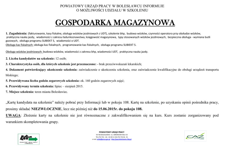 POWIATOWY URZĄD PRACY W BOLESŁAWCU INFORMUJE O MOŻLIWOŚCI UDZIAŁU W SZKOLENIU GOSPODARKA MAGAZYNOWA 1. Zagadnienia: (fakturowanie, kasy fiskalne, obsługa wózków jezdniowych z UDT), szkolenie bhp, budowa wózków, czynności operatora przy obsłudze wózków, praktyczna nauka jazdy, wiadomości z zakresu ładunkoznawstwa, księgowość magazynowa, typy stosowanych wózków jezdniowych, bezpieczna obsługa - wymiana butli gazowych, obsługa programu SUBIEKT 5, wiadomości o UDT. Obsługa kas fiskalnych: obsługa kas fiskalnych, programowanie kas fiskalnych, obsługa programu SUBIEKT 5. Obsługa wózków jezdniowych: budowa wózków, wiadomości z zakresu bhp, wiadomości UDT, praktyczna nauka jazdy. 2. Liczba kandydatów na szkolenie: 12 osób; 3. Charakterystyka osób, dla których szkolenie jest przeznaczone: - brak przeciwwskazań lekarskich; 4. Dokument potwierdzający ukończenie szkolenia: zaświadczenie o ukończeniu szkolenia, oraz zaświadczenie kwalifikacyjne do obsługi urządzeń transportu bliskiego; 5. Przewidywana liczba godzin zegarowych szkolenia: ok. 160 godzin zegarowych zajęć; 6. Przewidywany termin szkolenia: lipiec – sierpień 2015. 7. Miejsce szkolenia: teren miasta Bolesławiec. „Kartę kandydata na szkolenie” należy pobrać przy Informacji lub w pokoju 108. Kartę na szkolenie, po uzyskaniu opinii pośrednika pracy, prosimy składać NIEZWŁOCZNIE, lecz nie później niż do 15.06.2015r. do pokoju 108. UWAGA: Złożenie karty na szkolenie nie jest równoznaczne z zakwalifikowaniem się na kurs. Kurs zostanie zorganizowany pod warunkiem skompletowania grupy. POWIATOWY URZĄD PRACY 59-700 BOLESŁAWIEC UL. OBROŃCÓW HELU 10 TEL (75) 732 – 66 – 01 DO 4; FAX (75) 732 66 - 01 e-mail: [email protected] http://pup.boleslawiec.ibip.pl
