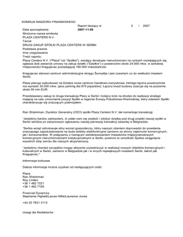 KOMISJA NADZORU FINANSOWEGO Raport bie¿¹cy nr 2007-11-09 5 / 2007 Data sporz¹dzenia: Skrócona nazwa emitenta PLAZA CENTERS N.V. Temat DRUGI ZAKUP SPÓ£KI PLAZA CENTERS W SERBII Podstawa prawna Inne uregulowania Treœã raportu: Plaza Centers N.V. (“Plaza" lub “Spóùka"), wiod¹cy developer nieruchomoœci na rynkach rozwijaj¹cych siê, ogùasza dziœ zawarcie umowy na zakup dziaùki (“Dziaùka") o powierzchni okoùo 24.000 mkw. w serbskiej miejscowoœci Kragujevac posiadaj¹cej 180.000 mieszkañców. Kragujevac stanowi centrum administracyjne okrêgu Šumadija i jest czwartym co do wielkoœci miastem Serbii. Plaza planuje wybudowaã na Dziaùce nowe centrum handlowo-rozrywkowe, którego ù¹czna powierzchnia ma wynieœã 35.000 mkw. (plus parking dla 875 pojazdów). £¹czny koszt budowy szacuje siê na poziomie okoùo 55 mln EUR. Przedstawiany zakup to druga transakcja Plazy w Serbii i kolejny krok na drodze do realizacji strategii maj¹cej na celu umocnienie pozycji Spóùki w regionie Europy Poùudniowo-Wschodniej, który zdaniem Spóùki charakteryzuje siê znacz¹cym potencjaùem. Ran Shtarkman, Dyrektor Generalny (CEO) spóùki Plaza Centers N.V. tak komentuje transakcjê: “Jesteœmy bardzo zadowoleni, i¿ udaùo nam siê znaleêã i zdobyã dziaùkê pod drugi projekt naszej spóùki w Serbii wkrótce po sierpniowym ogùoszeniu naszej pierwszej transakcji zawartej w Belgradzie. “Serbia wci¹¿ odnotowuje silny wzrost gospodarczy, który naszym zdaniem doprowadzi do powstania znacz¹cego zapotrzebowania na du¿e obiekty wielofunkcyjne zarówno ze strony najemców komercyjnych, jak i konsumentów. W poù¹czeniu z rosn¹cym zainteresowaniem inwestorów miêdzynarodowych komercyjnymi nieruchomoœciami instytucjonalnymi w Serbii, powinno to umo¿liwiã Spóùce osi¹gniêcie wysokich stóp zwrotu dla naszych akcjonariuszy. “Jesteœmy równie¿ szczêœliwi mog¹c aktywnie uczestniczyã w realizacji nowych obiektów komercyjnych i kulturalnych w Serbii, zarówno w Belgradzie jak i w innych najwiêkszych miastach Serbii, takich jak Kragujevac." Informacje koñcowe Dalsze informacje mo¿na uzyskaã od nastêpuj¹cych osób: Plaza Ran Shtarkman Roy Linden +36 1 462 7221 +36 1 462 7105 Financial Dynamics Stephanie Highett/Lauren Mills/Laurence Jones +44 20 7831 3113 Uwagi dla Redaktorów Plaza Centers N.V. (www.plazacenters.com) jest wiod¹cym developerem centrów handlowo-rozrywkowych na rynkach rozwijaj¹cych siê. Spóùka koncentruje siê na budowie nowych centrów oraz – w przypadku stwierdzenia znacz¹cego potencjaùu wynikaj¹cego z przebudowy – dokonuje przebudowy istniej¹cych centrów zarówno w stolicach, jak i w du¿ych oœrodkach regionalnych. Spóùka notowana jest na Tablicy Gùównej Londyñskiej Gieùdy Papierów Wartoœciowych oraz od 19 paêdziernika 2007 na Warszawskiej Gieùdzie Papierów Wartoœciowych (LSE : PLAZ, WSE: PLZ/PLAZACNTR). Plaza Centers N.V. jest poœredni¹ wùasnoœci¹ Elbit Medical Imaging Ltd. (“EMIL"), izraelskiej spóùki publicznej, której akcje notowane s¹ na Gieùdzie Papierów Wartoœciowych w Tel Awiwie (Izrael) i na NASDAQ Global Market w USA. Plaza Centers nale¿y do grupy spóùek Europe Izrael, kontrolowanej przez zaùo¿yciela, pana Mordechaja Zissera. Od ponad 11 lat Spóùka realizuje budowê nieruchomoœci na rynkach rozwijaj¹cych siê. Plaza w Serbii W sierpniu 2007 spóùka Plaza podaùa do publicznej wiadomoœci informacjê dotycz¹c¹ wygrania ogùoszonego przez Rz¹d Serbii przetargu na budowê nowego centrum handlowo-rozrywkowo-biznesowego o ù¹cznej powierzchni okoùo 100.000 mkw. (posiadaj¹cego parking dla ponad 2.000 pojazdów) w serbskim Belgradzie. Nowy kompleks stanie na le¿¹cej w eksponowanym miejscu lokalizacji dawnego Federalnego Ministerstwa Spraw Wewnêtrznych, na dziaùce przy gùównej ulicy przebiegaj¹cej przez centrum Belgradu. W dzielnicy tej mieszcz¹ siê ambasady, m.in. USA, Kanady, Niemiec i Polski. W pobli¿u znajduje siê tak¿e Ministerstwo Finansów Rz¹du Serbii, Belgradzka Izba Handlowa oraz najwiêkszy publiczny szpital w Belgradzie, jak równie¿ targowisko miejskie; w przyszùoœci stanie tam planowany dworzec kolejowy. W omawianym projekcie Plaza bêdzie wspóùpracowaã z lokalnym developerem serbskim. Przewidywany bud¿et brutto przeznaczony na realizacjê projektu ma wynieœã 150 mln EUR. Partner lokalny bêdzie mógù uczestniczyã w projekcie na poziomie do 15% pod warunkiem speùnienia pewnych warunków, lecz zarz¹dzanie projektem bêdzie realizowane wyù¹cznie przez spóùkê Plaza. Podstawa prawna: par. 36 rozporz¹dzenia z Ministra Finansów z dnia 19 paêdziernika 2005 r. w sprawie informacji bie¿¹cych i okresowych przekazywanych przez emitentów papierów wartoœciowych 9 November 2007 PLAZA CENTERS MAKES SECOND ACQUISITION IN SERBIA Plaza Centers N.V. (“Plaza” or the “Company”), a leading emerging markets property developer, today announces that it has entered into an agreement to secure a circa 24,000 sqm plot in Kragujevac (the “Site”), a city of 180,000 inhabitants, in Serbia. Kragujevac is the administrative centre of the Šumadija district and the fourth largest city in Serbia. Plaza plans to build a new shopping and entertainment centre on the Site, with a total built area of 35,000 sqm, plus 875 parking spaces. The total cost of the development is anticipated to be approximately €55 million. The acquisition represents Plaza’s second transaction in Serbia and a further step in its strategy to consolidate its position in the region of South Eastern Europe which it considers to offer strong potential. Commenting on the acquisition, Ran Shtarkman, CEO, Plaza Centers N.V. said: “We are delighted to have been able to identify and secure a second development project in Serbia so soon after our first transaction in Belgrade was announced in August. “Serbia is poised to experience strong economic growth which, we believe, will generat