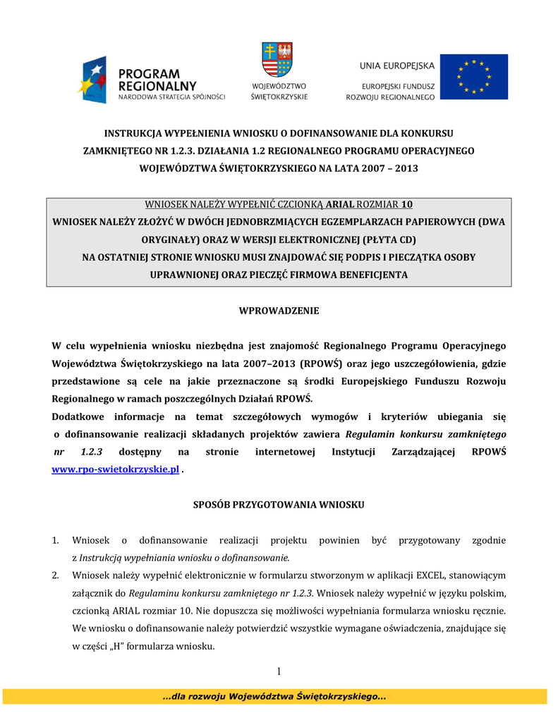 INSTRUKCJA WYPEŁNIENIA WNIOSKU O DOFINANSOWANIE DLA KONKURSU ZAMKNIĘTEGO NR 1.2.3. DZIAŁANIA 1.2 REGIONALNEGO PROGRAMU OPERACYJNEGO WOJEWÓDZTWA ŚWIĘTOKRZYSKIEGO NA LATA 2007 – 2013 WNIOSEK NALEŻY WYPEŁNIĆ CZCIONKĄ ARIAL ROZMIAR 10 WNIOSEK NALEŻY ZŁOŻYĆ W DWÓCH JEDNOBRZMIĄCYCH EGZEMPLARZACH PAPIEROWYCH (DWA ORYGINAŁY) ORAZ W WERSJI ELEKTRONICZNEJ (PŁYTA CD) NA OSTATNIEJ STRONIE WNIOSKU MUSI ZNAJDOWAĆ SIĘ PODPIS I PIECZĄTKA OSOBY UPRAWNIONEJ ORAZ PIECZĘĆ FIRMOWA BENEFICJENTA WPROWADZENIE W celu wypełnienia wniosku niezbędna jest znajomość Regionalnego Programu Operacyjnego Województwa Świętokrzyskiego na lata 2007–2013 (RPOWŚ) oraz jego uszczegółowienia, gdzie przedstawione są cele na jakie przeznaczone są środki Europejskiego Funduszu Rozwoju Regionalnego w ramach poszczególnych Działań RPOWŚ. Dodatkowe informacje na temat szczegółowych wymogów i kryteriów ubiegania się o dofinansowanie realizacji składanych projektów zawiera Regulamin konkursu zamkniętego nr 1.2.3 dostępny na stronie internetowej Instytucji Zarządzającej RPOWŚ www.rpo-swietokrzyskie.pl . SPOSÓB PRZYGOTOWANIA WNIOSKU 1. Wniosek o dofinansowanie realizacji projektu powinien być przygotowany zgodnie z Instrukcją wypełniania wniosku o dofinansowanie. 2. Wniosek należy wypełnić elektronicznie w formularzu stworzonym w aplikacji EXCEL, stanowiącym załącznik do Regulaminu konkursu zamkniętego nr 1.2.3. Wniosek należy wypełnić w języku polskim, czcionką ARIAL rozmiar 10. Nie dopuszcza się możliwości wypełniania formularza wniosku ręcznie. We wniosku o dofinansowanie należy potwierdzić wszystkie wymagane oświadczenia, znajdujące się w części „H” formularza wniosku. 1 …dla rozwoju Województwa Świętokrzyskiego... 3. Wersja papierowa wniosku musi być tożsama z wersją elektroniczną. 4. Po wypełnieniu, wniosek należy wydrukować dwukrotnie używając opcji „Drukuj/cały skoroszyt”. Tylko taki sposób drukowania pozwoli na uzyskanie prawidłowej numeracji stron. 5. Następnie każdy egzemplarz wniosku o dofinansowanie należy podpisać na ostatniej stronie (czytelny podpis lub parafa z pieczątką imienną) przez osobę/osoby upoważnione do reprezentowania Beneficjenta, wskazane w dokumencie rejestrowym oraz należy również umieścić pieczęć firmową Beneficjenta. 6. Do każdego egzemplarza wniosku o dofinansowanie należy dołączyć jednakowy komplet załączników. 7. Każdy załącznik powinien być oddzielony kartą informacyjną, której wzór stanowi załącznik do Regulaminu konkursu zamkniętego nr 1.2.3. 8. W przypadku załączników, stanowiących integralną część dokumentacji do wniosku o dofinansowanie, koniecznym jest zamieszczenie na pierwszej stronie dokumentu czytelnego podpisu i pieczęci firmowej Beneficjenta oraz ilości stron załącznika, w przypadku załącznika wielostronicowego. 9. Płytę z zapisaną elektroniczną wersją wniosku należy opisać podając tytuł projektu oraz nazwę Beneficjenta. 10. Formularz wniosku o dofinansowanie, załączniki oraz płyta CD/DVD muszą być umieszczone w sposób trwale spięty, umożliwiający jednocześnie swobodny dostęp do dokumentów i nie powodujący ich zniszczenia. 11. W przypadku dodatkowych dokumentów – poza wskazanymi we wniosku o dofinansowanie – należy je wymienić w części H. Dodatkowe załączniki i dołączyć na końcu dokumentacji nadając numerację zgodną z kolejnością wpisanych załączników. 12. Informacje zawarte we wniosku o dofinansowanie muszą być spójne z danymi zamieszczonymi w Biznes Planie, oraz w pozostałych załącznikach, np. w zakresie zgodności kwot, wartości wskaźników itp. 2 …dla rozwoju Województwa Świętokrzyskiego... WYPEŁNIANIE WNIOSKU UWAGA: ZABRANIA SIĘ ZMIANY FORMUŁ, KTÓRE ZNAJDUJĄ SIĘ W FORMULARZU EXCEL WNIOSKU O DOFINANSOWANIE. ZMIANA FORMUŁ BĘDZIE POWODOWAĆ „DEZAKTYWACJĘ” POWIĄZANYCH ZE SOBĄ PÓL W RAMACH WNIOSKU APLIKACYJNEGO. W PRZYPADKU KONIECZNOŚCI DODANIA DODATKOWYCH PÓL W KILKU PUNKTACH, NALEŻY JE DODAWAĆ „OD KOŃCA” BIEŻĄCEGO ARKUSZA Symbole/Oznaczenia: ▼ symbol oznacza „listę rozwijaną” tzn. wybór spośród określonej liczby danych. symbol oznacza możliwość „dodawania” kolejnych pól w ramach danego punktu wniosku. + - symbol oznacza możliwość „dodawania” kolejnych pól w ramach danego punktu wniosku. - zaznaczenie opcji będzie powodować „dezaktywację” powiązanych ze sobą pól w ramach wniosku aplikacyjnego. Część A. Pola dotyczące Daty wpłynięcia wniosku oraz Numeru wniosku wypełnia Instytucja Zarządzająca Regionalnym Programem Operacyjnym Województwa Świętokrzyskiego na lata 2007-2013 (IZ RPOWŚ). Beneficjent wpisuje Tytuł projektu, który powinien stanowić krótką (do 200 znaków uwzględniając spacje), jednoznaczną nazwę, tak aby w sposób jasny identyfikował projekt. Jeżeli realizowany projekt jest częścią większej inwestycji wówczas nazwa projektu powinna zawierać przedmiot, lokalizację, etap lub fazę realizacji zadania. Część B. Pola nieaktywne dla Beneficjenta zawierające sztywne zapisy: ― nazwę i kod programu operacyjnego: Regionalny Program Operacyjny Rozwoju Regionalnego na lata 2007-2013; RPSW.00.00.00; ― numer, nazwę i kod osi priorytetowej: Oś priorytetowa 1. Rozwój przedsiębiorczości; RPSW.01.00.00; ― numer, nazwę i kod działania w ramach RPOWŚ – 1.2. Tworzenie i rozwój powiązań kooperacyjnych 3 …dla rozwoju Województwa Świętokrzyskiego... przedsiębiorstw; RPSW.01.02.00. Część C. C1. Beneficjent Należy wypełnić wszystkie rubryki. Wpisane w polach dane powinny być aktualne i zgodne z dokumentami rejestrowymi Beneficjenta. Beneficjent uzupełnia następujące rubryki: 1. Nazwa Beneficjenta (należy uwzględnić również wielkość liter, cudzysłowy, myślniki i skróty, zgodnie z zapisami w dokumencie rejestrowym). W przypadku osób fizycznych pro
