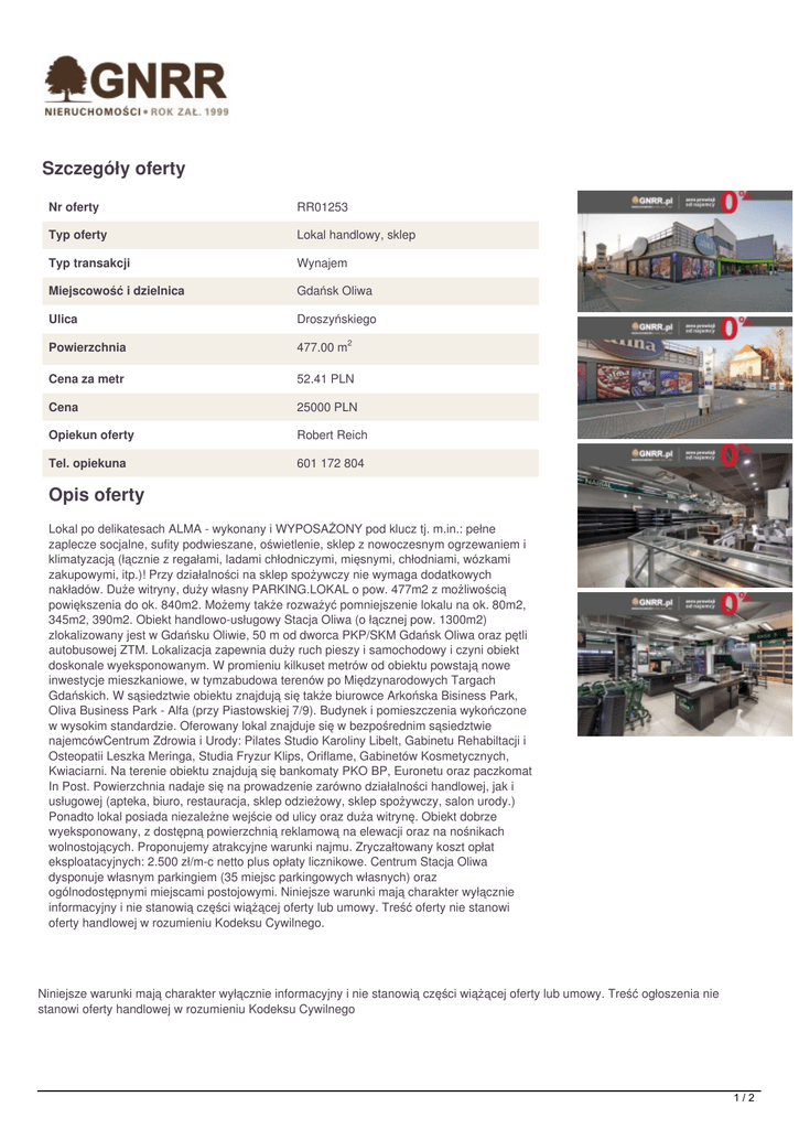Szczegóły oferty Nr oferty RR01253 Typ oferty Lokal handlowy, sklep Typ transakcji Wynajem Miejscowość i dzielnica Gdańsk Oliwa Ulica Droszyńskiego Powierzchnia 477.00 m2 Cena za metr 52.41 PLN Cena 25000 PLN Opiekun oferty Robert Reich Tel. opiekuna 601 172 804 Opis oferty Lokal po delikatesach ALMA - wykonany i WYPOSAŻONY pod klucz tj. m.in.: pełne zaplecze socjalne, sufity podwieszane, oświetlenie, sklep z nowoczesnym ogrzewaniem i klimatyzacją (łącznie z regałami, ladami chłodniczymi, mięsnymi, chłodniami, wózkami zakupowymi, itp.)! Przy działalności na sklep spożywczy nie wymaga dodatkowych nakładów. Duże witryny, duży własny PARKING.LOKAL o pow. 477m2 z możliwością powiększenia do ok. 840m2. Możemy także rozważyć pomniejszenie lokalu na ok. 80m2, 345m2, 390m2. Obiekt handlowo-usługowy Stacja Oliwa (o łącznej pow. 1300m2) zlokalizowany jest w Gdańsku Oliwie, 50 m od dworca PKP/SKM Gdańsk Oliwa oraz pętli autobusowej ZTM. Lokalizacja zapewnia duży ruch pieszy i samochodowy i czyni obiekt doskonale wyeksponowanym. W promieniu kilkuset metrów od obiektu powstają nowe inwestycje mieszkaniowe, w tymzabudowa terenów po Międzynarodowych Targach Gdańskich. W sąsiedztwie obiektu znajdują się także biurowce Arkońska Bisiness Park, Oliva Business Park - Alfa (przy Piastowskiej 7/9). Budynek i pomieszczenia wykończone w wysokim standardzie. Oferowany lokal znajduje się w bezpośrednim sąsiedztwie najemcówCentrum Zdrowia i Urody: Pilates Studio Karoliny Libelt, Gabinetu Rehabiltacji i Osteopatii Leszka Meringa, Studia Fryzur Klips, Oriflame, Gabinetów Kosmetycznych, Kwiaciarni. Na terenie obiektu znajdują się bankomaty PKO BP, Euronetu oraz paczkomat In Post. Powierzchnia nadaje się na prowadzenie zarówno działalności handlowej, jak i usługowej (apteka, biuro, restauracja, sklep odzieżowy, sklep spożywczy, salon urody.) Ponadto lokal posiada niezależne wejście od ulicy oraz duża witrynę. Obiekt dobrze wyeksponowany, z dostępną powierzchnią reklamową na elewacji oraz na nośnikach wolnostojących. Proponujemy atrakcyjne warunki najmu. Zryczałtowany koszt opłat eksploatacyjnych: 2.500 zł/m-c netto plus opłaty licznikowe. Centrum Stacja Oliwa dysponuje własnym parkingiem (35 miejsc parkingowych własnych) oraz ogólnodostępnymi miejscami postojowymi. Niniejsze warunki mają charakter wyłącznie informacyjny i nie stanowią części wiążącej oferty lub umowy. Treść oferty nie stanowi oferty handlowej w rozumieniu Kodeksu Cywilnego. Niniejsze warunki mają charakter wyłącznie informacyjny i nie stanowią części wiążącej oferty lub umowy. Treść ogłoszenia nie stanowi oferty handlowej w rozumieniu Kodeksu Cywilnego 1/2 2/2 Powered by TCPDF (www.tcpdf.org)