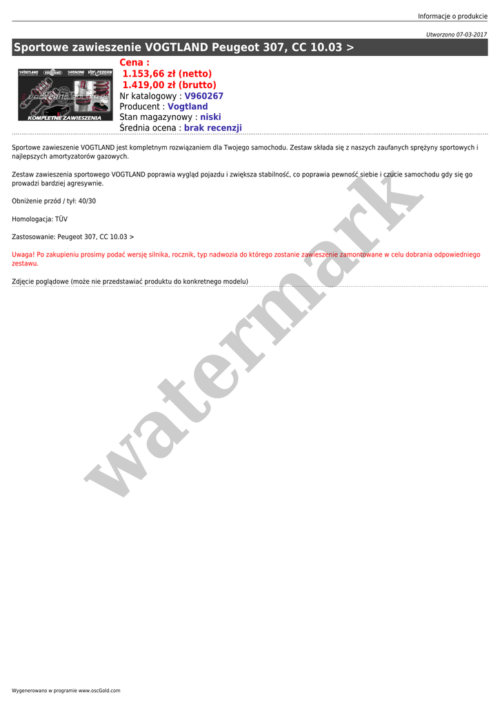 Informacje o produkcie Utworzono 07-03-2017 Sportowe zawieszenie VOGTLAND Peugeot 307, CC 10.03 > Cena : 1.153,66 zł (netto) 1.419,00 zł (brutto) Nr katalogowy : V960267 Producent : Vogtland Stan magazynowy : niski Średnia ocena : brak recenzji Sportowe zawieszenie VOGTLAND jest kompletnym rozwiązaniem dla Twojego samochodu. Zestaw składa się z naszych zaufanych sprężyny sportowych i najlepszych amortyzatorów gazowych. Obniżenie przód / tył: 40/30 Homologacja: TÜV Zastosowanie: Peugeot 307, CC 10.03 > er m ar k Zestaw zawieszenia sportowego VOGTLAND poprawia wygląd pojazdu i zwiększa stabilność, co poprawia pewność siebie i czucie samochodu gdy się go prowadzi bardziej agresywnie. Uwaga! Po zakupieniu prosimy podać wersję silnika, rocznik, typ nadwozia do którego zostanie zawieszenie zamontowane w celu dobrania odpowiedniego zestawu. w at Zdjęcie poglądowe (może nie przedstawiać produktu do konkretnego modelu) Wygenerowano w programie www.oscGold.com