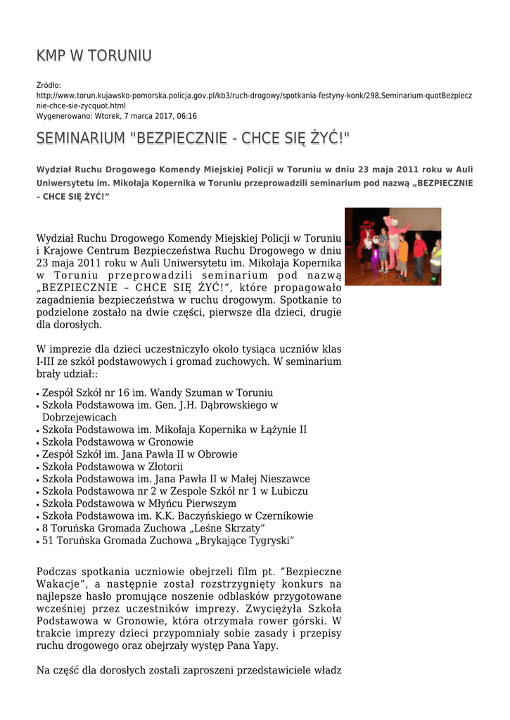 KMP W TORUNIU Źródło: http://www.torun.kujawsko-pomorska.policja.gov.pl/kb3/ruch-drogowy/spotkania-festyny-konk/298,Seminarium-quotBezpiecz nie-chce-sie-zycquot.html Wygenerowano: Wtorek, 7 marca 2017, 06:16 SEMINARIUM "BEZPIECZNIE - CHCE SIĘ ŻYĆ!" Wydział Ruchu Drogowego Komendy Miejskiej Policji w Toruniu w dniu 23 maja 2011 roku w Auli Uniwersytetu im. Mikołaja Kopernika w Toruniu przeprowadzili seminarium pod nazwą „BEZPIECZNIE – CHCE SIĘ ŻYĆ!” Wydział Ruchu Drogowego Komendy Miejskiej Policji w Toruniu i Krajowe Centrum Bezpieczeństwa Ruchu Drogowego w dniu 23 maja 2011 roku w Auli Uniwersytetu im. Mikołaja Kopernika w Toruniu przeprowadzili seminarium pod nazwą „BEZPIECZNIE – CHCE SIĘ ŻYĆ!”, które propagowało zagadnienia bezpieczeństwa w ruchu drogowym. Spotkanie to podzielone zostało na dwie części, pierwsze dla dzieci, drugie dla dorosłych. W imprezie dla dzieci uczestniczyło około tysiąca uczniów klas I-III ze szkół podstawowych i gromad zuchowych. W seminarium brały udział:: ● ● ● ● ● ● ● ● ● ● ● ● Zespół Szkół nr 16 im. Wandy Szuman w Toruniu Szkoła Podstawowa im. Gen. J.H. Dąbrowskiego w Dobrzejewicach Szkoła Podstawowa im. Mikołaja Kopernika w Łążynie II Szkoła Podstawowa w Gronowie Zespół Szkół im. Jana Pawła II w Obrowie Szkoła Podstawowa w Złotorii Szkoła Podstawowa im. Jana Pawła II w Małej Nieszawce Szkoła Podstawowa nr 2 w Zespole Szkół nr 1 w Lubiczu Szkoła Podstawowa w Młyńcu Pierwszym Szkoła Podstawowa im. K.K. Baczyńskiego w Czernikowie 8 Toruńska Gromada Zuchowa „Leśne Skrzaty” 51 Toruńska Gromada Zuchowa „Brykające Tygryski” Podczas spotkania uczniowie obejrzeli film pt. ”Bezpieczne Wakacje”, a następnie został rozstrzygnięty konkurs na najlepsze hasło promujące noszenie odblasków przygotowane wcześniej przez uczestników imprezy. Zwyciężyła Szkoła Podstawowa w Gronowie, która otrzymała rower górski. W trakcie imprezy dzieci przypomniały sobie zasady i przepisy ruchu drogowego oraz obejrzały występ Pana Yapy. Na część dla dorosłych zostali zaproszeni przedstawiciele władz miasta Torunia, gmin powiatu toruńskiego, urzędów oraz społeczność lokalna Torunia. W tym roku sympozjum poświęcone było niechronionym uczestnikom ruchu drogowego. Spotkanie uatrakcyjnił występ „Kabaretu Pod Wyrwigroszem”. Autor: Publikacja: Ocena: 0/5 (0) Tweetnij