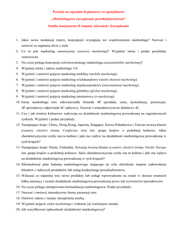 Pytania na egzamin dyplomowy ze specjalności „Marketingowe zarządzanie przedsiębiorstwem” Studia stacjonarne II stopnia, kierunek: Zarządzanie 1. Jakie nowe tendencje (nurty, koncepcje) występują we współczesnym marketingu? Nazwać i omówić co najmniej dwie z nich. 2. Co to jest marketing sensoryczny (sensory marketing)? Wyjaśnić istotę i podać przykłady zastosowań. 3. Na czym polega koncepcja zrównoważonego marketingu (sustainability marketing)? 4. Wyjaśnij istotę i zakres marketingu 3.0. 5. Wyjaśnić i omówić pojęcie marketing mobilny (mobile marketing). 6. Wyjaśnić i omówić pojęcie marketing wielokanałowy (multi-channel marketing). 7. Wyjaśnić i omówić pojęcie marketing międzynarodowy (international marketing). 8. Wyjaśnić i omówić pojęcie marketing globalny (global marketing). 9. Wyjaśnić i omówić pojęcie marketing internetowy (e-marketing). 10. Istotę marketingu mix odzwierciedla formuła 4P (produkt, cena, dystrybucja, promocja). 4P sprzedawcy odpowiada 4C nabywcy. Nazwać i scharakteryzować składowe 4C. 11. Czy i jak różnice kulturowe wpływają na działalność marketingową prowadzoną na zagranicznych rynkach. Wyjaśnić i podać przykłady. 12. Następujące kraje: Chiny, Hong Kong, Japonia, Singapur, Korea Południowa i Taiwan tworzą klaster (country cluster) zwany Confucian Asia tzn. grupę krajów o podobnej kulturze. Jakie charakterystyczne cechy ma ta kultura i jaki ma wpływ na działalność marketingową prowadzoną w tych krajach? 13. Następujące kraje: Dania, Finlandia, Szwecja tworzą klaster (country cluster) zwany Nordic Europe tzn. grupę krajów o podobnej kulturze. Jakie charakterystyczne cechy ma ta kultura i jaki ma wpływ na działalność marketingową prowadzoną w tych krajach? 14. Sformułować plan badania marketingowego mającego na celu określenie stopnia zadowolenia klientów z nabytych produktów lub usług konkretnego przedsiębiorstwa. 15. Wskazać co najmniej trzy nowe produkty lub usługi wprowadzone na rynek w okresie ostatnich kilku miesięcy i ocenić działalność marketingową prowadzoną przez ich wytwórców/sprzedawców. 16. Na czym polega zintegrowana komunikacja marketingowa. Podać przykłady. 17. Nazwać i omówić interaktywne formy promocji mix. 18. Omówić zakres i zasady zarządzania marką. 19. Wyjaśnić pojęcie etyka marketingu i wskazać jej ważniejsze zasady. 20. Jak weryfikować opłacalność działalności marketingowej?