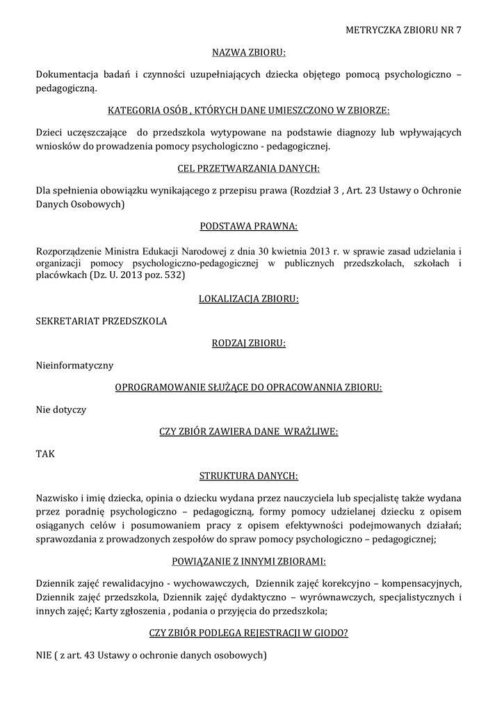 METRYCZKA ZBIORU NR 7 NAZWA ZBIORU: Dokumentacja badań i czynności uzupełniających dziecka objętego pomocą psychologiczno – pedagogiczną. KATEGORIA OSÓB , KTÓRYCH DANE UMIESZCZONO W ZBIORZE: Dzieci uczęszczające do przedszkola wytypowane na podstawie diagnozy lub wpływających wniosków do prowadzenia pomocy psychologiczno - pedagogicznej. CEL PRZETWARZANIA DANYCH: Dla spełnienia obowiązku wynikającego z przepisu prawa (Rozdział 3 , Art. 23 Ustawy o Ochronie Danych Osobowych) PODSTAWA PRAWNA: Rozporządzenie Ministra Edukacji Narodowej z dnia 30 kwietnia 2013 r. w sprawie zasad udzielania i organizacji pomocy psychologiczno-pedagogicznej w publicznych przedszkolach, szkołach i placówkach (Dz. U. 2013 poz. 532) LOKALIZACJA ZBIORU: SEKRETARIAT PRZEDSZKOLA RODZAJ ZBIORU: Nieinformatyczny OPROGRAMOWANIE SŁUŻĄCE DO OPRACOWANNIA ZBIORU: Nie dotyczy CZY ZBIÓR ZAWIERA DANE WRAŻLIWE: TAK STRUKTURA DANYCH: Nazwisko i imię dziecka, opinia o dziecku wydana przez nauczyciela lub specjalistę także wydana przez poradnię psychologiczno – pedagogiczną, formy pomocy udzielanej dziecku z opisem osiąganych celów i posumowaniem pracy z opisem efektywności podejmowanych działań; sprawozdania z prowadzonych zespołów do spraw pomocy psychologiczno – pedagogicznej; POWIĄZANIE Z INNYMI ZBIORAMI: Dziennik zajęć rewalidacyjno - wychowawczych, Dziennik zajęć korekcyjno – kompensacyjnych, Dziennik zajęć przedszkola, Dziennik zajęć dydaktyczno – wyrównawczych, specjalistycznych i innych zajęć; Karty zgłoszenia , podania o przyjęcia do przedszkola; CZY ZBIÓR PODLEGA REJESTRACJI W GIODO? NIE ( z art. 43 Ustawy o ochronie danych osobowych)