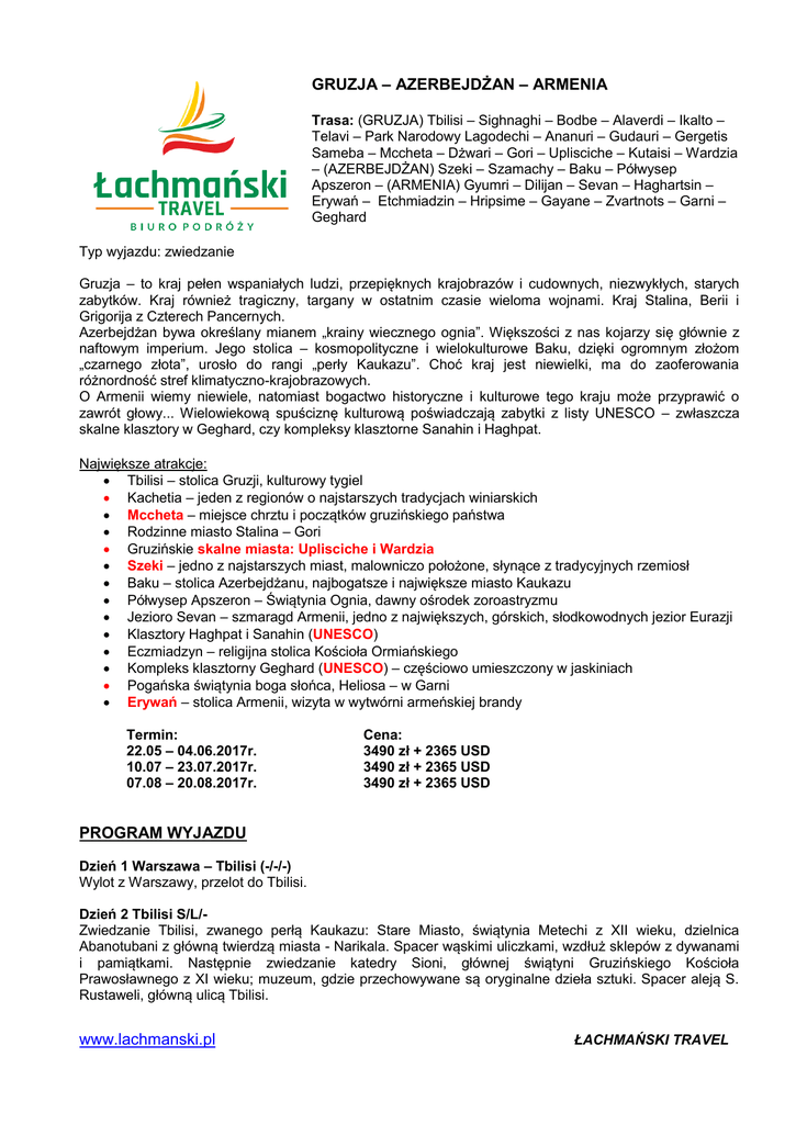 GRUZJA – AZERBEJDŻAN – ARMENIA Trasa: (GRUZJA) Tbilisi – Sighnaghi – Bodbe – Alaverdi – Ikalto – Telavi – Park Narodowy Lagodechi – Ananuri – Gudauri – Gergetis Sameba – Mccheta – Dżwari – Gori – Uplisciche – Kutaisi – Wardzia – (AZERBEJDŻAN) Szeki – Szamachy – Baku – Półwysep Apszeron – (ARMENIA) Gyumri – Dilijan – Sevan – Haghartsin – Erywań – Etchmiadzin – Hripsime – Gayane – Zvartnots – Garni – Geghard Typ wyjazdu: zwiedzanie Gruzja – to kraj pełen wspaniałych ludzi, przepięknych krajobrazów i cudownych, niezwykłych, starych zabytków. Kraj również tragiczny, targany w ostatnim czasie wieloma wojnami. Kraj Stalina, Berii i Grigorija z Czterech Pancernych. Azerbejdżan bywa określany mianem „krainy wiecznego ognia”. Większości z nas kojarzy się głównie z naftowym imperium. Jego stolica – kosmopolityczne i wielokulturowe Baku, dzięki ogromnym złożom „czarnego złota”, urosło do rangi „perły Kaukazu”. Choć kraj jest niewielki, ma do zaoferowania różnordność stref klimatyczno-krajobrazowych. O Armenii wiemy niewiele, natomiast bogactwo historyczne i kulturowe tego kraju może przyprawić o zawrót głowy... Wielowiekową spuściznę kulturową poświadczają zabytki z listy UNESCO – zwłaszcza skalne klasztory w Geghard, czy kompleksy klasztorne Sanahin i Haghpat. Największe atrakcje: Tbilisi – stolica Gruzji, kulturowy tygiel Kachetia – jeden z regionów o najstarszych tradycjach winiarskich Mccheta – miejsce chrztu i początków gruzińskiego państwa Rodzinne miasto Stalina – Gori Gruzińskie skalne miasta: Uplisciche i Wardzia Szeki – jedno z najstarszych miast, malowniczo położone, słynące z tradycyjnych rzemiosł Baku – stolica Azerbejdżanu, najbogatsze i największe miasto Kaukazu Półwysep Apszeron – Świątynia Ognia, dawny ośrodek zoroastryzmu Jezioro Sevan – szmaragd Armenii, jedno z największych, górskich, słodkowodnych jezior Eurazji Klasztory Haghpat i Sanahin (UNESCO) Eczmiadzyn – religijna stolica Kościoła Ormiańskiego Kompleks klasztorny Geghard (UNESCO) – częściowo umieszczony w jaskiniach Pogańska świątynia boga słońca, Heliosa – w Garni Erywań – stolica Armenii, wizyta w wytwórni armeńskiej brandy Termin: 22.05 – 04.06.2017r. 10.07 – 23.07.2017r. 07.08 – 20.08.2017r. Cena: 3490 zł + 2365 USD 3490 zł + 2365 USD 3490 zł + 2365 USD PROGRAM WYJAZDU Dzień 1 Warszawa – Tbilisi (-/-/-) Wylot z Warszawy, przelot do Tbilisi. Dzień 2 Tbilisi S/L/Zwiedzanie Tbilisi, zwanego perłą Kaukazu: Stare Miasto, świątynia Metechi z XII wieku, dzielnica Abanotubani z główną twierdzą miasta - Narikala. Spacer wąskimi uliczkami, wzdłuż sklepów z dywanami i pamiątkami. Następnie zwiedzanie katedry Sioni, głównej świątyni Gruzińskiego Kościoła Prawosławnego z XI wieku; muzeum, gdzie przechowywane są oryginalne dzieła sztuki. Spacer aleją S. Rustaweli, główną ulicą Tbilisi. www.lachmanski.pl ŁACHMAŃSKI TRAVEL Dzień 3 Sighnaghi – Bodbe – Alaverdi – Ikalto - Telavi S/L/Wyjazd do winnego regionu Gruzji – Kachetii. Gruzja jest jednym z krajów o najstarszych regionach winiarskich. Przyjmuje się, że łacińskie słowo vino pochodzi od gruzińskiego słowa Ghvino. Odwiedzimy Sighnaghi, przepiękne miasteczko górskie, z którego otwiera się wspaniała panorama na dolinę Alazanii oraz Kaukaz Wschodni. Zwiedzimy kościół Bodbe - miejsce pochówku św. Nino (patronki Gruzji). Następnie wizyta w kompleksie klasztornym Alaverdi (XI w.) oraz w klasztorze Ikalto. Dzień 4 Park Narodowy Lagodechi – Szeki S/-/K Przejazd wzdłuż zboczy Kaukazu Wysokiego do granicy gruzińsko-azerskiej, obok Parku Narodowego Lagodechi. Przekroczenie granicy. Przejazd do jednego z najstarszych i najbardziej malowniczo położonych miast Azerbejdżanu - Szeki. Zwiedzanie Xan Sarayi (Pałac Szekińskich Chanów) z XVIII w. Dzień 5 Szamachy – Baku S/-/K Wizyta w Szamachy, które największy rozkwit i świetność osiągnęło pod rządami Szirwanszachów, kiedy stało się stolicą Szirwanu. Zobaczymy wielki meczet Cümə z VIII w. Przejazd do Baku. Dzień 6 Baku - Półwysep Apszeron S/-/K Zwiedzanie Baku – najstarsza część miasta - Iczeri Szeher (UNESCO). Wizyta w Pałacu Szirwanszachów. Przejazd przez centrum miasta, gdzie zobaczymy Muzeum Historyczne. Zwiedzanie Świątyni Ognia Ataszgach w Surachany i zamku z 1187 r., będącego jednym z najbardziej okazałych na półwyspie w Mərdəkan. Powrót do Baku. Po kolacji transfer na dworzec kolejowy i przejazd nocnym pociągiem do Tbilisi. Dzień 7 Tbilisi – Ananuri – Gudauri S/-/K Przejazd do twierdzy Ananuri (XVI - XVII w.). Świetnie zachowany kompleks zabytków Ananuri jest wyjątkowo malowniczo położony. Znajduje się na zachodnim brzegu turkusowych wód Zbiornika Żinwalskiego (sztuczne jezioro zaporowe), w otoczeniu lesistych gór. Całość doskonale widać z Gruzińskiej Drogi Wojennej, która biegnie w pobliżu. Przejazd wzdłuż rzeki Aragavi, do miejscowości wypoczynkowej Gudauri. Dzień 8 Gudauri – Gergetis Sameba – Mccheta – Dżwari - Tbilisi S/L/K Przejazd do wioski Gergeti i dalej jeepami do XIV-wiecznego kościoła Świętej Trójcy (Gergetis Sameba). Przejazd krętymi drogami pośród lasów, gospodarstw - na spotkanie z mistyczną potęgą Kaukazu. Po wschodniej stronie kościoła Świętej Trójcy znajduje się głęboka kotlina, w której leży miasto Kazbegi. Miasto otoczone jest gigantycznymi górami z malowniczym widokiem na jedną z najwyższych gór Kazbek (5047 m n.p.m.). Zgodnie z legendą - Prometeusz był przykuty do tej góry. Przejazd do Mcchety. W dawnych wiekach Mccheta była areną najważniejszych wydarzeń w historii Gruzji i Gruzinów. Z tym miastem wiążą się początki gruzińskiego państwa. Właśnie w Mcchecie Gruzini przyjęli chrzest. Świadectwem minionych dziejów są monumentalne świątynie i