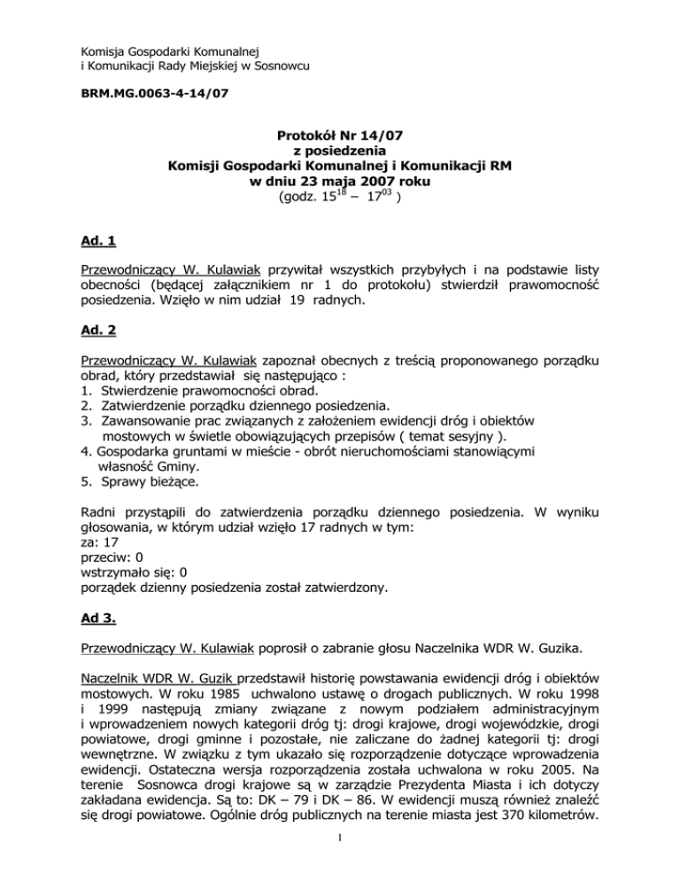 Komisja Gospodarki Komunalnej i Komunikacji Rady Miejskiej w Sosnowcu BRM.MG.0063-4-14/07 Protokół Nr 14/07 z posiedzenia Komisji Gospodarki Komunalnej i Komunikacji RM w dniu 23 maja 2007 roku (godz. 1518 – 1703 ) Ad. 1 Przewodniczący W. Kulawiak przywitał wszystkich przybyłych i na podstawie listy obecności (będącej załącznikiem nr 1 do protokołu) stwierdził prawomocność posiedzenia. Wzięło w nim udział 19 radnych. Ad. 2 Przewodniczący W. Kulawiak zapoznał obecnych z treścią proponowanego porządku obrad, który przedstawiał się następująco : 1. Stwierdzenie prawomocności obrad. 2. Zatwierdzenie porządku dziennego posiedzenia. 3. Zawansowanie prac związanych z założeniem ewidencji dróg i obiektów mostowych w świetle obowiązujących przepisów ( temat sesyjny ). 4. Gospodarka gruntami w mieście - obrót nieruchomościami stanowiącymi własność Gminy. 5. Sprawy bieżące. Radni przystąpili do zatwierdzenia porządku dziennego posiedzenia. W wyniku głosowania, w którym udział wzięło 17 radnych w tym: za: 17 przeciw: 0 wstrzymało się: 0 porządek dzienny posiedzenia został zatwierdzony. Ad 3. Przewodniczący W. Kulawiak poprosił o zabranie głosu Naczelnika WDR W. Guzika. Naczelnik WDR W. Guzik przedstawił historię powstawania ewidencji dróg i obiektów mostowych. W roku 1985 uchwalono ustawę o drogach publicznych. W roku 1998 i 1999 następują zmiany związane z nowym podziałem administracyjnym i wprowadzeniem nowych kategorii dróg tj: drogi krajowe, drogi wojewódzkie, drogi powiatowe, drogi gminne i pozostałe, nie zaliczane do żadnej kategorii tj: drogi wewnętrzne. W związku z tym ukazało się rozporządzenie dotyczące wprowadzenia ewidencji. Ostateczna wersja rozporządzenia została uchwalona w roku 2005. Na terenie Sosnowca drogi krajowe są w zarządzie Prezydenta Miasta i ich dotyczy zakładana ewidencja. Są to: DK – 79 i DK – 86. W ewidencji muszą również znaleźć się drogi powiatowe. Ogólnie dróg publicznych na terenie miasta jest 370 kilometrów. 1 Pomiary zostały przeprowadzone przez specjalny pojazd wyposażony w sześć kamer oraz GPS. Na podstawie osiągniętych wyników sporządzono mapę układu drogowego miasta w systemie GEOSECMA. Program automatycznie generuje książkę drogi i wpisuje wszystkie dane oraz pozwala na administrowanie. Wymogi stawiane przez rozporządzenie to posiadanie mapy drogowej i książki drogi. Działanie systemu zostanie zaprezentowane na sesji 24 maja. Całkowity koszt utworzenia ewidencji wyniósł ponad 250 tysięcy złoty. Zmiana dotyczy również dróg wewnętrznych. Ustawa mówi, że zarządzaniem drogami wewnętrznymi w przypadku braku zarządcy zajmuje sie właściciel gruntu, na którym droga się znajduję. Jeżeli nie zostanie ona oznakowana, to musi zostać zlikwidowana. Nie wszyscy zarządcy spełnili ten obowiązek, zwracając się z prośbą o oznakowanie dróg przez gminę. Analizując drogi publiczne, pracownicy przygotowali również materiały dotyczące dróg wewnętrznych. Przewodniczący W. Kulawiak zapytał, jak wygląda sytuacja z drogami wewnętrznymi należącymi do spółdzielni mieszkaniowych. Naczelnik WDR W. Guzik odpowiedział, że sprawa jest sporna, gdyż spółdzielnie zaczęły stosować praktykę przekazywania gruntów pod drogami wewnętrznymi gminie. Zastępca Prezydenta W. Zych dodał, że opracowywana ewidencja dróg publicznych będzie obowiązywać od 1 stycznia 2008 roku. Wejście w życie poprzedzone będzie podjęciem uchwały Rady Miejskiej i ogłoszeniem w dzienniku urzędowym Województwa Śląskiego. Ewidencją będą objęte nie tylko drogi, ale również obiekty inżynieryjne. Celem stworzenia ewidencji jest efektywne zarządzanie drogami w szczególności zajmowania pasa drogowego, rejestr wypadków, informacja dotycząca zimowego utrzymania dróg oraz bieżąca ocena stanu technicznego. Radny Z. Muszyński zapytał, czy oprogramowanie na którym została przygotowana ewidencja zostało wybrane w ramach przetargu i czy umożliwia ono naniesienie infrastruktury znajdującej się wzdłuż dróg takiej jak wodociągi i rurociągi.? Naczelnik WDR W. Guzik odpowiedział, że oprogramowanie zostało wybrane w przetargu, a problematyką infrastruktury wzdłuż dróg zajmuje się Wydział Geodezji i Kartografii, jednakże w książce drogi znajdują się dane dotyczące uzbrojenia podziemnego w danej drodze. Dane te będą sukcesywnie uzupełniane, gdyż pojazd rejestrujący dane nie jest w stanie zarejestrować obiektów podziemnych. Radny T. Bańbuła zapytał, jak wiele dróg w mieście jest zarządzanych przez inne podmioty niż gmina. Naczelnik WDR W. Guzik odpowiedział, że ulic wewnętrznych jest kilkanaście, szczególnie na osiedlu Środula. Zastępca Prezydenta W. Zych dodał, że z chwilą, gdy powstaną nowe osiedla i nowe drogi trzeba będzie wprowadzać uaktualnienia do ewidencji. Radny T. Bańbuła zapytał, czy ulice na nowo powstałym osiedlu przy ulicy Kukułek będą ewidencjonowane. 2 Naczelnik WDR W. Guzik odpowiedział, że nowe ulice, które powstały na tym osiedlu nie są na razie drogami publicznymi. Jeżeli zostaną zaliczone poprzez uchwałę do dróg publicznych, zostaną ujęte w Ewidencji. Uchwała o drogach gminnych zostanie przyjęta do końca trzeciego kwartału tego roku. Radny Z. Witkowski zapytał, jaki charakter ma droga przebiegająca przez osiedle, łącząca dwie drogi gminne. Czy jest to droga wewnętrzna czy gminna? Naczelnik WDR W. Guzik odpowiedział, aby drogę zaliczyć do odpowiedniej kategorii musi ona spełniać kryteria, kolejna sprawa to własność gruntów pod jezdnią oraz warunki techniczne. Przewodniczący W. Kulawiak pogratulował Naczelnikowi WDR W. Guzikowi i całemu wydziałowi za wykonaną pracę przy tworzeniu ewidencji drogowej. Naczelnik WDR W. Guzik dodał, że dzięki nowoczesnemu oprogramowaniu ewidencja w przyszłości będzie umieszczona w internecie. Ad. 4 R