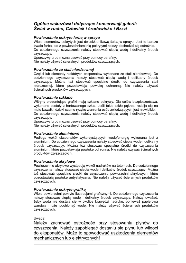 Ogólne wskazówki dotyczące konserwacji galerii: Świat w ruchu, Człowiek i środowisko i Bzzz! Powierzchnie pokryte farbą w sprayu Wiele elementów pokrytych jest dwuskładnikową farbą w sprayu. Jest to bardzo trwała farba, ale z powierzchniami nią pokrytymi naleŜy obchodzić się ostroŜnie. Do codziennego czyszczenia naleŜy stosować ciepłą wodę i delikatny środek czyszczący. Uporczywy brud moŜna usuwać przy pomocy parafiny. Nie naleŜy uŜywać ścieralnych produktów czyszczących. Powierzchnie ze stali nierdzewnej Części lub elementy niektórych eksponatów wykonano ze stali nierdzewnej. Do codziennego czyszczenia naleŜy stosować ciepłą wodę i delikatny środek czyszczący. MoŜna teŜ stosować specjalne środki do czyszczenia stali nierdzewnej, które pozostawiają powłokę ochronną. Nie naleŜy uŜywać ścieralnych produktów czyszczących. Powierzchnie szklane Witryny prezentujące grafiki mają szklane pokrywy. Dla celów bezpieczeństwa, wykonane zostały z hartowanego szkła. Jeśli takie szkło pęknie, rozbija się na małe kawałki, dzięki czemu ryzyko zranienia osób zwiedzających jest niewielkie. Do codziennego czyszczenia naleŜy stosować ciepłą wodę i delikatny środek czyszczący. Uporczywy brud moŜna usuwać przy pomocy parafiny. Nie naleŜy uŜywać ścieralnych produktów czyszczących. Powierzchnie aluminiowe Podłoga wokół eksponatów wykorzystujących wodę/energię wykonana jest z aluminium. Do codziennego czyszczenia naleŜy stosować ciepłą wodę i delikatny środek czyszczący. MoŜna teŜ stosować specjalne środki do czyszczenia aluminium, które pozostawiają powłokę ochronną. Nie naleŜy uŜywać ścieralnych produktów czyszczących. Powierzchnie akrylowe Powierzchnie akrylowe występują wokół nadruków na totemach. Do codziennego czyszczenia naleŜy stosować ciepłą wodę i delikatny środek czyszczący. MoŜna teŜ stosować specjalne środki do czyszczenia powierzchni akrylowych, które pozostawiają powłokę antystatyczną. Nie naleŜy uŜywać ścieralnych produktów czyszczących. Powierzchnie pokryte grafiką Wiele powierzchni pokryto ilustracjami graficznymi. Do codziennego czyszczenia naleŜy stosować ciepłą wodę i delikatny środek czyszczący. NaleŜy uwaŜać, Ŝeby woda nie dostała się w okolice krawędzi nadruku, poniewaŜ papierowa warstwa moŜe pochłonąć wodę. Nie naleŜy uŜywać ścieralnych produktów czyszczących. Uwaga! NaleŜy zachować ostroŜność przy stosowaniu płynów do czyszczenia. NaleŜy zapobiegać dostaniu się płynu lub wilgoci do eksponatów. MoŜe to spowodować uszkodzenia elementów mechanicznych lub elektrycznych!