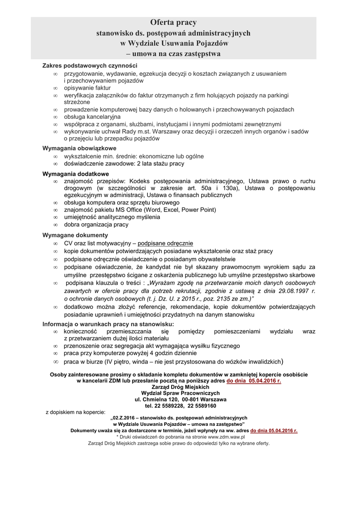 Oferta pracy stanowisko ds. postępowań administracyjnych w Wydziale Usuwania Pojazdów – umowa na czas zastępstwa Zakres podstawowych czynności • przygotowanie, wydawanie, egzekucja decyzji o kosztach związanych z usuwaniem i przechowywaniem pojazdów • opisywanie faktur • weryfikacja załączników do faktur otrzymanych z firm holujących pojazdy na parkingi strzeŜone • prowadzenie komputerowej bazy danych o holowanych i przechowywanych pojazdach • obsługa kancelaryjna • współpraca z organami, słuŜbami, instytucjami i innymi podmiotami zewnętrznymi • wykonywanie uchwał Rady m.st. Warszawy oraz decyzji i orzeczeń innych organów i sadów o przejęciu lub przepadku pojazdów Wymagania obowiązkowe • wykształcenie min. średnie: ekonomiczne lub ogólne • doświadczenie zawodowe: 2 lata staŜu pracy Wymagania dodatkowe • znajomość przepisów: Kodeks postępowania administracyjnego, Ustawa prawo o ruchu drogowym (w szczególności w zakresie art. 50a i 130a), Ustawa o postępowaniu egzekucyjnym w administracji, Ustawa o finansach publicznych • obsługa komputera oraz sprzętu biurowego • znajomość pakietu MS Office (Word, Excel, Power Point) • umiejętność analitycznego myślenia • dobra organizacja pracy Wymagane dokumenty • CV oraz list motywacyjny – podpisane odręcznie • kopie dokumentów potwierdzających posiadane wykształcenie oraz staŜ pracy • podpisane odręcznie oświadczenie o posiadanym obywatelstwie • podpisane oświadczenie, Ŝe kandydat nie był skazany prawomocnym wyrokiem sądu za umyślne przestępstwo ścigane z oskarŜenia publicznego lub umyślne przestępstwo skarbowe • podpisana klauzula o treści : „WyraŜam zgodę na przetwarzanie moich danych osobowych zawartych w ofercie pracy dla potrzeb rekrutacji, zgodnie z ustawą z dnia 29.08.1997 r. o ochronie danych osobowych (t. j. Dz. U. z 2015 r., poz. 2135 ze zm.)” • dodatkowo moŜna złoŜyć referencje, rekomendacje, kopie dokumentów potwierdzających posiadanie uprawnień i umiejętności przydatnych na danym stanowisku Informacja o warunkach pracy na stanowisku: • konieczność przemieszczania się pomiędzy pomieszczeniami wydziału z przetwarzaniem duŜej ilości materiału • przenoszenie oraz segregacja akt wymagająca wysiłku fizycznego • praca przy komputerze powyŜej 4 godzin dziennie • praca w biurze (IV piętro, winda – nie jest przystosowana do wózków inwalidzkich) wraz Osoby zainteresowane prosimy o składanie kompletu dokumentów w zamkniętej kopercie osobiście w kancelarii ZDM lub przesłanie pocztą na poniŜszy adres do dnia 05.04.2016 r. Zarząd Dróg Miejskich Wydział Spraw Pracowniczych ul. Chmielna 120, 00-801 Warszawa tel. 22 5589228, 22 5589160 z dopiskiem na kopercie: „02.Z.2016 – stanowisko ds. postępowań administracyjnych w Wydziale Usuwania Pojazdów – umowa na zastępstwo” Dokumenty uwaŜa się za dostarczone w terminie, jeŜeli wpłynęły na ww. adres do dnia 05.04.2016 r. * Druki oświadczeń do pobrania na stronie www.zdm.waw.pl Zarząd Dróg Miejskich zastrzega sobie prawo do odpowiedzi tylko na wybrane oferty.