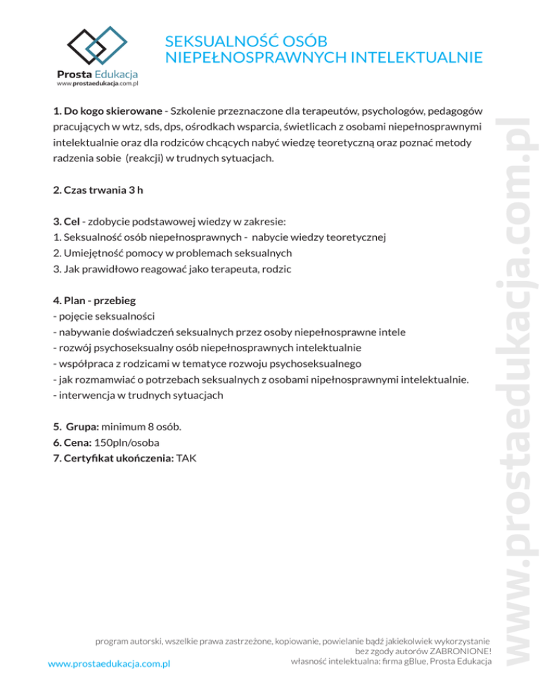 SEKSUALNOŚĆ OSÓB NIEPEŁNOSPRAWNYCH INTELEKTUALNIE Prosta Edukacja www.prostaedukacja.com.pl pracujących w wtz, sds, dps, ośrodkach wsparcia, świetlicach z osobami niepełnosprawnymi intelektualnie oraz dla rodziców chcących nabyć wiedzę teoretyczną oraz poznać metody radzenia sobie (reakcji) w trudnych sytuacjach. 2. Czas trwania 3 h 3. Cel - zdobycie podstawowej wiedzy w zakresie: 1. Seksualność osób niepełnosprawnych - nabycie wiedzy teoretycznej 2. Umiejętność pomocy w problemach seksualnych 3. Jak prawidłowo reagować jako terapeuta, rodzic 4. Plan - przebieg - pojęcie seksualności - nabywanie doświadczeń seksualnych przez osoby niepełnosprawne intele - rozwój psychoseksualny osób niepełnosprawnych intelektualnie - współpraca z rodzicami w tematyce rozwoju psychoseksualnego - jak rozmamwiać o potrzebach seksualnych z osobami nipełnosprawnymi intelektualnie. - interwencja w trudnych sytuacjach 5. Grupa: minimum 8 osób. 6. Cena: 150pln/osoba 7. Certyfikat ukończenia: TAK www.prostaedukacja.com.pl 1. Do kogo skierowane - Szkolenie przeznaczone dla terapeutów, psychologów, pedagogów program autorski, wszelkie prawa zastrzeżone, kopiowanie, powielanie bądź jakiekolwiek wykorzystanie bez zgody autorów ZABRONIONE! własność intelektualna: firma gBlue, Prosta Edukacja www.prostaedukacja.com.pl