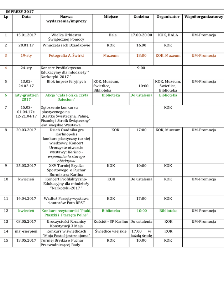 IMPREZY 2017 Lp Data Nazwa wydarzenia/imprezy Miejsce