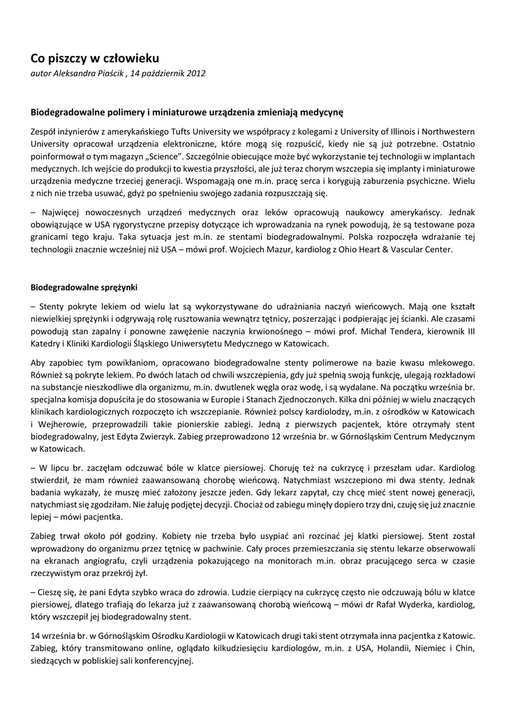 Co piszczy w człowieku autor Aleksandra Piaścik , 14 październik 2012 Biodegradowalne polimery i miniaturowe urządzenia zmieniają medycynę Zespół inżynierów z amerykańskiego Tufts University we współpracy z kolegami z University of Illinois i Northwestern University opracował urządzenia elektroniczne, które mogą się rozpuścić, kiedy nie są już potrzebne. Ostatnio poinformował o tym magazyn „Science”. Szczególnie obiecujące może być wykorzystanie tej technologii w implantach medycznych. Ich wejście do produkcji to kwestia przyszłości, ale już teraz chorym wszczepia się implanty i miniaturowe urządzenia medyczne trzeciej generacji. Wspomagają one m.in. pracę serca i korygują zaburzenia psychiczne. Wielu z nich nie trzeba usuwać, gdyż po spełnieniu swojego zadania rozpuszczają się. – Najwięcej nowoczesnych urządzeń medycznych oraz leków opracowują naukowcy amerykańscy. Jednak obowiązujące w USA rygorystyczne przepisy dotyczące ich wprowadzania na rynek powodują, że są testowane poza granicami tego kraju. Taka sytuacja jest m.in. ze stentami biodegradowalnymi. Polska rozpoczęła wdrażanie tej technologii znacznie wcześniej niż USA – mówi prof. Wojciech Mazur, kardiolog z Ohio Heart & Vascular Center. Biodegradowalne sprężynki – Stenty pokryte lekiem od wielu lat są wykorzystywane do udrażniania naczyń wieńcowych. Mają one kształt niewielkiej sprężynki i odgrywają rolę rusztowania wewnątrz tętnicy, poszerzając i podpierając jej ścianki. Ale czasami powodują stan zapalny i ponowne zawężenie naczynia krwionośnego – mówi prof. Michał Tendera, kierownik III Katedry i Kliniki Kardiologii Śląskiego Uniwersytetu Medycznego w Katowicach. Aby zapobiec tym powikłaniom, opracowano biodegradowalne stenty polimerowe na bazie kwasu mlekowego. Również są pokryte lekiem. Po dwóch latach od chwili wszczepienia, gdy już spełnią swoją funkcję, ulegają rozkładowi na substancje nieszkodliwe dla organizmu, m.in. dwutlenek węgla oraz wodę, i są wydalane. Na początku września br. specjalna komisja dopuściła je do stosowania w Europie i Stanach Zjednoczonych. Kilka dni później w wielu znaczących klinikach kardiologicznych rozpoczęto ich wszczepianie. Również polscy kardiolodzy, m.in. z ośrodków w Katowicach i Wejherowie, przeprowadzili takie pionierskie zabiegi. Jedną z pierwszych pacjentek, które otrzymały stent biodegradowalny, jest Edyta Zwierzyk. Zabieg przeprowadzono 12 września br. w Górnośląskim Centrum Medycznym w Katowicach. – W lipcu br. zaczęłam odczuwać bóle w klatce piersiowej. Choruję też na cukrzycę i przeszłam udar. Kardiolog stwierdził, że mam również zaawansowaną chorobę wieńcową. Natychmiast wszczepiono mi dwa stenty. Jednak badania wykazały, że muszę mieć założony jeszcze jeden. Gdy lekarz zapytał, czy chcę mieć stent nowej generacji, natychmiast się zgodziłam. Nie żałuję podjętej decyzji. Chociaż od zabiegu minęły dopiero trzy dni, czuję się już znacznie lepiej – mówi pacjentka. Zabieg trwał około pół godziny. Kobiety nie trzeba było usypiać ani rozcinać jej klatki piersiowej. Stent został wprowadzony do organizmu przez tętnicę w pachwinie. Cały proces przemieszczania się stentu lekarze obserwowali na ekranach angiografu, czyli urządzenia pokazującego na monitorach m.in. obraz pracującego serca w czasie rzeczywistym oraz przekrój żył. – Cieszę się, że pani Edyta szybko wraca do zdrowia. Ludzie cierpiący na cukrzycę często nie odczuwają bólu w klatce piersiowej, dlatego trafiają do lekarza już z zaawansowaną chorobą wieńcową – mówi dr Rafał Wyderka, kardiolog, który wszczepił jej biodegradowalny stent. 14 września br. w Górnośląskim Ośrodku Kardiologii w Katowicach drugi taki stent otrzymała inna pacjentka z Katowic. Zabieg, który transmitowano online, oglądało kilkudziesięciu kardiologów, m.in. z USA, Holandii, Niemiec i Chin, siedzących w pobliskiej sali konferencyjnej. Na razie nowe stenty otrzymają pacjenci, którzy ukończyli 18 lat, cierpią na przewlekłą chorobę wieńcową, a dodatkowo mają m.in. alergię na leki działające przeciwzapalnie i przeciwzakrzepowo: aspirynę, klopidogrel i heparynę, leki stosowane podczas transplantacji, m.in. sirolimus, oraz stal nierdzewną i materiał kontrastowy. Kolano jak nowe Łąkotka to dwa włóknisto-chrzęstne półkola znajdujące się w kolanie między kością udową i piszczelową. Co roku do ortopedów w Europie i USA zgłasza się 1,5 mln ludzi z uszkodzoną łąkotką i więzadłem krzyżowym. Do uszkodzenia najczęściej dochodzi podczas uprawiania sportu, zwłaszcza biegania po twardym podłożu. Gdy uraz jest bardzo rozległy, łąkotkę należy usunąć. Ale jej wycięcie powoduje wiele problemów zdrowotnych. Teraz lekarze mogą już wstawić choremu nowoczesny implant biodegradowalny. Jest wykonany z poliuretanu i rozpuszcza się po pięciu latach, gdy osiądzie na nim naturalna chrząstka. Po raz pierwszy implant ten w Polsce został wszczepiony w lipcu 2009 r. piłkarzowi, który 12 lat wcześniej, podczas treningu, doznał kontuzji kolana. Zabieg trwał godzinę i miał miejsce w Centrum Medycyny Sportowej w Warszawie. Największą zaletą tego implantu jest szybkość, z jaką kolano odzyskuje dawną sprawność ruchową. Pacjent chodzi normalnie już po sześciu miesiącach od zabiegu. Po roku biega, a po pięciu latach nie ma żadnych śladów po operacji nawet wewnątrz kolana. Polimer w torebce Biodegradowalne są również implanty małych stawów. Lekarze mogą je stosować podczas rekonstrukcji m.in. palców rąk, nóg oraz w trakcie terapii choroby zwyrodnieniowej stawów i reumatoidalnego zapalenia stawów. Nie trzeba usuwać fragmentów kości, mały implant zmieści się w torebce stawowej. Ponieważ został zrobiony ze specjalnego polimeru, po wszczepieniu zostanie otoczony nową chrząstką, a 