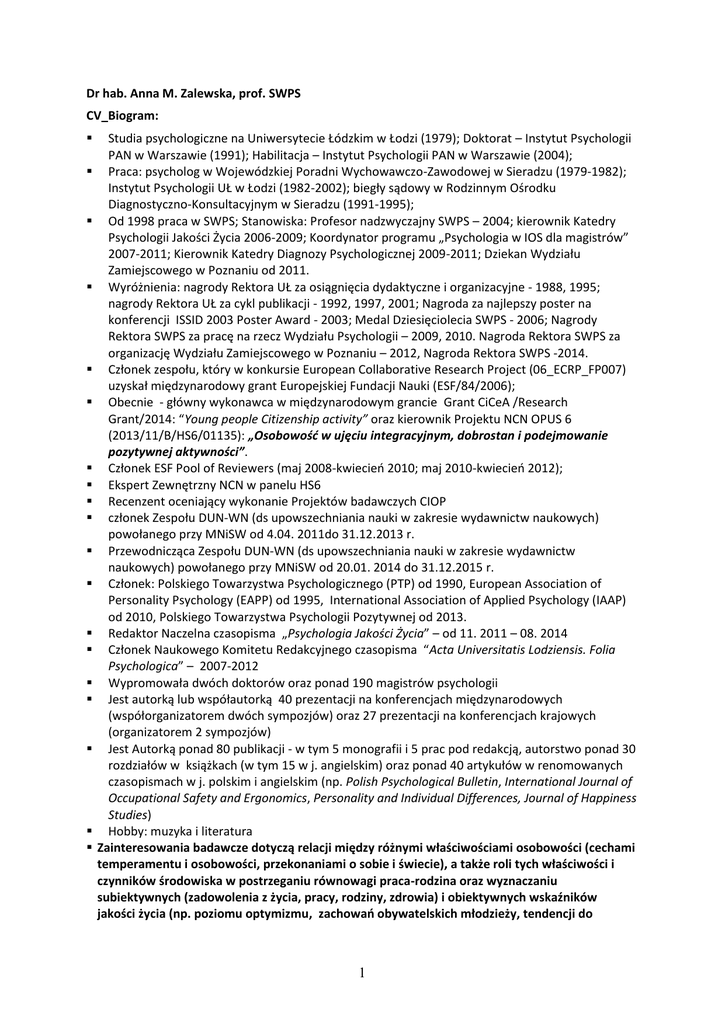 Dr hab. Anna M. Zalewska, prof. SWPS CV_Biogram: Studia psychologiczne na Uniwersytecie Łódzkim w Łodzi (1979); Doktorat – Instytut Psychologii PAN w Warszawie (1991); Habilitacja – Instytut Psychologii PAN w Warszawie (2004); Praca: psycholog w Wojewódzkiej Poradni Wychowawczo-Zawodowej w Sieradzu (1979-1982); Instytut Psychologii UŁ w Łodzi (1982-2002); biegły sądowy w Rodzinnym Ośrodku Diagnostyczno-Konsultacyjnym w Sieradzu (1991-1995); Od 1998 praca w SWPS; Stanowiska: Profesor nadzwyczajny SWPS – 2004; kierownik Katedry Psychologii Jakości Życia 2006-2009; Koordynator programu „Psychologia w IOS dla magistrów” 2007-2011; Kierownik Katedry Diagnozy Psychologicznej 2009-2011; Dziekan Wydziału Zamiejscowego w Poznaniu od 2011. Wyróżnienia: nagrody Rektora UŁ za osiągnięcia dydaktyczne i organizacyjne - 1988, 1995; nagrody Rektora UŁ za cykl publikacji - 1992, 1997, 2001; Nagroda za najlepszy poster na konferencji ISSID 2003 Poster Award - 2003; Medal Dziesięciolecia SWPS - 2006; Nagrody Rektora SWPS za pracę na rzecz Wydziału Psychologii – 2009, 2010. Nagroda Rektora SWPS za organizację Wydziału Zamiejscowego w Poznaniu – 2012, Nagroda Rektora SWPS -2014. Członek zespołu, który w konkursie European Collaborative Research Project (06_ECRP_FP007) uzyskał międzynarodowy grant Europejskiej Fundacji Nauki (ESF/84/2006); Obecnie - główny wykonawca w międzynarodowym grancie Grant CiCeA /Research Grant/2014: “Young people Citizenship activity” oraz kierownik Projektu NCN OPUS 6 (2013/11/B/HS6/01135): „Osobowość w ujęciu integracyjnym, dobrostan i podejmowanie pozytywnej aktywności”. Członek ESF Pool of Reviewers (maj 2008-kwiecień 2010; maj 2010-kwiecień 2012); Ekspert Zewnętrzny NCN w panelu HS6 Recenzent oceniający wykonanie Projektów badawczych CIOP członek Zespołu DUN-WN (ds upowszechniania nauki w zakresie wydawnictw naukowych) powołanego przy MNiSW od 4.04. 2011do 31.12.2013 r. Przewodnicząca Zespołu DUN-WN (ds upowszechniania nauki w zakresie wydawnictw naukowych) powołanego przy MNiSW od 20.01. 2014 do 31.12.2015 r. Członek: Polskiego Towarzystwa Psychologicznego (PTP) od 1990, European Association of Personality Psychology (EAPP) od 1995, International Association of Applied Psychology (IAAP) od 2010, Polskiego Towarzystwa Psychologii Pozytywnej od 2013. Redaktor Naczelna czasopisma „Psychologia Jakości Życia” – od 11. 2011 – 08. 2014 Członek Naukowego Komitetu Redakcyjnego czasopisma “Acta Universitatis Lodziensis. Folia Psychologica” – 2007-2012 Wypromowała dwóch doktorów oraz ponad 190 magistrów psychologii Jest autorką lub współautorką 40 prezentacji na konferencjach międzynarodowych (współorganizatorem dwóch sympozjów) oraz 27 prezentacji na konferencjach krajowych (organizatorem 2 sympozjów) Jest Autorką ponad 80 publikacji - w tym 5 monografii i 5 prac pod redakcją, autorstwo ponad 30 rozdziałów w książkach (w tym 15 w j. angielskim) oraz ponad 40 artykułów w renomowanych czasopismach w j. polskim i angielskim (np. Polish Psychological Bulletin, International Journal of Occupational Safety and Ergonomics, Personality and Individual Differences, Journal of Happiness Studies) Hobby: muzyka i literatura Zainteresowania badawcze dotyczą relacji między różnymi właściwościami osobowości (cechami temperamentu i osobowości, przekonaniami o sobie i świecie), a także roli tych właściwości i czynników środowiska w postrzeganiu równowagi praca-rodzina oraz wyznaczaniu subiektywnych (zadowolenia z życia, pracy, rodziny, zdrowia) i obiektywnych wskaźników jakości życia (np. poziomu optymizmu, zachowań obywatelskich młodzieży, tendencji do 1 kooperacji). Interesują ją również problemy pomiaru - jest autorką dwóch technik do pomiaru zadowolenia z pracy, współautorką Kwestionariusza Zachowań Obywatelskich dla młodzieży, dokonała adaptacji dwóch innych narzędzi mierzących zadowolenie z pracy, a także technik do pomiaru wartości zawodowych i konfliktu „praca-rodzina”. Uczestniczyła w kilkunastu grantach badawczych (m.in. w międzynarodowym grancie Europejskiej Fundacji Nauki). Obecnie jest głownym wykonawcą w międzynarodowym grancie Grant CiCeA /Research Grant/2014 oraz kierownikiem projektu NCN OPUS 6 (2013/11/B/HS6/01135): „Osobowość w ujęciu integracyjnym, dobrostan i podejmowanie pozytywnej aktywności”. Była członkiem European Science Foundation Pool of Reviewers, jest członkiem kilku towarzystw psychologicznych (PTP, PTPP, EAPP, IAPP). Wybrane publikacje z lat wcześniejszych oraz pełna lista od 2009 roku: Bojanowska, A. i Zalewska, A. M. (2015). Lay understanding of happiness and the experience of wellbeing – are some conceptions of happiness more beneficial than others? Journal of Happiness Studies, DOI 10.1007/s10902-015-9620-1. Zuzeviciute, V., Viduoliene, E., Krzywosz-Rynkiewicz, B. i Zalewska, A. (2014). Citizenship Tolerance and Humanism: Achievements and Safeguards - A Case of Young People's Interpretations of Being a Citizen of a Particular State, Lithuania. Journal of Modern Education Review, 4 (10), 758-766. Doi: 10.15341/jmer(2155-7993)/10.04.2014/004 Zalewska, A. M. (2014). Komentarz do standard 2.5i. Wyjaśniasz, jaka jest różnica pomiedzy danymi zebranymi podczas badania testami a danymi uzysknymi z innych źródeł. W: U. Brzezińska i D. Malinowska (red.), Standardy dla osób stosujących testy w biznesie (s. 143-149). W-wa: PTP PTP. Zalewska, A. M. i Krzywosz-Rynkiewicz, B. (2013), When and why do young people tend to cooperate? Citizenship Teaching and Learning, 8 (2), 215–231. doi: 10.1386/ctl.8.2.215_1 Zalewska, A. (red.) (2013). Psychologia Jakości Życia, 12 (1i2). Zalewska, A. (red.) (2012). Psychologia Jakości Życia, 11 (1i2). Bojanowska, A. i Zalewska, A. M. (2011). Subjective well-being among teenagers of different ages: the role of emotional reactivity and social support from various 