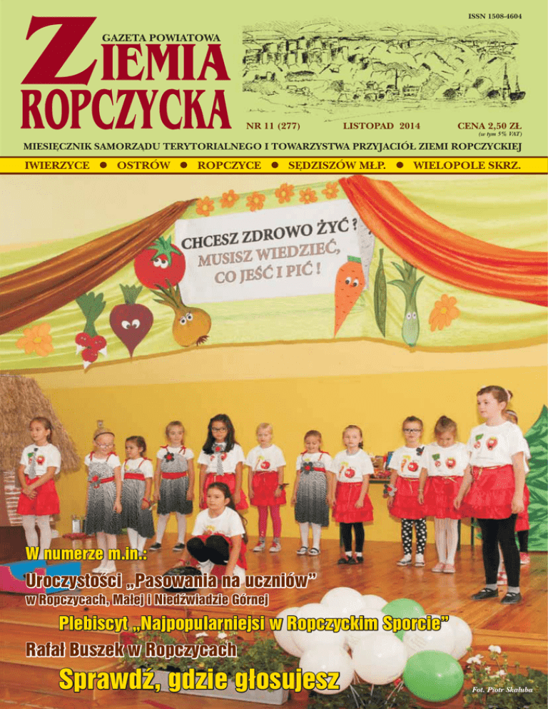 IEMIA Z ROPCZYCKA ISSN 1508-4604 GAZETA POWIATOWA NR 11 (277) LISTOPAD 2014 CENA 2,50 ZŁ (w tym 5% VAT) MIESIĘCZNIK SAMORZĄDU TERYTORIALNEGO I TOWARZYSTWA PRZYJACIÓŁ ZIEMI ROPCZYCKIEJ IWIERZYCE l OSTRÓW l ROPCZYCE l SĘDZISZÓW MŁP. l WIELOPOLE SKRZ. W numerze m.in.: Uroczystości „Pasowania na uczniów” w Ropczycach, Małej i Niedźwiadzie Górnej Plebiscyt „Najpopularniejsi w Ropczyckim Sporcie” Rafał Buszek w Ropczycach Sprawdź, gdzie głosujesz Fot. Piotr Skałuba ZAGORZYCE DOLNE SPIS TREŚCI WIEŚCI Z MAGISTRATU ...............................................................................4-5 OBRADOWAŁA RADA MIEJSKA .....................................................................6 • 59. sesja Rady Miejskiej w Ropczycach SPOŁECZEŃSTWO I GOSPODARKA ..........................................................7-11 • Podatki w 2015 roku bez zmian • Informacja o sposobie głosowania oraz warunkach ważności głosu • Aktualności z Powiatowego Urzędu Pracy w Ropczycach • Przyjemnie spędzamy czas • Obwieszczenie NA KARTACH HISTORII ............................................................................12-13 • Moje harcerstwo MIEJSKA I POWIATOWA BIBLIOTEKA PUBLICZNA W ROPCZYCACH ....13-16 • Biblioteka poleca • Język polski - dodaj do ulubionych • Tomasz Kordyaczny w bibliotece • Życie nie stawia pytań, życie po prostu jest • Ropczyce w literaturze i sztuce • Spotkania z pasjami • Książka jest życiem naszych czasów • Żydzi w Ropczycach. Obcy czy swoi? Jubileusz 100-lecia Szkoły Podstawowej w Zagorzycach Dolnych 25 września 2014 roku w Zagorzycach Dolnych miała miejsce długo oczekiwana uroczystość. Tego dnia ks. biskup Kazimierz Górny poświęcił nową salę gimnastyczną, którą wybudowano przy istniejącej szkole. Najbardziej cieszą się z niej dzieci i młodzież, ponieważ w lepszych i bardziej bezpiecznych warunkach będą odbywały się lekcje wychowania fizycznego. Z obiektu skorzystają też mieszkańcy wsi. Ciąg dalszy na str. 32 CENTRUM KULTURY IM. JÓZEFA MEHOFFERA W ROPCZYCACH ............17 • Święto planszówek Z PRZEDSZKOLI I SZKÓŁ GMINY ROPCZYCE ........................................18-22 • Dzień patrona w Zespole Szkół w Małej • Pasowanie na ucznia • Ślubowania nadszedł czas • Międzyszkolne spotkania ekologiczne • Poranek z Marią Konopnicką • Nasi uczniowie koncertują w polskim konsulacie • Biwak harcerski • Rajd po okolicy • Spotkanie z policją • Warsztaty florystyczne. Dekoracja grobów LICEUM OGÓLNOKSZTAŁCĄCE W ROPCZYCACH ......................................23 • Polsko-niemiecka wymiana młodzieży ZESPÓŁ SZKÓŁ W ROPCZYCACH ...........................................................26-27 • Bezpieczna i przyjazna szkoła • Fototechnik - zawód z pasją • Dzień Edukacji Narodowej • Dni kultury szkolnej w Rzeszowie • Wychodząc naprzeciw oczekiwaniom młodzieży • III miejsce Zespołu Szkół w konkursie „Pokaż co potrafisz” • Ciemno wszędzie, straszno wszędzie WIADOMOŚCI Z GMINY OSTRÓW ..........................................................28-29 • 15 lat minęło III Rowerowy rajd ludzi pracy • Wycieczka do Nordhausen • Zagraj smyku na Orliku • Jubileusz wielopolskiego gimnazjum • Chór Rolników na występach • Gminne spotkanie seniorów w Brzezinach WIADOMOŚCI Z GMINY SĘDZISZÓW MAŁOPOLSKI ..................................32 • Śpiworowe bajanie w Sędziszowie Młp. • Jubileusz 100-lecia Szkoły Podstawowej w Zagorzycach W uroczystości uczestniczyli m.in. uczniowie szkoły OSTRÓW 15 lat minęło W murach Publicznego Gimnazjum w Ostrowie zagościli dorośli absolwenci tej placówki. 25 października br. szkoła obchodziła swoje 15 urodziny. Ciąg dalszy na str. 28 TO I OWO ...................................................................................................33-39 • Festiwal Nauki i Techniki w Ropczycach • Jesienne trendy kosmetyczne • Na progu „jednej tabletki” na choroby serca • Wielka wystawa w Muzeum Narodowym w Krakowie • Czy jedzenie zmienia zapach ciała? • Sezon na zapomniane warzywa • Sport to zdrowie dla kręgosłupa • Listopad w ogrodzie PTTK ROPCZYCE ......................................................................................40-41 • Jesienna wycieczka • XVII Rajd „Śladami sławnych ludzi” WIADOMOŚCI SPORTOWE .....................................................................41-45 • Dwa puchary nauczycieli w tenisie stołowym • Śladami mistrza świata • Indywidualne Biegi Przełajowe • Piłka nożna dziewcząt • Sumici z Lubziny nie zawodzą • Mistrzostwa młodzików w zapasach • Tenisiści walczyli puchar przewodniczącego Rady Miejskiej • IX Plebiscyt „Najpopularniejsi w Ropczyckim Sporcie - 2014” IEMIA Z ROPCZYCKA GAZETA POWIATOWA Uczestnicy uroczystości jubileuszowych Wydawca: Towarzystwo Przyjaciół Ziemi Ropczyckiej w Ropczycach. Nakład: 1200 egz. Zespół redakcyjny: Teresa Kiepiel – red. nacz., Elżbieta Kosydar, Agnieszka Szela, Edyta Pazdan, Piotr Skałuba, Jolanta Kaszowska, Marcin Świerad – red. Wielopole Skrz. Współpracują: Katarzyna Sikora, Maria Wójcik, Barbara Traciak (Sędziszów Młp.). Adres redakcji: ul. Bursztyna 1, 39-100 Ropczyce. Dyżury redakcyjne: czwartek w godz. 10.00-12.00 w Centrum Kultury tel. 17 22-18-228. Redakcja zastrzega sobie prawo skracania nadsyłanych tekstów. Za treść poszczególnych artykułów odpowiadają ich autorzy. Druk: Drukarnia „Duet”, tel. 17 87-11-281. Reklamy prosimy przesyłać na e-mail: [email protected], [email protected] www.gazeta-ziemiaropczycka.pl Miesięcznik Powiatowy „Ziemia Ropczycka” jest członkiem Polskiego Stowarzyszenia Prasy Lokalnej WIELOPOLE SKRZYŃSKIE Jubileusz wielopolskiego gimnazjum 21 października 2014 roku w Publicznym Gimnazjum im. księdza Jerzego Popiełuszki w Wielopolu Skrzyńskim odbyła się wyjątkowa u