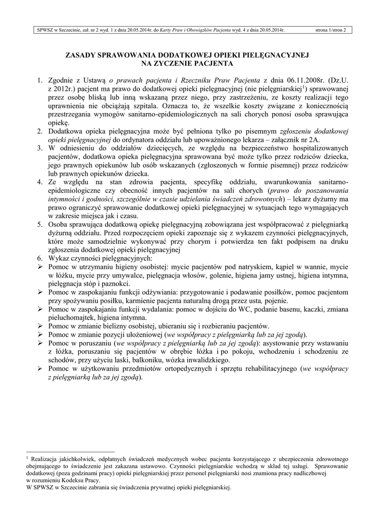 SPWSZ w Szczecinie, zał. nr 2 wyd. 1 z dnia 20.05.2014r. do Karty Praw i Obowiązków Pacjenta wyd. 4 z dnia 20.05.2014r. strona 1/stron 2 ZASADY SPRAWOWANIA DODATKOWEJ OPIEKI PIELĘGNACYJNEJ NA ZYCZENIE PACJENTA 1. Zgodnie z Ustawą o prawach pacjenta i Rzeczniku Praw Pacjenta z dnia 06.11.2008r. (Dz.U. z 2012r.) pacjent ma prawo do dodatkowej opieki pielęgnacyjnej (nie pielęgniarskiej 1) sprawowanej przez osobę bliską lub inną wskazaną przez niego, przy zastrzeżeniu, ze koszty realizacji tego uprawnienia nie obciążają szpitala. Oznacza to, że wszelkie koszty związane z koniecznością przestrzegania wymogów sanitarno-epidemiologicznych na sali chorych ponosi osoba sprawująca opiekę. 2. Dodatkowa opieka pielęgnacyjna może być pełniona tylko po pisemnym zgłoszeniu dodatkowej opieki pielęgnacyjnej do ordynatora oddziału lub upoważnionego lekarza – załącznik nr 2A. 3. W odniesieniu do oddziałów dziecięcych, ze względu na bezpieczeństwo hospitalizowanych pacjentów, dodatkowa opieka pielęgnacyjna sprawowana być może tylko przez rodziców dziecka, jego prawnych opiekunów lub osób wskazanych (zgłoszonych w formie pisemnej) przez rodziców lub prawnych opiekunów dziecka. 4. Ze względu na stan zdrowia pacjenta, specyfikę oddziału, uwarunkowania sanitarnoepidemiologiczne czy obecność innych pacjentów na sali chorych (prawo do poszanowania intymności i godności, szczególnie w czasie udzielania świadczeń zdrowotnych) – lekarz dyżurny ma prawo ograniczyć sprawowanie dodatkowej opieki pielęgnacyjnej w sytuacjach tego wymagających w zakresie miejsca jak i czasu. 5. Osoba sprawująca dodatkową opiekę pielęgnacyjną zobowiązana jest współpracować z pielęgniarką dyżurną oddziału. Przed rozpoczęciem opieki zapoznaje się z wykazem czynności pielęgnacyjnych, które może samodzielnie wykonywać przy chorym i potwierdza ten fakt podpisem na druku zgłoszenia dodatkowej opieki pielęgnacyjnej 6. Wykaz czynności pielęgnacyjnych: Pomoc w utrzymaniu higieny osobistej: mycie pacjentów pod natryskiem, kąpiel w wannie, mycie w łóżku, mycie przy umywalce, pielęgnacja włosów, golenie, higiena jamy ustnej, higiena intymna, pielęgnacja stóp i paznokci. Pomoc w zaspokajaniu funkcji odżywiania: przygotowanie i podawanie posiłków, pomoc pacjentom przy spożywaniu posiłku, karmienie pacjenta naturalną drogą przez usta, pojenie. Pomoc w zaspokajaniu funkcji wydalania: pomoc w dojściu do WC, podanie basenu, kaczki, zmiana pieluchomajtek, higiena intymna. Pomoc w zmianie bielizny osobistej, ubieraniu się i rozbieraniu pacjentów. Pomoc w zmianie pozycji ułożeniowej (we współpracy z pielęgniarką lub za jej zgodą). Pomoc w poruszaniu (we współpracy z pielęgniarką lub za jej zgodą): asystowanie przy wstawaniu z łóżka, poruszaniu się pacjentów w obrębie łóżka i po pokoju, wchodzeniu i schodzeniu ze schodów, przy użyciu laski, balkoniku, wózka inwalidzkiego. Pomoc w użytkowaniu przedmiotów ortopedycznych i sprzętu rehabilitacyjnego (we współpracy z pielęgniarką lub za jej zgodą). Realizacja jakichkolwiek, odpłatnych świadczeń medycznych wobec pacjenta korzystającego z ubezpieczenia zdrowotnego obejmującego to świadczenie jest zakazana ustawowo. Czynności pielęgniarskie wchodzą w skład tej usługi. Sprawowanie dodatkowej (poza godzinami pracy) opieki pielęgniarskiej przez personel pielęgniarski nosi znamiona pracy nadliczbowej w rozumieniu Kodeksu Pracy. W SPWSZ w Szczecinie zabrania się świadczenia prywatnej opieki pielęgniarskiej. 1 SPWSZ w Szczecinie, zał. nr 2A wyd. 1 z dnia 20.05.2014r. do Karty Praw i Obowiązków Pacjenta wyd. 4 z dnia 20.05.2014r. strona 2/stron 2 ZGŁOSZENIE DODATKOWEJ OPIEKI PIELĘGNACYJNEJ NAD CHORYM I. Dane osoby sprawującej opiekę pielęgnacyjną: Imię i nazwisko……………………………………………………………………………… Adres ………………………………………………………………………………………… Telefon kontaktowy …………………………………………………………………………. II. Opieka pielęgnacyjna sprawowana nad pacjentem: Imię i nazwisko pacjenta ……………………………………………………………………. Oddział szpitalny …………………………………………………………………………… Okres sprawowania opieki ………………………………………………………………….. III. Potwierdzam zapoznanie się z zasadami wykonywania dodatkowych czynności pielęgnacyjnych nad chorym i zobowiązuję się ich przestrzegać .......................................……………….. Czytelny podpis osoby sprawującej opiekę
