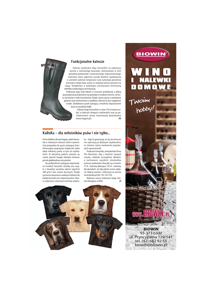 Funkcjonalne kalosze Kalosze myśliwskie Vega Aircomfort są wykonane ręcznie z naturalnego kauczuku. Zastosowano w nich specjalną podszewkę z nowoczesnego, trójwymiarowego materiału, która zapewnia wysoki komfort użytkowania w szerokim zakresie temperatur oraz cyrkulację powietrza wewnątrz całego buta, przez co redukuje proces pocenia się stopy. Dodatkowo w podstopiu umieszczono techniczną wkładkę zwiększającą amortyzację. Podeszwa typu Grip Vibram o mocnym protektorze z dobrą przyczepnością znakomicie się sprawdza w trudnym terenie. Cechuje się bowiem małą ścieralnością. Dzięki użyciu gumy o podwójnej gęstości oraz wzmocnieniu w podbiciu obuwie to jest wyjątkowo trwałe. Dodatkowo pasek spinający umożliwia dopasowanie buta na wysokości łydki. Kalosze Vega Aircomfort w cenie 755 zł można nabyć w dobrych sklepach myśliwskich oraz za pośrednictwem strony internetowej dystrybutora (www.magum.pl). PS .D5R.DŪGODPLçRöQLNµZSVµZLQLHW\ONR Firma KaRoKa oferuje bogaty wybór koszulek w ciekawych wzorach, które z pewnością przypadną do gustu polującej braci. Interesujące propozycje znajdą dla siebie także miłośnicy psów, w tym ras myśliwskich. W aktualnej palecie wzorów są: cocker spaniel, beagle, labrador retriever, jamnik gładkowłosy oraz pointer. Na podkreślenie zasługuje nieprzeciętna trwałość koszulek. Zostały one uszyte z bawełny wysokiej jakości (gęstość 200 g/m2) bez szwów bocznych. Dzięki ręcznemu barwieniu wodnymi farbami tło każdej koszulki jest niepowtarzalne. Wzory wykonano natomiast techniką sitodru- ku – daje to gwarancję, że się nie zetrą ani nie wykruszą po dłuższym użytkowaniu, co stanowi częsty mankament popularnych wprasowanek. Producent koszulek, amerykańska firma The Mountain, idąc z duchem naszych czasów, dokłada szczególnej dbałości o zachowanie wysokich standardów ochrony środowiska. Koszulki są w cenach: 77 zł – rozmiary dziecięce, 107 zł – rozmiary dla dorosłych. Za taką jakość warto zapłacić. Więcej wzorów i informacji na stronie www.karoka.pl (tel. 723 143 153). Wybrane wzory niebawem będą również dostępne w KSW. JZ