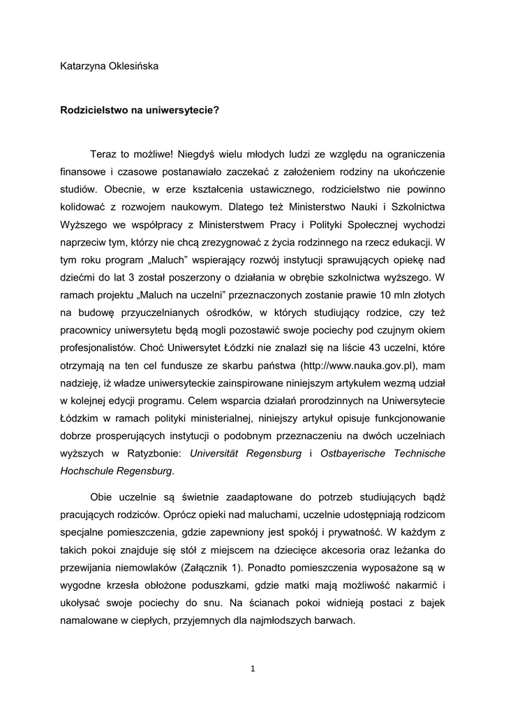 Katarzyna Oklesińska Rodzicielstwo na uniwersytecie? Teraz to możliwe! Niegdyś wielu młodych ludzi ze względu na ograniczenia finansowe i czasowe postanawiało zaczekać z założeniem rodziny na ukończenie studiów. Obecnie, w erze kształcenia ustawicznego, rodzicielstwo nie powinno kolidować z rozwojem naukowym. Dlatego też Ministerstwo Nauki i Szkolnictwa Wyższego we współpracy z Ministerstwem Pracy i Polityki Społecznej wychodzi naprzeciw tym, którzy nie chcą zrezygnować z życia rodzinnego na rzecz edukacji. W tym roku program „Maluch” wspierający rozwój instytucji sprawujących opiekę nad dziećmi do lat 3 został poszerzony o działania w obrębie szkolnictwa wyższego. W ramach projektu „Maluch na uczelni” przeznaczonych zostanie prawie 10 mln złotych na budowę przyuczelnianych ośrodków, w których studiujący rodzice, czy też pracownicy uniwersytetu będą mogli pozostawić swoje pociechy pod czujnym okiem profesjonalistów. Choć Uniwersytet Łódzki nie znalazł się na liście 43 uczelni, które otrzymają na ten cel fundusze ze skarbu państwa (http://www.nauka.gov.pl), mam nadzieję, iż władze uniwersyteckie zainspirowane niniejszym artykułem wezmą udział w kolejnej edycji programu. Celem wsparcia działań prorodzinnych na Uniwersytecie Łódzkim w ramach polityki ministerialnej, niniejszy artykuł opisuje funkcjonowanie dobrze prosperujących instytucji o podobnym przeznaczeniu na dwóch uczelniach wyższych w Ratyzbonie: Universität Regensburg i Ostbayerische Technische Hochschule Regensburg. Obie uczelnie są świetnie zaadaptowane do potrzeb studiujących bądź pracujących rodziców. Oprócz opieki nad maluchami, uczelnie udostępniają rodzicom specjalne pomieszczenia, gdzie zapewniony jest spokój i prywatność. W każdym z takich pokoi znajduje się stół z miejscem na dziecięce akcesoria oraz leżanka do przewijania niemowlaków (Załącznik 1). Ponadto pomieszczenia wyposażone są w wygodne krzesła obłożone poduszkami, gdzie matki mają możliwość nakarmić i ukołysać swoje pociechy do snu. Na ścianach pokoi widnieją postaci z bajek namalowane w ciepłych, przyjemnych dla najmłodszych barwach. 1 Poza pomieszczeniami przystosowanymi do przewijania, karmienia i usypania maluchów, obie uczelnie dysponują również pokojami zabaw. Podczas przerwy w zajęciach rodzice mogą zabrać swoje dzieci do takiego pomieszczenia oraz spędzić wspólnie czas na grach i zabawach. Studenci, którzy muszą udać się na zajęcia uniwersyteckie, a nie mają zorganizowanej opieki dla swojego malucha, mogą go pozostawić w pokoju zabaw pod okiem czujnego opiekuna. Obie uczelnie oferują pomoc studentom w takich sytuacjach, jednak na każdej jest ona zorganizowana odmiennie. Uniwersytet Ratyzboński zapewnia opiekę nad najmłodszymi zarówno podczas roku akademickiego jak i ferii. W roku akademickim usługi te są bezpłatne, zaś w czasie wolnym od zajęć uniwersyteckich1 studenci i pracownicy uczelni muszą uiścić symboliczną opłatę w wysokości pięciu euro od dziecka za cały dzień. Wszyscy zainteresowani pozostawieniem swoich dzieci pod opieką uczelnianej niani muszą się wcześniej zapisać w biurze Familien-Service der Universität prowadzonym przez Panią Marthę Hopper. Konieczność ta wynika przede wszystkim z dbałości o bezpieczeństwo i komfort maluchów. Na jedną nianię przypada maksymalnie trójka dzieci, dzięki czemu opiekunka może skupić się na powierzonych jej szkrabach, zaś dzieci mają dużą przestrzeń do zabawy. Uniwersytet zatrudnia jedną profesjonalną nianię, która ukończyła kurs dla opiekunek dziecięcych oraz ma siedem lat doświadczenia w pracy. Gdy pokoje zabaw są bardziej oblężone, uczelnia korzysta z odpłatnej pomocy studentów, którzy posiadają odpowiednie uprawnienia do pracy z dziećmi (Martha Hopper, rozmowa prywatna, 2 czerwca 2015). Dość ciekawym rozwiązaniem zaadaptowanym przez Uniwersytet Ratyzboński jest zatrudnianie "dziadków-wolontariuszy". Pomysł ten jest bardzo korzystny dla wszystkich stron: rodziców, opiekunów i podopiecznych. Rodzice są pewni, że zostawiają swoje pociechy pod okiem doświadczonych osób, seniorzy mają poczucie bycia potrzebnym w społeczeństwie, zaś najmłodsi mogą czerpać z wiedzy życiowej zastępczych dziadków. Opieka świadczona przez seniorów, jest zawsze darmowa bez względu na to, czy odbywa się ona w roku szkolnym czy podczas ferii. Z uwagi na utrudnioną mobilność zastępczych dziadków, rodzice są zobligowani, żeby zawieźć dzieci do domów wolontariuszy, a później je stamtąd odebrać. Celem 1 Cztery tygodnie wakacji letnich, tydzień przerwy jesiennej, tydzień przerwy wielkanocnej oraz dwa tygodnie ferii z okazji Zesłania Ducha Świętego. 2 uniknięcia monopolizacji seniorów, z ich usług można skorzystać maksymalnie przez dwa dni w tygodniu (Martha Hopper, rozmowa prywatna, 2 czerwca 2015). Podczas roku akademickiego zajęcia dla dzieci odbywają się głównie w pokojach zabaw (Załącznik 2). Pokoje oprócz podstawowego umeblowania i sprzętu przystosowanego do opieki nad małymi dziećmi (łóżeczka, nosidełka, wózki, przewijaki) posiadają również bogatą gamę gier i zabawek dla podopiecznych w różnych grupach wiekowych. W ten sposób każde dziecko zawsze znajdzie coś, co odpowiada jego zainteresowaniom. Przykładowo, młodsze dzieci bawią się grzechotkami, pluszowymi maskotkami, zaś starsze mogą poukładać puzzle, pograć w gry planszowe czy poczytać bajki. Podczas ferii centrum Familien-Service der Universität organizuje przeróżne atrakcje dla swoich podopiecznych. Niania zabiera dzieci na boisko, gdzie można uprawiać sporty typu piłka nożna czy koszykówka. Nieco mniej standardową formą aktywności fizycznej jest wspinaczka ściankowa, podczas której dzieci rozwijają swoje umiejętności motoryczne i wyobraźnię przestrzenną, a także pracują nad umiejętn