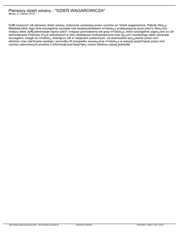 Pierwszy dzieñ wiosny - "DZIEÑ WAGAROWICZA" (¶roda, 21 marzec 2012) - Dzi¶ rozpocz±³ siê pierwszy dzieñ wiosny, potocznie uznawany przez uczniów za "dzieñ wagarowicza. Patrole Stra¿y Miejskiej bêd± tego dnia szczególnie czuwaæ nad bezpieczeñstwem m³odzie¿y przebywaj±cej poza szko³±.Stra¿nicy miejscy bêd± dzi¶ patrolowaæ rejony szkó³ i miejsca gromadzenia siê grup m³odzie¿y, które szczególnie zagro¿one s± ich demoralizacj±.Podczas s³u¿b patrolowych w dniu dzisiejszym funkcjonariusze oraz dy¿urni monitoringu bêd± zwracaæ szczególn± uwagê na m³odzie¿ zbieraj±c± siê w miejscach publicznych, na ewentualne spo¿ywanie przez nich alkoholu oraz zak³ócanie spokoju i porz±dku.W przypadku zauwa¿enia m³odzie¿y w sytuacji pope³niania przez nich czynów zabronionych prosimy o informacjê pod bezp³atny numer telefonu naszej jednostki http://strazmiejska.pruszkow.pl/sm - strazmiejska.pruszkow.pl Powered by Mambo Generated: 7 March, 2017, 06:25