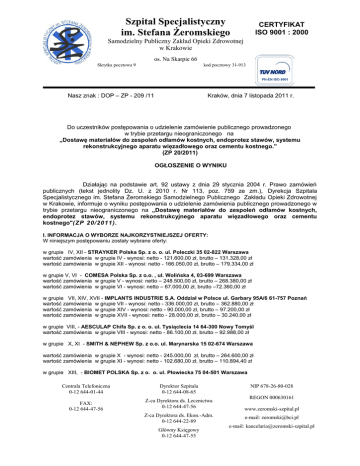 Szpital Specjalistyczny im. Stefana Żeromskiego CERTYFIKAT ISO 9001 : 2000 Samodzielny Publiczny Zakład Opieki Zdrowotnej w Krakowie os. Na Skarpie 66 Skrytka pocztowa 9 kod pocztowy 31-913 Nasz znak : DOP – ZP - 209 /11 Kraków, dnia 7 listopada 2011 r. Do uczestników postępowania o udzielenie zamówienie publicznego prowadzonego w trybie przetargu nieograniczonego na „Dostawę materiałów do zespoleń odłamów kostnych, endoprotez stawów, systemu rekonstrukcyjnego aparatu więzadłowego oraz cementu kostnego." (ZP 20/2011) OGŁOSZENIE O WYNIKU Działając na podstawie art. 92 ustawy z dnia 29 stycznia 2004 r. Prawo zamówień publicznych (tekst jednolity Dz. U. z 2010 r. Nr 113, poz. 759 ze zm.), Dyrekcja Szpitala Specjalistycznego im. Stefana Żeromskiego Samodzielnego Publicznego Zakładu Opieki Zdrowotnej w Krakowie, informuje o wyniku postępowania o udzielenie zamówienia publicznego prowadzonego w trybie przetargu nieograniczonego na „Dostawę materiałów do zespoleń odłamów kostnych, endoprotez stawów, systemu rekonstrukcyjnego aparatu więzadłowego oraz cementu kostnego"(ZP 2 0/ 20 11 ). I. INFORMACJA O WYBORZE NAJKORZYSTNIEJSZEJ OFERTY: W niniejszym postępowaniu zostały wybrane oferty: w grupie IV, XII - STRAYKER Polska Sp. z o. o. ul. Poleczki 35 02-822 Warszawa wartość zamówienia w grupie IV - wynosi: netto - 121.600,00 zł, brutto – 131.328,00 zł wartość zamówienia w grupie XII - wynosi: netto - 166.050,00 zł, brutto – 179.334,00 zł w grupie V, VI - COMESA Polska Sp. z o.o. , ul. Wolińska 4, 03-699 Warszawa wartość zamówienia w grupie V - wynosi: netto – 248.500,00 zł, brutto – 268.380,00 zł wartość zamówienia w grupie VI - wynosi: netto – 67.000,00 zł, brutto –72.360,00 zł w grupie VII, XIV, XVII - IMPLANTS INDUSTRIE S.A. Oddział w Polsce ul. Garbary 95A/6 61-757 Poznań wartość zamówienia w grupie VII - wynosi: netto - 336.000,00 zł, brutto – 362.880,00 zł wartość zamówienia w grupie XIV - wynosi: netto - 90.000,00 zł, brutto – 97.200,00 zł wartość zamówienia w grupie XVII - wynosi: netto - 28.000,00 zł, brutto – 30.240,00 zł w grupie VIII, - AESCULAP Chifa Sp. z o. o. ul. Tysiąclecia 14 64-300 Nowy Tomyśl wartość zamówienia w grupie VIII - wynosi: netto - 86.100,00 zł, brutto – 92.988,00 zł w grupie X, XI - SMITH & NEPHEW Sp. z o.o. ul. Marynarska 15 02-674 Warszawa wartość zamówienia w grupie X - wynosi: netto - 245.000,00 zł, brutto – 264.600,00 zł wartość zamówienia w grupie XI - wynosi: netto - 102.680,00 zł, brutto – 110.894,40 zł w grupie XIII, - BIOMET POLSKA Sp. z o. o. ul. Płowiecka 75 04-501 Warszawa Centrala Telefoniczna 0-12 644-01-44 FAX: 0-12 644-47-56 Dyrektor Szpitala 0-12 644-08-65 Z-ca Dyrektora ds. Lecznictwa 0-12 644-47-56 Z-ca Dyrektora ds. Ekon.-Adm. 0-12 644-22-89 Główny Księgowy 0-12 644-47-55 NIP 678-26-80-028 REGON 000630161 www.zeromski-szpital.pl e-mail: [email protected] e-mail: [email protected] Szpital Specjalistyczny im. Stefana Żeromskiego CERTYFIKAT ISO 9001 : 2000 Samodzielny Publiczny Zakład Opieki Zdrowotnej w Krakowie os. Na Skarpie 66 Skrytka pocztowa 9 kod pocztowy 31-913 wartość zamówienia w grupie XIII - wynosi: netto - 105000,00 zł, brutto – 113400,00 zł w grupie XVIII- SYNTHES Sp. z o .o. Al. Jerozolimskie 181 02-222 Warszawa wartość zamówienia w grupie XVIII - wynosi: netto - 20.560,00 zł, brutto – 22.204,80 zł Termin podpisania umów nastąpi zgodnie z art. 94 ust. 1 ustawy Prawo zamówień publicznych (tekst jednolity Dz. U. z 2010 r. Nr 113, poz. 759 ze zm.), II. Zamawiający informuje, że grupach III, IX, XVI na podstawie art 93 ust. 1 pkt 1 ustawy postępowanie zostało unieważnione, ponieważ nie złożono żadnej oferty niepodlegającej odrzuceniu, albo nie wpłynął żaden wniosek o dopuszczenie do udziału w postępowaniu od wykonawcy nie podlegającego wykluczeniu z zastrzeżeniem pkt 2 i 3. III. Zamawiający informuje, że w grupach I i XV postępowanie zostało unieważnione na podstawie art. art 93 ust. 1 pkt 4 ustawy ponieważ cena najkorzystniejszej oferty lub oferta z najniższą ceną przewyższa kwotę, którą zamawiający zamierza przeznaczyć na sfinansowanie zamówienia, chyba że zamawiający może zwiększyć tę kwotę do ceny najkorzystniejszej oferty. IV. Zamawiający informuje również, że postępowanie w grupie II zostanie rozstrzygnięte w późniejszym terminie. V. ZESTAWIENIE WYKONAWCÓW, KTÓRZY ZŁOŻYLI OFERTY WRAZ ZE STRESZCZENIEM OCENY I PORÓWNANIEM ZŁOŻONYCH OFERT: L.p Nr Nazwa i siedziba wykonawców, którzy ofer złożyli oferty ty cena jakość i walory użytkowe warunki prowadzenia depozytu, przekazania i serwisowania instrumentarium RAZEM 1 5 grupa IV STRAYKER Polska Sp. z o. o. ul. Poleczki 35 02-822 Warszawa 50,00 pkt 31,50 pkt 18,00 pkt 99,50 pkt 2 3 grupa V Comesa Polska Sp. z o.o. ul. Wolińska 4 03-699 Warszawa 50,00 pkt 30,00 pkt 17,00 pkt 97,00 pkt 3 3 grupa VI Comesa Polska Sp. z o.o. ul. Wolińska 4 03-699 Warszawa 50,00 pkt 30,00 pkt 17,00 pkt 97,00 pkt 4 4 grupa VII IMPLANTS INDUSTRIE S.A. Oddział w 50,00 pkt 31,50 pkt 9,00 pkt 90,50 pkt Centrala Telefoniczna 0-12 644-01-44 FAX: 0-12 644-47-56 Dyrektor Szpitala 0-12 644-08-65 Z-ca Dyrektora ds. Lecznictwa 0-12 644-47-56 Z-ca Dyrektora ds. Ekon.-Adm. 0-12 644-22-89 Główny Księgowy 0-12 644-47-55 NIP 678-26-80-028 REGON 000630161 www.zeromski-szpital.pl e-mail: [email protected] e-mail: [email protected] Szpital Specjalistyczny im. Stefana Żeromskiego CERTYFIKAT ISO 9001 : 2000 Samodzielny Publiczny Zakład Opieki Zdrowotnej w Krakowie os. Na Skarpie 66 Skrytka pocztowa 9 kod pocztowy 31-913 Polsce ul. Garbary 95A/6 61-757 Poznań 5 6 grupa VIII AESCULAP Chifa Sp. z o. o. ul. Tysiąclecia 14 64-300 Nowy Tomyśl 50,00 pkt 31,50 pkt 18,00 pkt 99,50 pkt 6 1 grupa X SMITH & NEPHEW Sp. z o.o. ul. Marynarska 15 02-674 Warszawa 50,00 pkt 30,00 pkt 5,00 pkt 85,00 pkt 7 1 grupa XI SMITH & NEPHEW Sp. z o.o