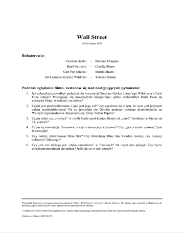 Wall Street Oliver Stone 1987 Bohaterowie: Gordon Gekko – Michael Douglas Bud Fox (syn) – Charlie Sheen Carl Fox (ojciec) – Martin Sheen Sir Laurance (Larry) Wildman – Terence Stamp Podczas oglądania filmu, zastanów się nad następującymi pytaniami: 1. Jak scharakteryzowałbyś podejście do inwestycji Gordona Gekko, Larry’ego Wildmana i Carla Foxa (Ojca)? Posługując się powyŜszymi kategoriami, gdzie umieściłbyś Buda Foxa na początku filmu, w trakcie i na końcu? 2. Czym jest przedsiębiorstwo i jaki jest jego cel? Czy zgadzasz się z tym, Ŝe zysk jest jedynym celem przedsiębiorstwa? Na co powołuje się Gordon podczas swojego przemówienia na Walnym Zgromadzeniu Akcjonariuszy firmy Teldar Papers? 3. Czym róŜni się „tworzyć” w myśli Carla (pod koniec filmu) od „mieć” Gordona (w biurze na 21. piętrze)? 4. Czym są inwestycje finansowe, a czym inwestycje rzeczowe? Czy „gra o sumie zerowej” jest inwestycją? 5. Czy naleŜy zlikwidować Blue Star? Czy likwidując Blue Star Gordon tworzy, czy niszczy dobrobyt? Dlaczego? 6. Czy jest coś takiego jak „etyka zawodowa” w finansach? Na czym ona polega? Czy bycie etycznym/moralnym się opłaca? Jeśli tak, to w jaki sposób? Przypadek biznesowy przygotowano na podstawie filmu „Wall Street” reŜyserii Olivera Stone’a. Ma słuŜyć jako materiał dydaktyczny do dyskusji; jego celem nie jest ocena efektywności prowadzonych działań. © Marian Moszoro: [email protected]. śadna część niniejszego dokumentu nie moŜe być kopiowana bez zgody autora. Ostatnie wydanie: 2009-02-25. Wall Street Frazesy Czy zgadzasz się z poglądami osoby, która to mówi? (weź pod uwagę kontekst, w jakim zdania te zostały wypowiedziane). Ponadto wybierz trzy zdania, które mógłbyś uznać za swoje oraz trzy, których nigdy nie chciałbyś powiedzieć lub według nich działać. Lp. Frazes Tak Nie 1. Ktoś musi zapłacić. Na pewno nie ja. (Harry, szef maklerów) 2. Wyciągasz pieniądze od obcych: jesteś akwizytorem. (Carl Fox, do swojego syna maklera) 3. Muszę mieszkać na Manhattanie. Ubóstwo juŜ nie jest cnotą. (Bud Fox) 4. śycie decyduje się w kilka chwil. Oto jedna z nich. (Bud Fox) 5. Lunch? To dobre dla frajerów. (Gordon Gekko) 6. To pewnie wykład o traceniu forsy. Gdyby miał zakład pogrzebowy, ludzie przestaliby umierać. Ten facet to kretyn. (Gordon Gekko) 7. Nie lubię strat: psują mi humor. (Gordon Gekko) 8. Zapamiętaj sobie jedno: te snoby kochają zwierzęta, nienawidzą ludzi. (Gordon Gekko: vide „Słowniczek” na końcu) 9. Informacja to najcenniejszy towar. Zgodzisz się ze mną? (Gordon Gekko) 10. Szaraczki inwestują na chybił-trafił. Ja nigdy tego nie robię. Stawiam na pewniaków. (Gordon Gekko) 11. Przeczytaj „Sztukę wojenną” Sun-Tzu: bitwy wygrywa się przed walką. Przemyśl to. (Gordon Gekko) 12. Ci faceci po Harvardzie są do niczego. Ja szukam, biednych, sprytnych, głodnych sukcesu i twardych. Taki, nawet jeśli oberwie, to i tak będzie walczył. (Gordon Gekko) 13. Jeśli szukasz przyjaciela, kup sobie psa. To jest wojna. (Gordon Gekko) 14. Będziesz graczem, albo zerem. (Gordon Gekko) 15. Pewniakami są tylko śmierć i podatki. Nie ma juŜ pewnych spółek. (Lou, starszy makler) 16. Inwestuję z myślą o moim synu. (Sir Larry Wildman) 17. Dla mnie to inwestycja długoterminowa. Chcę postawić tę spółkę na nogi, a nie rozwiązać. Spekulujesz moim kosztem. Pieniądze, za które odkupuję twoje udziały mógłbym przeznaczyć na modernizację. Nie tylko ja za to zapłacę: mówimy o tysiącach miejsc pracy. (Sir Larry Wildman) —2— Wall Street Lp. Frazes Tak Nie 18. Takie konfrontacje mnie nudzą. Nie ma w nich wygranych. Wycofam się. (Gordon Gekko) 19. „Wojna polega na podstępie” – Sun-Tzu. „Jeśli wróg jest silniejszy, unikaj go. Jeśli zły, draŜnij. Jeśli równy tobie, walcz. A jeśli nie, ustąp i dokonaj oceny”. (Bud Fox) 20. Relaks! Wszyscy tak robią. (Bud Fox) 21. Nie przyszliśmy tu dawać się fantazjowaniu, ale Ŝeby ocenić fakty ekonomiczne i polityczne. (Gordon Gekko) 22. Dziś członkowie zarządów nie ryzykują własnych pieniędzy. (Gordon Gekko) 23. Rzecz w tym, Ŝe chciwość – przy braku lepszego określenia – jest dobra. Chciwość jest poŜądana, chciwość jest skuteczna. Chciwość oczyszcza, uszlachetnia i wzbogaca ducha ewolucji. Chciwość we wszystkich swoich przejawach: pazerność na Ŝycie, pieniądze, miłość, wiedzę – doprowadziła do rozwoju ludzkości. (Gordon Gekko) 24. Ten frajer [on sam – przyp. red.] budował ją [firmę, w której pracuje – przyp. red.] od zera 30 lat temu. Wolę frajera od szczura. (Carl Fox) 25. Ten stary mechanik [on sam – przyp. red.] nie ocenia ludzi po zawartości ich portfela. (Carl Fox) 26. Ja nie sypiam z dziwkami. Dlatego Ŝyję w zgodzie z samym sobą. Nie wiem, jak ty to robisz. (Carl Fox) 27. Liczy się forsa. Reszta jest bez znaczenia. (Gordon Gekko) 28. To nie o to chodzi. Jest pula: ktoś wygrywa, ktoś przegrywa. (Gordon Gekko) 29. Pieniędzy się nie traci ani nie tworzy. Przechodzą z rąk do rąk. To magia. (Gordon Gekko) 30. Iluzja staje się faktem. Im bardziej jest realna, tym bardziej poŜądana. Kapitalizm w najlepszym wydaniu. (Gordon Gekko) 31. Ja niczego nie tworzę. Ja mam! (Gordon Gekko) 32. Chyba nie jesteś na tyle naiwny, Ŝeby wierzyć w demokrację. To wolny rynek, jesteś jego ogniwem. (Gordon Gekko) 33. To jest właśnie problem z pieniędzmi: robisz dla nich rzeczy, których nie chcesz robić. (Harry, szef maklerów) 34. Nie myśl o łatwym zysku. Zacznij tworzyć. Przestań handlować bliźnimi. (Carl Fox) —3— Wall Street Do przemyślenia: Ostatnia scena: Nowy Jork, Manhattan – widać biurowce wznoszące się ponad Sądem NajwyŜszym Stanowym. Ciekawostka: Ojciec Olivera, Lou Stone, był odnoszącym sukcesy maklerem na Wall Street. Później jego kariera skomplikowała się poprzez nieudane inwestycje i rozwód z matką