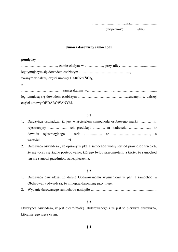 ……………..…....….dnia……….................. (miejscowość) (data) Umowa darowizny samochodu pomiędzy …………………………, zamieszkałym w ……………, przy ulicy ……………….............., legitymującym się dowodem osobistym ……………………………………., zwanym w dalszej części umowy DARCZYŃCĄ, a ……………………………, zamieszkałym w………………. , ul………………………........., legitymującą się dowodem osobistym …………………………………….zwanym w dalszej części umowy OBDAROWANYM. §1 1. Darczyńca oświadcza, iż jest właścicielem samochodu osobowego marki …………nr rejestracyjny ……………. rok produkcji ………, nr nadwozia ………………, nr dowodu rejestracyjnego - seria …................ nr ………………………….., o wartości……………………zł. 2. Darczyńca oświadcza , że opisany w pkt. 1 samochód wolny jest od praw osób trzecich, że nie toczy się żadne postępowanie, którego byłby przedmiotem, a także, że samochód ten nie stanowi przedmiotu zabezpieczenia. §2 1. Darczyńca oświadcza, że daruje Obdarowanemu wymieniony w par. 1 samochód, a Obdarowany oświadcza, że niniejszą darowiznę przyjmuje. 2. Wydanie darowanego samochodu nastąpiło ……………………………………................. §3 Darczyńca oświadcza, iż jest ojcem/matką Obdarowanego i że jest to pierwsza darowizna, którą na jego rzecz czyni. §4 Obdarowany zobowiązuje się do pokrycia ewentualnych kosztów związanych z niniejszą umową. §5 Zmiany umowy pod rygorem nieważności winny nastąpić w formie pisemnej. Umowa spisana została w dwóch jednobrzmiących egzemplarzach, po jednym dla Darczyńcy i jednym dla Obdarowanego. Umowę odczytano, zgodnie przyjęto i podpisano. DARCZYŃCA ................................. OBDAROWANY .................................