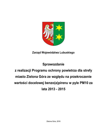 Zarząd Województwa Lubuskiego Sprawozdanie z realizacji Programu ochrony powietrza dla strefy miasto Zielona Góra ze względu na przekroczenie wartości docelowej benzo(a)pirenu w pyle PM10 za lata 2013 - 2015 Zielona Góra, 2016 Sprawozdanie z realizacji Programu ochrony powietrza dla strefy miasto Zielona Góra ze względu na przekroczenie wartości docelowej benzo(a)pirenu w pyle PM10 za lata 2013 - 2015 Prace nad Sprawozdaniem realizacji Programu ochrony powietrza dla strefy miasto Zielona Góra prowadzone były przy współpracy z Departamentem Rolnictwa, Środowiska i Rozwoju Wsi Urzędu Marszałkowskiego Województwa Lubuskiego. Nadzór merytoryczny: Jerzy Tonder Zastępca Dyrektora Departamentu Rolnictwa, Środowiska i Rozwoju Wsi, Urzędu Marszałkowskiego Województwa Lubuskiego Mariola Wielhorska Kierownik Wydziału Środowiska Departament Rolnictwa, Środowiska i Rozwoju Wsi, Urzędu Marszałkowskiego Województwa Lubuskiego Anna Kubiak Główny specjalista w Departamencie Rolnictwa, Środowiska i Rozwoju Wsi, Urzędu Marszałkowskiego Województwa Lubuskiego Zespół autorów pod kierownictwem: mgr inż. Tomasz Kasjan mgr inż. Marta Wawrzynowska Opieka ze strony dyrekcji: mgr inż. Laura Kalbrun 1 Sprawozdanie z realizacji Programu ochrony powietrza dla strefy miasto Zielona Góra ze względu na przekroczenie wartości docelowej benzo(a)pirenu w pyle PM10 za lata 2013 - 2015 Spis treści 1. PODSTAWA SPORZĄDZENIA SPRAWOZDANIA .............................................................................. 3 1.1. Cel i zakres sprawozdania.............................................................................................................. 3 2. ZAŁOŻENIA PROGRAMU OCHRONY POWIETRZA .......................................................................... 3 2.1. Opis obszaru objętego programem ................................................................................................. 4 2.2. Podstawowe kierunki działań programu ochrony powietrza ............................................................... 5 3. SPRAWOZDANIE Z REALIZACJI ZADAŃ WYZNACZONYCH W PROGRAMIE OCHRONY POWIETRZA............................................................................................................................................ 7 3.1. Działania prowadzone przez samorząd miasta .................................................................................. 8 3.2. Działania realizowane ze środków WFOŚiGW w Zielonej Górze ......................................................... 12 3.3. Podsumowanie........................................................................................................................... 12 4. STRESZCZENIE W JĘZYKU NIESPECJALISTYCZNYM ................................................................. 15 5. PODSUMOWANIE SPRAWOZDANIA Z REALIZACJI PROGRAMU ................................................ 16 6. WYKAZ MATERIAŁÓW, DOKUMENTÓW I PUBLIKACJI WYKORZYSTANYCH I PODDANYCH ANALIZIE PRZY OPRACOWANIU PROGRAMU .................................................................................. 19 Spis tabel ........................................................................................................................................ 20 Spis rysunków ................................................................................................................................. 20 2 Sprawozdanie z realizacji Programu ochrony powietrza dla strefy miasto Zielona Góra ze względu na przekroczenie wartości docelowej benzo(a)pirenu w pyle PM10 za lata 2013 - 2015 1. PODSTAWA SPORZĄDZENIA SPRAWOZDANIA 1.1. CEL I ZAKRES SPRAWOZDANIA Sprawozdanie z realizacji Programu ochrony powietrza stanowi zestaw informacji o efektach działalności samorządu lokalnego oraz jednostek organizacyjnych na terenie miasta Zielona Góra w zakresie ochrony powietrza. Celem sprawozdania jest przedstawienie wszystkich działań prowadzonych na terenie miasta, które wpływają na poprawę jakości powietrza na terenie strefy, oceny jakości powietrza oraz efektów ekologicznych wraz z poniesionymi nakładami finansowymi w okresie realizacji Programu ochrony powietrza. Obowiązek sprawozdawczy wynika bezpośrednio z art. 94 ust. 3 ustawy Prawo ochrony środowiska (tj. Dz. U. z 2013 r. poz. 1232 ze zm.). Sprawozdanie z realizacji programów ochrony powietrza oraz planów działań krótkoterminowych powinno być sporządzane, co trzy lata począwszy od dnia wejścia w życie uchwały w sprawie określenia programu ochrony powietrza lub planów działań krótkoterminowych do dnia zakończenia realizacji odpowiednio tego programu. Jeśli natomiast okres realizacji jest krótszy niż 6 miesięcy, wówczas sprawozdanie musi być złożone najpóźniej 6 miesięcy po zakończeniu realizacji tego programu lub planu. Zgodnie z rozporządzeniem Ministra Środowiska z dnia 10 września 2012 r. w sprawie zakresu i sposobu przekazywania informacji dotyczących zanieczyszczenia powietrza (Dz. U. z 2012 r. poz. 1034) sprawozdanie z realizacji programów ochrony powietrza, zawiera informacje o: 1) kierunkach i zakresie podjętych działań priorytetowych, w tym zmianach w jakości paliw dopuszczonych do stosowania na określonym terenie, zastosowaniu najlepszych dostępnych technik i innych działań ograniczających emisję substancji do powietrza, jeżeli były planowane, 2) stanie zaawansowania podjętych działań, o których mowa w pkt 1, 3) nakładach, w tym środkach finansowych, dotychczas poniesionych oraz przewidywanych do poniesienia na działania, o których mowa w pkt 1, 4) ograniczeniu emisji substancji do powietrza. Zakres sprawozdania jest wielopoziomowy, ponieważ wynika z analizy sprawozdań składanych corocznie przez Urząd Miasta Zielona Góra, a także sprawozdania z prowadzonych działań przez Wojewódzki Fundusz Ochrony Środowiska i Gospodarki Wodnej w Zielonej Górze. W zakresie prowadzonych działań i kierunków wytyczonych 