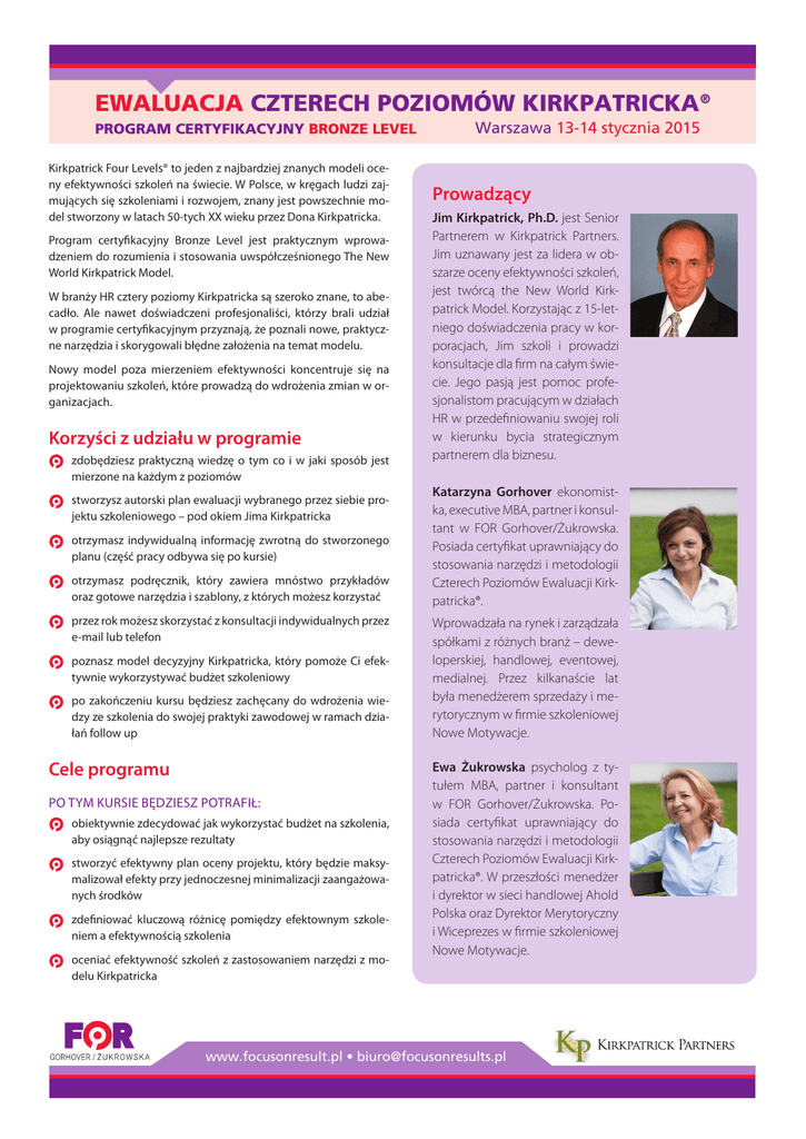 EWALUACJA CZTERECH POZIOMÓW KIRKPATRICKA® PROGRAM CERTYFIKACYJNY BRONZE LEVEL Kirkpatrick Four Levels® to jeden z najbardziej znanych modeli oceny efektywności szkoleń na świecie. W Polsce, w kręgach ludzi zajmujących się szkoleniami i rozwojem, znany jest powszechnie model stworzony w latach 50-tych XX wieku przez Dona Kirkpatricka. Program certyfikacyjny Bronze Level jest praktycznym wprowadzeniem do rozumienia i stosowania uwspółcześnionego The New World Kirkpatrick Model. W branży HR cztery poziomy Kirkpatricka są szeroko znane, to abecadło. Ale nawet doświadczeni profesjonaliści, którzy brali udział w programie certyfikacyjnym przyznają, że poznali nowe, praktyczne narzędzia i skorygowali błędne założenia na temat modelu. Nowy model poza mierzeniem efektywności koncentruje się na projektowaniu szkoleń, które prowadzą do wdrożenia zmian w organizacjach. Korzyści z udziału w programie zdobędziesz praktyczną wiedzę o tym co i w jaki sposób jest mierzone na każdym z poziomów stworzysz autorski plan ewaluacji wybranego przez siebie projektu szkoleniowego – pod okiem Jima Kirkpatricka otrzymasz indywidualną informację zwrotną do stworzonego planu (część pracy odbywa się po kursie) otrzymasz podręcznik, który zawiera mnóstwo przykładów oraz gotowe narzędzia i szablony, z których możesz korzystać przez rok możesz skorzystać z konsultacji indywidualnych przez e-mail lub telefon poznasz model decyzyjny Kirkpatricka, który pomoże Ci efektywnie wykorzystywać budżet szkoleniowy po zakończeniu kursu będziesz zachęcany do wdrożenia wiedzy ze szkolenia do swojej praktyki zawodowej w ramach działań follow up Cele programu PO TYM KURSIE BĘDZIESZ POTRAFIŁ: obiektywnie zdecydować jak wykorzystać budżet na szkolenia, aby osiągnąć najlepsze rezultaty stworzyć efektywny plan oceny projektu, który będzie maksymalizował efekty przy jednoczesnej minimalizacji zaangażowanych środków zdefiniować kluczową różnicę pomiędzy efektownym szkoleniem a efektywnością szkolenia oceniać efektywność szkoleń z zastosowaniem narzędzi z modelu Kirkpatricka Warszawa 13-14 stycznia 2015 Prowadzący Jim Kirkpatrick, Ph.D. jest Senior Partnerem w Kirkpatrick Partners. Jim uznawany jest za lidera w obszarze oceny efektywności szkoleń, jest twórcą the New World Kirkpatrick Model. Korzystając z 15-letniego doświadczenia pracy w korporacjach, Jim szkoli i prowadzi konsultacje dla firm na całym świecie. Jego pasją jest pomoc profesjonalistom pracującym w działach HR w przedefiniowaniu swojej roli w kierunku bycia strategicznym partnerem dla biznesu. Katarzyna Gorhover ekonomistka, executive MBA, partner i konsultant w FOR Gorhover/Żukrowska. Posiada certyfikat uprawniający do stosowania narzędzi i metodologii Czterech Poziomów Ewaluacji Kirkpatricka®. Wprowadzała na rynek i zarządzała spółkami z różnych branż – deweloperskiej, handlowej, eventowej, medialnej. Przez kilkanaście lat była menedżerem sprzedaży i merytorycznym w firmie szkoleniowej Nowe Motywacje. Ewa Żukrowska psycholog z tytułem MBA, partner i konsultant w FOR Gorhover/Żukrowska. Posiada certyfikat uprawniający do stosowania narzędzi i metodologii Czterech Poziomów Ewaluacji Kirkpatricka®. W przeszłości menedżer i dyrektor w sieci handlowej Ahold Polska oraz Dyrektor Merytoryczny i Wiceprezes w firmie szkoleniowej Nowe Motywacje. www.focusonresult.pl • [email protected] EWALUACJA CZTERECH POZIOMÓW KIRKPATRICKA® PROGRAM CERTYFIKACYJNY BRONZE LEVEL Cena Programu certyfikacyjnego obejmuje: Merytoryczny pakiet przedszkoleniowy Udział w dwudniowym kursie prowadzonym przez Jima Kirkpatricka z udziałem ko-trenerów Katarzyny Gorhover i Ewy Żukrowskiej (program będzie tłumaczony na język polski) Podręcznik zawierający szablony, narzędzia i przykłady Dodatkowy materiał merytoryczny, esej Warszawa 13-14 stycznia 2015 Program kursu Kurs odbywać się będzie w godzinach 9.00-18.00 Będzie tłumaczony na język polski PAKIET PRZEDSZKOLENIOWY ~~ Wstęp do Czterech Poziomów Kirkpatricka – the New World Model ~~ Przygotowanie studium przypadku ze swojej realności DZIEŃ PIERWSZY Zadanie domowe – autorski plan ewaluacji Ocenę i zindywidualizowaną informację zwrotną na temat autorskiego planu ewaluacji Certyfikat ukończenia programu na Poziomie Brązowym i oficjalne zaświadczenie Trzymiesięczny follow-up drogą mailową Nieformalne konsultacje telefoniczne/mailowe przez rok od zakończenia programu Lunch i przerwy kawowe w trakcie szkolenia Cennik Moduł 1 Wprowadzenie do Modelu Kirkpatricka ~~ Cele oceny efektywności ~~ Cztery poziomy i ich historia ~~ Efektywne szkolenie versus efektywność szkoleniowa Moduł 2 Poziom 4 – Rezultaty ~~ Zasady, techniki i planowanie na Poziomie 4 ~~ Definiowanie Poziomu 4 dla Twojego projektu ~~ Wiodące wskaźniki Moduł 3 Poziom 3 – Zachowania ~~ Zasady, techniki i planowanie na Poziomie 3 ~~ Zachowania krytyczne i stymulatory zmian Moduł 4 Poziom 2 – Uczenie ~~ Zasady, techniki i planowanie na Poziomie 2 ~~ Retrospektywna samoocena Kategoria cenowa Cena Przedsprzedaż (płatność do 28.11.2014) 3950,00 + VAT Udział w programie 4950,00 + VAT Udział w programie (3-5 osób z tej samej firmy) 3950,00 + VAT Udział w programie (powyżej 5 osób z tej samej firmy) 3700,00 + VAT DZIEŃ DRUGI Udział w programie (dla przedstawicieli administracji publicznej i organizacji pozarządowych) 4450,00 + VAT Moduł 6 Rezultatowe podejście do szkoleń i ich ewaluacji ~~ Priorytetyzacja projektów i ocena zasobów ~~ Narzędzia ewaluacji hybrydowej Dla kogo przeznaczony jest program certyfikacyjny Kurs adresowany jest do wszystkich profesjonalistów zajmujących się szkoleniami i rozwojem, chcących realizować projekty maksymalizując efekty dla organizacji przy jednoczesnej minimalizacji zaangażowanych środków. Uczestnikami mogą być osoby pracujące w średnich i dużych firmach, admi