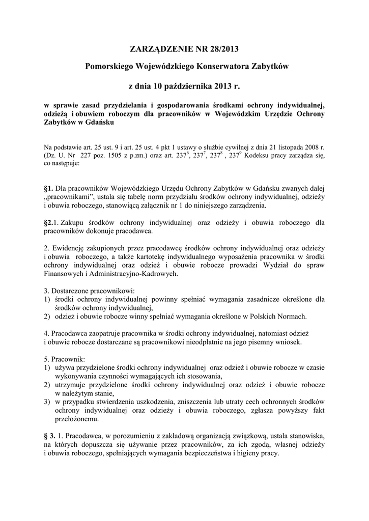 ZARZĄDZENIE NR 28/2013 Pomorskiego Wojewódzkiego Konserwatora Zabytków z dnia 10 października 2013 r. w sprawie zasad przydzielania i gospodarowania środkami ochrony indywidualnej, odzieżą i obuwiem roboczym dla pracowników w Wojewódzkim Urzędzie Ochrony Zabytków w Gdańsku Na podstawie art. 25 ust. 9 i art. 25 ust. 4 pkt 1 ustawy o służbie cywilnej z dnia 21 listopada 2008 r. (Dz. U. Nr 227 poz. 1505 z p.zm.) oraz art. 2376, 2377, 2378 , 2379 Kodeksu pracy zarządza się, co następuje: §1. Dla pracowników Wojewódzkiego Urzędu Ochrony Zabytków w Gdańsku zwanych dalej „pracownikami”, ustala się tabelę norm przydziału środków ochrony indywidualnej, odzieży i obuwia roboczego, stanowiącą załącznik nr 1 do niniejszego zarządzenia. §2.1. Zakupu środków ochrony indywidualnej oraz odzieży i obuwia roboczego dla pracowników dokonuje pracodawca. 2. Ewidencję zakupionych przez pracodawcę środków ochrony indywidualnej oraz odzieży i obuwia roboczego, a także kartotekę indywidualnego wyposażenia pracownika w środki ochrony indywidualnej oraz odzież i obuwie robocze prowadzi Wydział do spraw Finansowych i Administracyjno-Kadrowych. 3. Dostarczone pracownikowi: 1) środki ochrony indywidualnej powinny spełniać wymagania zasadnicze określone dla środków ochrony indywidualnej, 2) odzież i obuwie robocze winny spełniać wymagania określone w Polskich Normach. 4. Pracodawca zaopatruje pracownika w środki ochrony indywidualnej, natomiast odzież i obuwie robocze dostarczane są pracownikowi nieodpłatnie na jego pisemny wniosek. 5. Pracownik: 1) używa przydzielone środki ochrony indywidualnej oraz odzież i obuwie robocze w czasie wykonywania czynności wymagających ich stosowania, 2) utrzymuje przydzielone środki ochrony indywidualnej oraz odzież i obuwie robocze w należytym stanie, 3) w przypadku stwierdzenia uszkodzenia, zniszczenia lub utraty cech ochronnych środków ochrony indywidualnej oraz odzieży i obuwia roboczego, zgłasza powyższy fakt przełożonemu. § 3. 1. Pracodawca, w porozumieniu z zakładową organizacją związkową, ustala stanowiska, na których dopuszcza się używanie przez pracowników, za ich zgodą, własnej odzieży i obuwia roboczego, spełniających wymagania bezpieczeństwa i higieny pracy. 2.Wykaz stanowisk, o których mowa w ust.1, stanowi załącznik nr 2 do niniejszego zarządzenia. 3. Pracownik wyraża zgodę na używanie własnej odzieży i obuwia roboczego na formularzu, który stanowi załącznik nr 3 do niniejszego zarządzenia. 4. Pracownikowi, używającemu własnej odzieży i obuwia roboczego, pracodawca wypłaca raz na 12 miesięcy ekwiwalent pieniężny. 5. W celu naliczenia ekwiwalentu, o którym mowa w pkt 4: 1) kierownicy przekazują do Wydziału do spraw Finansowych i Administracyjno-Kadrowych na początku IV kwartału danego roku kalendarzowego wykazy pracowników, którzy korzystają z własnej odzieży i obuwia roboczego, 2) w porozumieniu ze specjalistą realizującym zadania służby bhp, na podstawie otrzymanych wykazów, biorąc pod uwagę przewidywane okresy użytkowania odzieży i obuwia roboczego oraz aktualnie obowiązujące średnie ceny odzieży i obuwia roboczego, ustala się w Wydziale do spraw Finansowych i Administracyjno-Kadrowych w sposób proporcjonalny wysokość ekwiwalentu, który wypłacany jest pracownikom w IV kwartale roku kalendarzowego. § 4. W celu zapotrzebowania w danym roku budżetowym środków pieniężnych, koniecznych do realizacji zakupu środków ochrony indywidualnej oraz odzieży i obuwia roboczego, a także prania odzieży roboczej sporządza się w Wydziale do spraw Finansowych i Administracyjno-Kadrowych z początkiem roku kalendarzowego informacje dotyczące ilości środków ochrony indywidualnej oraz odzieży i obuwia roboczego planowanych do zakupu w danym roku. § 5. 1. Naprawa i konserwacja odzieży i obuwia roboczego oraz pranie wykonywane są na koszt pracodawcy. Biorąc pod uwagę aktualny cennik usług zakładu pralniczego, ustalana jest wysokość ekwiwalentu za pranie odzieży roboczej przez pracowników we własnym zakresie, który wypłacany jest w IV kwartale roku kalendarzowego: a) za dwunastokrotne pranie fartuchów, b) za jednorazowe pranie pozostałej odzieży roboczej. 2. Ekwiwalent za pranie, o którym mowa w ust.1: 1) ppkt a) podlega obniżeniu proporcjonalnie za każdy pełny nieprzepracowany miesiąc, 2) ppkt b) przysługuje pracownikowi, który w danym roku kalendarzowym przepracował co najmniej 6 miesięcy. § 6. 1. Okres używalności odzieży i obuwia roboczego liczy się od dnia wydania ich pracownikowi. 2. Odzież i obuwie robocze, po upływie okresu ich używalności, przechodzi na własność pracownika. 3. W przypadku zmiany stanowiska lub rozwiązania stosunku pracy: 1) środki ochrony indywidualnej podlegają zwrotowi, 2) odzież i obuwie robocze nie podlegają zwrotowi. 4. W przypadku przedwczesnego zużycia, zniszczenia odzieży i obuwia roboczego: 1) pracownik zobowiązany jest przedstawić zużytą rzecz pod ocenę komisji, w skład której wchodzi dwóch pracowników wyznaczonych przez pracodawcę. 2) komisja sporządza protokół na okoliczność przedwczesnego zużycia, zniszczenia odzieży i obuwia roboczego, w którym podaje powód i okoliczności przedwczesnego zużycia ww. rzeczy oraz ewentualnego winnego, 3) jeżeli ustalona zostanie umyślna wina pracownika w celowym zniszczeniu danej rzeczy, pracownika obciąża się kwotą równą wartości tej rzeczy, pomniejszoną o okres użytkowania. § 7. Zarządzenie wchodzi w życie z dniem podpisania. Pomorski Wojewódzki Konserwator Zabytków /-/ Dariusz Chmielewski AKCEPTACJA ORGANIZACJI ZAKŁADOWEJ NSZZ „SOLIDARNOŚĆ” Zaakceptowano Podpisy nieczytelne Załącznik nr 1 do zarządzenia nr 28/2013 PWKZ z dnia 10.10.2013 Tabela norm przydziału środków ochrony indywidualnej, odzieży i obuwia roboczego L.p. 1 1. 2. Stanowisko pracy (rodzaj wykonywan