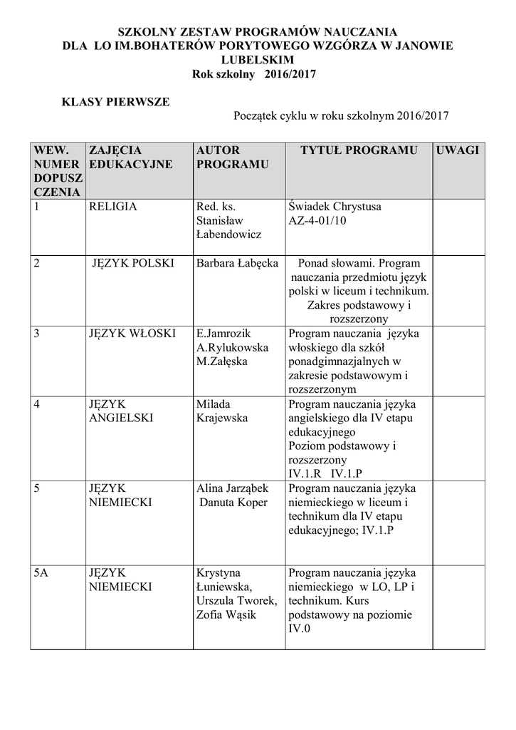 SZKOLNY ZESTAW PROGRAMÓW NAUCZANIA DLA LO IM.BOHATERÓW PORYTOWEGO WZGÓRZA W JANOWIE LUBELSKIM Rok szkolny 2016/2017 KLASY PIERWSZE Początek cyklu w roku szkolnym 2016/2017 WEW. ZAJĘCIA NUMER EDUKACYJNE DOPUSZ CZENIA 1 RELIGIA AUTOR PROGRAMU TYTUŁ PROGRAMU Red. ks. Stanisław Łabendowicz Świadek Chrystusa AZ-4-01/10 2 JĘZYK POLSKI Barbara Łabęcka 3 JĘZYK WŁOSKI E.Jamrozik A.Rylukowska M.Załęska 4 JĘZYK ANGIELSKI Milada Krajewska 5 JĘZYK NIEMIECKI Alina Jarząbek Danuta Koper Ponad słowami. Program nauczania przedmiotu język polski w liceum i technikum. Zakres podstawowy i rozszerzony Program nauczania języka włoskiego dla szkół ponadgimnazjalnych w zakresie podstawowym i rozszerzonym Program nauczania języka angielskiego dla IV etapu edukacyjnego Poziom podstawowy i rozszerzony IV.1.R IV.1.P Program nauczania języka niemieckiego w liceum i technikum dla IV etapu edukacyjnego; IV.1.P 5A JĘZYK NIEMIECKI Krystyna Łuniewska, Urszula Tworek, Zofia Wąsik Program nauczania języka niemieckiego w LO, LP i technikum. Kurs podstawowy na poziomie IV.0 UWAGI 6 JĘZYK ROSYJSKI Agata BuchowieckaFudała Program nauczania j.rosyjskiego w szkołach ponadgimnazjalnych . 7 JĘZYK FRANCUSKI Radosław Kucharczyk Program nauczania języka francuskiego w szkołach ponadgimnazjalnych. Kurs podstawowy. 8 WIEDZA O KULTURZE 9 HISTORIA 10 WIEDZA O SPOŁECZEŃ STWIE Barbara Łabęcka Program nauczania przedmiotu” Wiedza o kulturze” w liceum i technikum Jędrzej Historia. Po prostu. Wiek Smoleński XX. Program nauczania historii w szkołach ponadgimnazjalnych, poziom podstawowy. M. Grondas, Wos. Po prostu. J. Żmijski Program nauczania wiedzy o społeczeństwie w zakresie podstawowym w szkołach ponadgimnazjalnych. 11 ASTRONOMIA Waldemar Janus Astronomia 12 ASTRONOMIA Violetta Surtel 13 PODSTAWY PRZESIĘBIOR CZOŚCI 14 GEOGRAFIA 15 BIOLOGIA Marek Kaczmarczyk 15A BIOLOGIA Urszula Poziomek Astronomia dla dociekliwych K.Garbacik, Program nauczania w M.Żmiejko zakresie podstawowym dla szkół ponadgimnazjalnych. Przedsiębiorczość na czasie. Ewa Wilczyńska Czas na geografię. Program nauczania geografii w szkole ponadgimnazjalnej. PWN Biologia na czasie. Program nauczania biologii w zakresie podstawowym dla szkół ponadgimnazjalnych. Biologia na czasie. Program nauczania biologii w 16 CHEMIA Hanna Gulińska Krzysztof Kuśmierczyk 17 FIZYKA Marcin Braun, Weronika Śliwa 18 MATEMATYKA Wojciech Babiański, Lech Chańko, Joanna Czarnowska 18A MATEMATYKA 18 B MATEMATYKA PRAKTYCZNA 19 INFORMATYKA M.Kurczab E.Kurczab E.Świda Zespół nauczycieli matematyki E. Krawczyński Z. Talaga M. Wilk 20 WYCHOWANIE FIZYCZNE U.Kierczak 21 EDUKACJA DLA BEZPIECZEŃ STWA Z.Smutek M.Goniewicz A.NowakKowal zakresie rozszerzonym dla szkół ponadgimnazjalnych. Program nauczania chemii w szkołach ponadgimnazjalnych w zakresie podstawowym. Chemia. Po prostu. WSiP Odkryć fizykę. .Program nauczania fizyki w szkole ponadgimnazjalnej Program nauczania matematyki dla liceum ogólnokształcącego, liceum profilowanego i technikum Program nauczania w liceach i technikach Matematyka Praktyczna Program nauczania informatyki w zakresie podstawowym dla szkół ponadgimnazjalnych. OPERON- Odkrywamy na nowo. Koncepcja Edukacji Fizycznej Zdrowie-SportRekreacja- program zmodyfikowany przez nauczycieli wych. fizycznego Edukacja dla bezpieczeństwa. Program nauczania dla szkół ponadgimnazjalnych OPERON Zatwierdzono na Radzie Pedagogicznej, dnia 20.06.2016r.