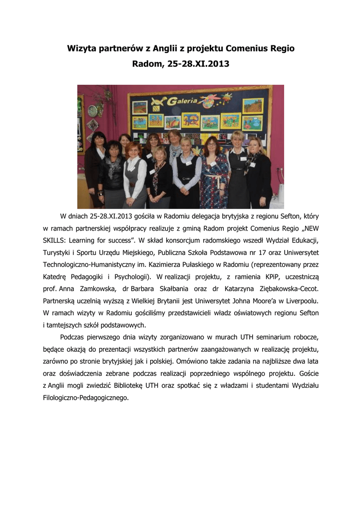 Wizyta partnerów z Anglii z projektu Comenius Regio Radom, 25-28.XI.2013 W dniach 25-28.XI.2013 gościła w Radomiu delegacja brytyjska z regionu Sefton, który w ramach partnerskiej współpracy realizuje z gminą Radom projekt Comenius Regio „NEW SKILLS: Learning for success”. W skład konsorcjum radomskiego wszedł Wydział Edukacji, Turystyki i Sportu Urzędu Miejskiego, Publiczna Szkoła Podstawowa nr 17 oraz Uniwersytet Technologiczno-Humanistyczny im. Kazimierza Pułaskiego w Radomiu (reprezentowany przez Katedrę Pedagogiki i Psychologii). W realizacji projektu, z ramienia KPiP, uczestniczą prof. Anna Zamkowska, dr Barbara Skałbania oraz dr Katarzyna Ziębakowska-Cecot. Partnerską uczelnią wyższą z Wielkiej Brytanii jest Uniwersytet Johna Moore’a w Liverpoolu. W ramach wizyty w Radomiu gościliśmy przedstawicieli władz oświatowych regionu Sefton i tamtejszych szkół podstawowych. Podczas pierwszego dnia wizyty zorganizowano w murach UTH seminarium robocze, będące okazją do prezentacji wszystkich partnerów zaangażowanych w realizację projektu, zarówno po stronie brytyjskiej jak i polskiej. Omówiono także zadania na najbliższe dwa lata oraz doświadczenia zebrane podczas realizacji poprzedniego wspólnego projektu. Goście z Anglii mogli zwiedzić Bibliotekę UTH oraz spotkać się z władzami i studentami Wydziału Filologiczno-Pedagogicznego. Następnego dnia delegacja gościła w PSP nr 17, gdzie mogli zapoznać się z pracą nauczycieli i porozmawiać z uczniami. Omówiono także zakres celów projektu, propozycje działań skierowanych do uczniów, rodziców i nauczycieli, różnice między specyfiką obu regionów, szczególnie w kwestii problemów społecznych w Polsce i Wielkiej Brytanii oraz formy współpracy z uczniami i ich rodzicami. Goście mieli także okazję spotkać się w gmachu Urzędy Miejskiego z wiceprezydentem Radomia, Ryszardem Fałkiem oraz przedstawicielami Wydziału Edukacji, Turystyki i Sportu. Spotkanie służyło prezentacji specyfiki funkcjonowania systemów edukacyjnych, działań edukacyjnych podejmowych przez Gminę Radom, szczególnie projektów współfinansowanych przez Unię Europejską. Zwieńczeniem wizyty roboczej w Radomiu było spotkanie w murach Miejskiego Domu Kultury im. Heleny Stadnickiej, gdzie goście mogli uczestniczyć w popołudniowych zajęciach edukacyjnych, m.in. próbie Orkiestry Dętej Grandioso. Zaangażowanie kierownictwa i kadry, różnorodność propozycji działań oferowanych przez MDK zrobiły ogromne wrażenie na gościach z Anglii. Projekt „NEW SKILLS: Learning for success” będzie realizowany w ciągu następnych 2 lat. Kierowany jest do rodzin z regionów o trudnej sytuacji materialnej, głównie spowodowanej wysoką stopą bezrobocia. Ma umożliwić rodzicom oraz dzieciom doskonalenie swoich podstawowych umiejętności poprzez specjalnie przygotowany program oparty na technologii informacyjnej. Program TI zostanie stworzony i wdrożony wspólnie z uniwersytetami, zarówno polskim jak i angielskim, kształcącymi nauczycieli, dzięki czemu przyszli nauczyciele będą mogli podczas studiów zrozumieć znaczenie włączania rodziców w proces edukacji. Program będzie bazował na doświadczeniach i wiedzy nauczycieli – praktyków z obu regionów tak by dopasować go potrzeb społeczności lokalnej Radomia i Sefton. Podczas realizacji projektu również nauczyciele będą mogli uczestniczyć w programie praktyk zawodowych. Wizyta robocza partnerów z Wielkiej Brytanii w Polsce była bardzo intensywna, ale także owocna. Mamy nadzieję, że nasza współpraca będzie również rozwijała się prężnie w przyszłości, a zadania podejmowane w ramach projektu rzeczywiście przyczynią się pozytywnie do poprawy funkcjonowania systemu oświaty w obu regionach oraz poprawy sytuacji społecznej uczniów i ich rodzin. Międzynarodowa współpraca może wpłynąć pozytywnie na rozwój i wymianę doświadczeń naukowych między Uniwersytetami w Radomiu i Liverpoolu. Liczymy, że zarówno polskie i brytyjskie konsorcja będą także w przyszłości korzystały z własnych doświadczeń i wzajemnie wspierały się w sprawnym i efektywnym wypełnianiu zadań edukacyjnych, zarówno na szczeblu lokalnym, jak i krajowym.