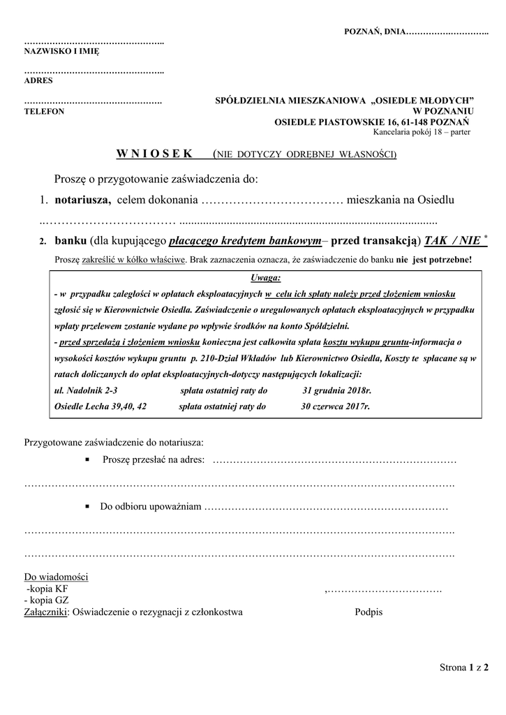POZNAŃ, DNIA…………….………….. ………………………………………….. NAZWISKO I IMIĘ ………………………………………….. ADRES SPÓŁDZIELNIA MIESZKANIOWA „OSIEDLE MŁODYCH” W POZNANIU OSIEDLE PIASTOWSKIE 16, 61-148 POZNAŃ …………………………………………. TELEFON Kancelaria pokój 18 – parter WNIOSEK (NIE DOTYCZY ODRĘBNEJ WŁASNOŚCI) Proszę o przygotowanie zaświadczenia do: 1. notariusza, celem dokonania ……………………………… mieszkania na Osiedlu ..…………………………… ....................................................................................... 2. banku (dla kupującego płacącego kredytem bankowym– przed transakcją) TAK / NIE * Proszę zakreślić w kółko właściwe. Brak zaznaczenia oznacza, że zaświadczenie do banku nie jest potrzebne! Uwaga: - w przypadku zaległości w opłatach eksploatacyjnych w celu ich spłaty należy przed złożeniem wniosku zgłosić się w Kierownictwie Osiedla. Zaświadczenie o uregulowanych opłatach eksploatacyjnych w przypadku wpłaty przelewem zostanie wydane po wpływie środków na konto Spółdzielni. - przed sprzedażą i złożeniem wniosku konieczna jest całkowita spłata kosztu wykupu gruntu-informacja o wysokości kosztów wykupu gruntu p. 210-Dział Wkładów lub Kierownictwo Osiedla, Koszty te spłacane są w ratach doliczanych do opłat eksploatacyjnych-dotyczy następujących lokalizacji: ul. Nadolnik 2-3 spłata ostatniej raty do 31 grudnia 2018r. Osiedle Lecha 39,40, 42 spłata ostatniej raty do 30 czerwca 2017r. Przygotowane zaświadczenie do notariusza: Proszę przesłać na adres: ……………………………………………………………… ………………………………………………………………………………………………………………. Do odbioru upoważniam ……………………………………………………………… ………………………………………………………………………………………………………………. ………………………………………………………………………………………………………………. Do wiadomości -kopia KF - kopia GZ Załączniki: Oświadczenie o rezygnacji z członkostwa ,……………………………. Podpis Strona 1 z 2 POZNAŃ, DNIA……………. ………….. ………………………………………….. NAZWISKO I IMIĘ ………………………………………….. ADRES …………………………………………. TELEFON SPÓŁDZIELNIA MIESZKANIOWA „OSIEDLE MŁODYCH” W POZNANIU OSIEDLE PIASTOWSKIE 16 61-148 POZNAŃ Kancelaria pokój 18 – parter W związku z zamiarem zbycia przysługującego mi spółdzielczego własnościowego prawa do lokalu mieszkalnego w zasobach Spółdzielni, położonego na Osiedlu / ulicy ……………………………………… w Poznaniu - jedynego prawa do lokalu w zasobach Spółdzielni -oświadczam, że z chwilą doręczenia Spółdzielni umowy zbycia ww. prawa, wypowiadam członkostwo w Spółdzielni i wnoszę o skrócenie okresu wypowiedzenia do jednego dnia. Informuję, że nie nabywam innego lokalu w zasobach tut. Spółdzielni. Zgodnie z §15 Statutu Spółdzielni, Członek Spółdzielni może wystąpić z niej za wypowiedzeniem złożonym na piśmie. Okres wypowiedzenia wynosi 14 dni i rozpoczyna się z dniem złożenia Spółdzielni oświadczenia o wystąpieniu (w tym przypadku doręczeniem Spółdzielni umowy zbycia). Za porozumieniem stron okres wypowiedzenia może zostać skrócony. Za datę wystąpienia członka ze Spółdzielni uważa się dzień następny po upływie okresu wypowiedzenia. ………………………………………………………………………………………………. ............................................................................................................................................................ ............................................................................................................................................................ ........................................................................................................................... ……………………………………………… podpis Strona 2 z 2