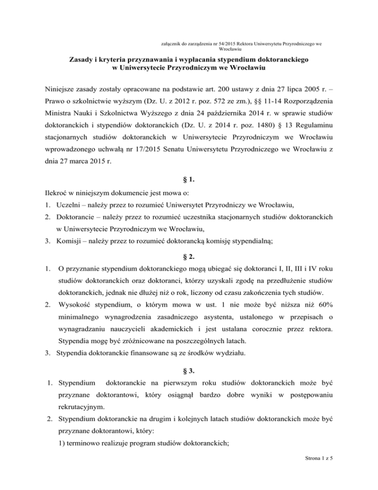 załącznik do zarządzenia nr 54/2015 Rektora Uniwersytetu Przyrodniczego we Wrocławiu Zasady i kryteria przyznawania i wypłacania stypendium doktoranckiego w Uniwersytecie Przyrodniczym we Wrocławiu Niniejsze zasady zostały opracowane na podstawie art. 200 ustawy z dnia 27 lipca 2005 r. – Prawo o szkolnictwie wyższym (Dz. U. z 2012 r. poz. 572 ze zm.), §§ 11-14 Rozporządzenia Ministra Nauki i Szkolnictwa Wyższego z dnia 24 października 2014 r. w sprawie studiów doktoranckich i stypendiów doktoranckich (Dz. U. z 2014 r. poz. 1480) § 13 Regulaminu stacjonarnych studiów doktoranckich w Uniwersytecie Przyrodniczym we Wrocławiu wprowadzonego uchwałą nr 17/2015 Senatu Uniwersytetu Przyrodniczego we Wrocławiu z dnia 27 marca 2015 r. § 1. Ilekroć w niniejszym dokumencie jest mowa o: 1. Uczelni – należy przez to rozumieć Uniwersytet Przyrodniczy we Wrocławiu, 2. Doktorancie – należy przez to rozumieć uczestnika stacjonarnych studiów doktoranckich w Uniwersytecie Przyrodniczym we Wrocławiu, 3. Komisji – należy przez to rozumieć doktorancką komisję stypendialną; § 2. 1. O przyznanie stypendium doktoranckiego mogą ubiegać się doktoranci I, II, III i IV roku studiów doktoranckich oraz doktoranci, którzy uzyskali zgodę na przedłużenie studiów doktoranckich, jednak nie dłużej niż o rok, liczony od czasu zakończenia tych studiów. 2. Wysokość stypendium, o którym mowa w ust. 1 nie może być niższa niż 60% minimalnego wynagrodzenia zasadniczego asystenta, ustalonego w przepisach o wynagradzaniu nauczycieli akademickich i jest ustalana corocznie przez rektora. Stypendia mogę być zróżnicowane na poszczególnych latach. 3. Stypendia doktoranckie finansowane są ze środków wydziału. § 3. 1. Stypendium doktoranckie na pierwszym roku studiów doktoranckich może być przyznane doktorantowi, który osiągnął bardzo dobre wyniki w postępowaniu rekrutacyjnym. 2. Stypendium doktoranckie na drugim i kolejnych latach studiów doktoranckich może być przyznane doktorantowi, który: 1) terminowo realizuje program studiów doktoranckich; Strona 1 z 5 2) wykazuje się zaangażowaniem w: - prowadzeniu zajęć dydaktycznych w ramach praktyk zawodowych albo - realizacji badań naukowych prowadzonych przez wydział; 3) w roku akademickim poprzedzającym złożenie wniosku o przyznanie stypendium doktoranckiego wykazał się postępami w pracy naukowej i w przygotowywaniu rozprawy doktorskiej, a w szczególności otworzył przewód do końca IV semestru studiów, a w uzasadnionych przypadkach w szczególności w przypadku długotrwałej choroby, zmiany opiekuna naukowego lub zmiany tematu pracy doktorskiej - do końca V semestru. § 4. 1. Doktorant ubiegający się o stypendium doktoranckie jest zobowiązany złożyć kompletny wniosek o jego przyznanie (załącznik nr 1 lub nr 2 do regulaminu), indeks oraz inne dokumenty poświadczające osiągnięcia doktoranta (Karta oceny doktoranta stanowiąca załącznik nr 2 do zarządzenia nr 34/2012 Rektora Uniwersytetu Przyrodniczego we Wrocławiu z dnia 8 marca 2012 roku) w nieprzekraczalnym terminie do dnia 5 października. doktoranckich. Wymagane dokumenty należy Doktorant korzystający z złożyć przedłużenia kierownikowi studiów studiów doktoranckich zobowiązany jest uzyskać na wniosku akceptację dziekana macierzystego wydziału. 2. W przypadku stwierdzenia braków formalnych wniosku, kierownik studiów doktoranckich wzywa doktoranta w formie pisemnej do jego uzupełnienia w terminie 7 dni od dnia otrzymania wezwania pod rygorem pozostawienia wniosku bez rozpoznania. 3. Wnioski złożone po terminie o którym mowa w ust.1 nie będą rozpatrywane. Terminy nie podlegają przywróceniu. 1. § 5. W celu opiniowania wniosków o przyznanie stypendium doktoranckiego rektor powołuje doktoranckie komisje stypendialne na poszczególnych wydziałach. 2. W skład doktoranckiej komisji stypendialnej wchodzą: 1) kierownik studiów doktoranckich pełniący funkcję przewodniczącego komisji, 2) trzech członków powoływanych spośród nauczycieli akademickich zatrudnionych na wydziale, posiadających co najmniej stopień naukowy doktora habilitowanego albo uprawnienia równoważne z uprawnieniami doktora habilitowanego na podstawie art. 21a Strona 2 z 5 ustawy z dnia 14 marca 2003 r. o stopniach naukowych i tytule naukowym oraz o stopniach i tytule w zakresie sztuki, 3) przedstawiciel doktorantów (dla każdej dyscypliny), 4) pracownik odpowiedzialny za obsługę administracyjną doktorantów pełniący funkcję sekretarza komisji. 3. Przewodniczący komisji przekazuje rektorowi listę doktorantów ze wskazaniem osób rekomendowanych do przyznania stypendium doktoranckiego, protokół z posiedzenia komisji oraz zaopiniowane wnioski o przyznanie stypendium w terminie do dnia 20 października. 4. Listy rankingowe komisje wywieszają w miejscach ogólnie dostępnych dla doktorantów oraz zamieszczają na stronie internetowej wydziału z zachowaniem przepisów ustawy o ochronie danych osobowych. 5. Decyzję w sprawie stypendium doktoranckiego podejmuje rektor. 6. Od decyzji rektora przysługuje doktorantowi prawo do złożenia wniosku o ponowne rozpatrzenie sprawy w terminie 14 dni od dnia doręczenia decyzji. 7. Decyzje w sprawie przyznania stypendium doktoranckiego są doręczane doktorantom bezpośrednio na wydziałach za pisemnym potwierdzeniem odbioru, o ile nie zachodzą trwałe i nieusuwalne przeszkody do doręczenia w tej formie decyzji. § 6. 1. Stypendium doktoranckie jest przyznawane i wypłacane przez okres 12 miesięcy, z zastrzeżeniem ust. 2, niezależnie od otrzymywanych: 1) świadczeń ze środków funduszu pomocy materialnej dla doktorantów, 2) stypendium ministra za wybitne osiągnięcia, 3) stypendiów doktorskich. 2. W przypadku przedłużenia okresu odbywania studiów doktoranckich rektor może przyznać stypendium doktoranckie w tym okresie, w szczególnie uzasadnionych i udokumentowanyc