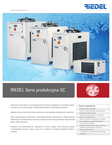 www.riedel-cooling.com RIEDEL Seria produkcyjna SC Wytwornica wody lodowej z serii produkcyjnej SC to gotowe do podłączenia, uniwersalne rozwiązanie przeznaczone do precyzyjnego i ekonomicznego chłodzenia najróżniejszych procesów. Agregat zachwyca wszechstronnością zastosowania oraz wyjątkowo kompaktowymi wymiarami. Cechy wyposażenia · W pełni hermetyczna sprężarka · Parownik w postaci płytowego wymiennika ciepła · Termostatyczny zawór rozprężny · Chłodzony powietrzem skraplacz z wentylatorem Dzięki najwyższej jakości komponentom, kilkudziesięcioletniemu doświadczeniu w zakresie techniki chłodniczej oraz standaryzowanym procesom produkcji seryjnej otrzymują Państwo niepowtarzalną jakość „Made in Germany”. Urządzenia z serii produkcyjnej SC, wyposażone w zbiornik i pompę, można elastycznie ustawić w bezpośrednim otoczeniu maszyny, poza tym są dostępne do dostawy bezpośrednio prosto z magazynu. osiowym oraz matą filtracyjną · Zbiornik z wyłącznikiem pływakowym, wskaźnikiem stanu napełnienia oraz przyłączem spustowym · Pompa czynnika chłodniczego · Sterowany mikroprocesorowo regulator z cyfrowym wskaźnikiem wartości zadanej i rzeczywistej · Zbiorcza sygnalizacja awarii · Do wody pitnej oraz mieszanek glikolu etylenowego z wodą pitną www.riedel-cooling.com Przegląd sprawności SC Moc chłodnicza netto 1) 11 21 31 51 71 101 121 kW 1,7 2,2 3,9 5,8 7,6 10,9 13,3 Moc pompy kW 0,6 0,6 0,9 0,9 0,9 1,1 1,2 Czynnik chłodniczy Typ 1,7 2,1 R134a Medium chłodnicze 2) - Temperatura otoczenia °C Temperatura wyjściowa chłodziwa °C od +8 do +25 Stała wartość zadana K ±1 Ilość chłodziwa w obiegu m³/h Swobodne ciśnienie pompy bar Pojemność zbiornika Poziom ciśnienia akustycznego 3) Zasilanie elektryczne Woda od +15 do +45 od +15 do +40 0,2 od +15 do +45 0,3 0,5 0,8 1,2 3 l 25 dB(A) 44 V/Ph/Hz 5-6 40 80 150 54 230/1/50 63 61 400/3/50 Maksymalny pobór mocy kW 1,7 1,9 2,6 3,8 4,6 6,0 7,5 Pobór mocy dla 1) kW 1,5 1,7 2,1 2,9 3,5 4,6 5,3 Maksymalny pobór prądu A 8,0 9,8 5,2 8,0 9,0 11,5 14,5 Stopień ochrony IP Przyłącza wody Rp Masa (netto) kg Wymiary szerokość x głębokość x wysokość mm 44 54 ½“ 56 ¾“ 64 475 x 780 x 390 105 156 540 x 700 x 1.050 1“ 159,5 620 x 880 x 1.230 189 193,5 720 x 1.080 x 1.400 1) Przy temperaturze wyjściowej chłodziwa 20°C i temperaturze otoczenia 32°C 2) Możliwość zastosowania wody pitnej lub mieszanek wody pitnej i glikolu etylenowego o maksymalnej zawartości do 35% obj. Inne płyny dostępne na zamówienie. 3) Półpole akustyczne bez odbicia w odległości 5 m od strony obsługi przy punkcie pracy jak w punkcie 1) SC 11 - SC 21 SC 31 - SC 121 Zestaw uzupełniający Wysokość Wysokość Do urządzeń z serii produkcyjnej SC można opcjonalnie dobrać następujące artykuły w osobnym zamówieniu: Gł ęb ok oś ć ć ć oś ok er Sz Sz er ok oś ć oś ok ęb Gł RIEDEL ServiceNet 24/7 Jako RIEDEL ServiceNet działamy w każdym liczącym się kraju przemysłowym na świecie. Nasza infolinia serwisowa jest dostępna przez całą dobę. Serwis na miejscu zapewnia indywidualne wsparcie na wszystkich etapach cyklu życia produktu. Szczegóły dotyczące naszej oferty serwisowej oraz lokalizacje i dane kontaktowe można znaleźć na stronie www.riedel-cooling.com Zastrzegamy sobie prawo do zmian technicznych i odstępstw w kolorach. Glen Dimplex Deutschland GmbH Geschäftsbereich RIEDEL Kältetechnik Am Goldenen Feld 18 I 95326 Kulmbach I Niemcy T: +49 92 21 / 709 - 555 I F: +49 92 21 / 709 - 549 [email protected] · Filtr do wody 0,6 mm · Kółka zwrotne i stałe od SC 31 · Zawór przelewowy