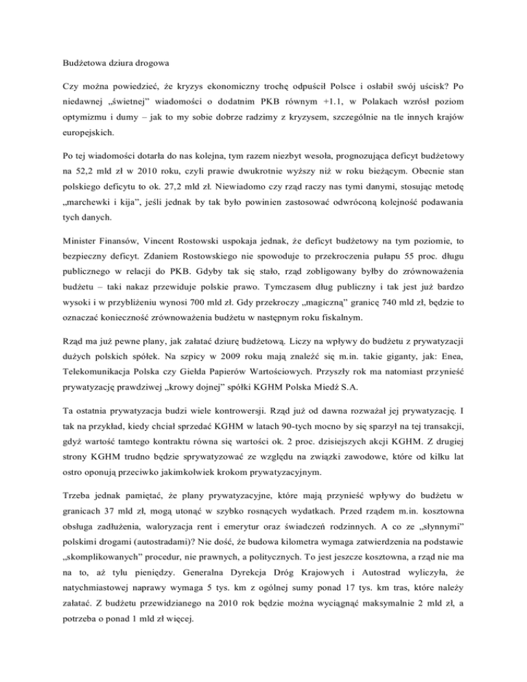 Budżetowa dziura drogowa Czy można powiedzieć, że kryzys ekonomiczny trochę odpuścił Polsce i osłabił swój uścisk? Po niedawnej „świetnej” wiadomości o dodatnim PKB równym +1.1, w Polakach wzrósł poziom optymizmu i dumy – jak to my sobie dobrze radzimy z kryzysem, szczególnie na tle innych krajów europejskich. Po tej wiadomości dotarła do nas kolejna, tym razem niezbyt wesoła, prognozująca deficyt budżetowy na 52,2 mld zł w 2010 roku, czyli prawie dwukrotnie wyższy niż w roku bieżącym. Obecnie stan polskiego deficytu to ok. 27,2 mld zł. Niewiadomo czy rząd raczy nas tymi danymi, stosując metodę „marchewki i kija”, jeśli jednak by tak było powinien zastosować odwróconą kolejność podawania tych danych. Minister Finansów, Vincent Rostowski uspokaja jednak, że deficyt budżetowy na tym poziomie, to bezpieczny deficyt. Zdaniem Rostowskiego nie spowoduje to przekroczenia pułapu 55 proc. długu publicznego w relacji do PKB. Gdyby tak się stało, rząd zobligowany byłby do zrównoważenia budżetu – taki nakaz przewiduje polskie prawo. Tymczasem dług publiczny i tak jest już bardzo wysoki i w przybliżeniu wynosi 700 mld zł. Gdy przekroczy „magiczną” granicę 740 mld zł, będzie to oznaczać konieczność zrównoważenia budżetu w następnym roku fiskalnym. Rząd ma już pewne plany, jak załatać dziurę budżetową. Liczy na wpływy do budżetu z prywatyzacji dużych polskich spółek. Na szpicy w 2009 roku mają znaleźć się m.in. takie giganty, jak: Enea, Telekomunikacja Polska czy Giełda Papierów Wartościowych. Przyszły rok ma natomiast prz ynieść prywatyzację prawdziwej „krowy dojnej” spółki KGHM Polska Miedź S.A. Ta ostatnia prywatyzacja budzi wiele kontrowersji. Rząd już od dawna rozważał jej prywatyzację. I tak na przykład, kiedy chciał sprzedać KGHM w latach 90-tych mocno by się sparzył na tej transakcji, gdyż wartość tamtego kontraktu równa się wartości ok. 2 proc. dzisiejszych akcji KGHM. Z drugiej strony KGHM trudno będzie sprywatyzować ze względu na związki zawodowe, które od kilku lat ostro oponują przeciwko jakimkolwiek krokom prywatyzacyjnym. Trzeba jednak pamiętać, że plany prywatyzacyjne, które mają przynieść wpływy do budżetu w granicach 37 mld zł, mogą utonąć w szybko rosnących wydatkach. Przed rządem m.in. kosztowna obsługa zadłużenia, waloryzacja rent i emerytur oraz świadczeń rodzinnych. A co ze „słynnymi” polskimi drogami (autostradami)? Nie dość, że budowa kilometra wymaga zatwierdzenia na podstawie „skomplikowanych” procedur, nie prawnych, a politycznych. To jest jeszcze kosztowna, a rząd nie ma na to, aż tylu pieniędzy. Generalna Dyrekcja Dróg Krajowych i Autostrad wyliczyła, że natychmiastowej naprawy wymaga 5 tys. km z ogólnej sumy ponad 17 tys. km tras, które należy załatać. Z budżetu przewidzianego na 2010 rok będzie można wyciągnąć maksymalnie 2 mld zł, a potrzeba o ponad 1 mld zł więcej. Jak drogo(wo) będziemy wyglądać na EURO 2012?