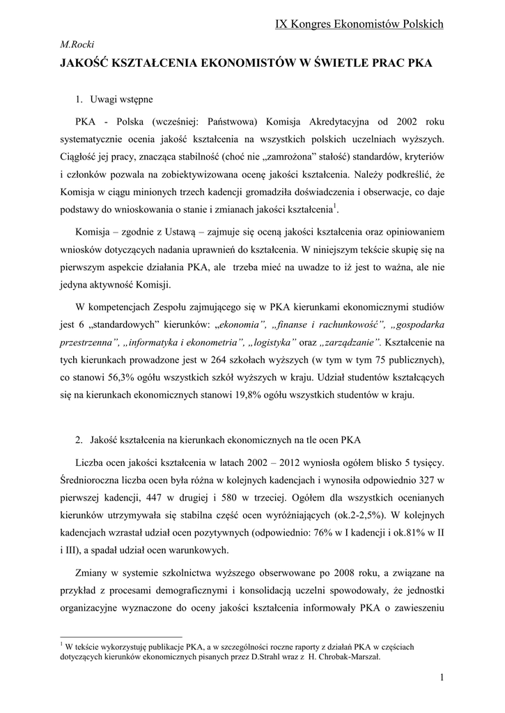 JAKOŚĆ KSZTAŁCENIA EKONOMISTÓW W ŚWIETLE PRAC PKA