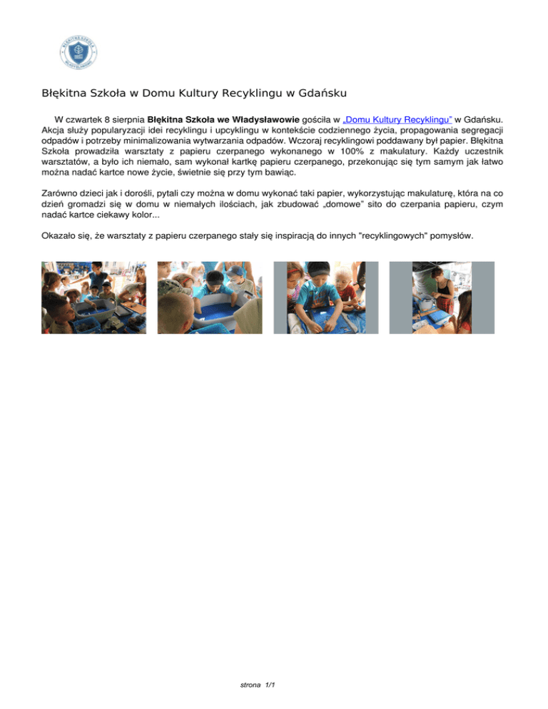 Błękitna Szkoła w Domu Kultury Recyklingu w Gdańsku W czwartek 8 sierpnia Błękitna Szkoła we Władysławowie gościła w „Domu Kultury Recyklingu” w Gdańsku. Akcja służy popularyzacji idei recyklingu i upcyklingu w kontekście codziennego życia, propagowania segregacji odpadów i potrzeby minimalizowania wytwarzania odpadów. Wczoraj recyklingowi poddawany był papier. Błękitna Szkoła prowadziła warsztaty z papieru czerpanego wykonanego w 100% z makulatury. Każdy uczestnik warsztatów, a było ich niemało, sam wykonał kartkę papieru czerpanego, przekonując się tym samym jak łatwo można nadać kartce nowe życie, świetnie się przy tym bawiąc. Zarówno dzieci jak i dorośli, pytali czy można w domu wykonać taki papier, wykorzystując makulaturę, która na co dzień gromadzi się w domu w niemałych ilościach, jak zbudować „domowe” sito do czerpania papieru, czym nadać kartce ciekawy kolor... Okazało się, że warsztaty z papieru czerpanego stały się inspiracją do innych "recyklingowych" pomysłów. strona 1/1 Powered by TCPDF (www.tcpdf.org)