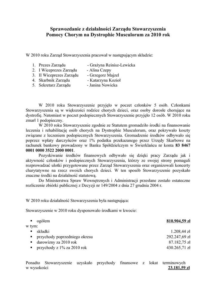 Sprawozdanie z działalności Zarządu Stowarzyszenia Pomocy Chorym na Dystrophie Musculorum za 2010 rok W 2010 roku Zarząd Stowarzyszenia pracował w następującym składzie: 1. 2. 3. 4. 5. Prezes Zarządu I Wiceprezes Zarządu II Wiceprezes Zarządu Skarbnik Zarządu Sekretarz Zarządu - Grażyna Reinisz-Lewicka - Alina Czepy - Grzegorz Majzel - Katarzyna Kozioł - Janina Nowicka W 2010 roku Stowarzyszenie przyjęło w poczet członków 5 osób. Członkami Stowarzyszenia są w większości rodzice chorych dzieci, oraz osoby dorosłe chorujące na dystrofię. Natomiast w poczet podopiecznych Stowarzyszenie przyjęło 12 osób. W 2010 roku zmarł 1 podopieczny. W 2010 roku Stowarzyszenie zgodnie ze Statutem gromadziło środki na finansowanie leczenia i rehabilitację osób chorych na Dystrophie Musculorum, oraz pokrywało koszty związane z leczeniem podopiecznych Stowarzyszenia. Gromadzenie środków odbywało się poprzez wpłaty darczyńców oraz 1% podatku przekazanego przez Urzędy Skarbowe na rachunek bankowy prowadzony w Banku Spółdzielczym w Świerklańcu nr konta 83 8467 0001 0000 3522 2000 0001. Pozyskiwanie środków finansowych odbywało się dzięki pracy Zarządu jak i aktywność członków i podopiecznych Stowarzyszenia, którzy ze swojej strony pomagali rozprowadzać ulotki przygotowane przez Zarząd Stowarzyszenia oraz organizowali koncerty charytatywne na rzecz swoich chorych dzieci. W ten sposób Stowarzyszenie pozyskało znaczne środki na działalność statutową. Do Ministerstwa Spraw Wewnętrznych i Administracji przesłane zostało ostateczne rozliczenie zbiórki publicznej z Decyzji nr 149/2004 z dnia 27 grudnia 2004 r. W 2010 roku działalność Stowarzyszenia była następująca: Stowarzyszenie w 2010 roku dysponowało środkami w kwocie: ogółem w tym: składki przychody poprzedniego okresu darowizny za 2010 rok przychody z 1% za 2010 rok Ponadto Stowarzyszenie w wysokości uzyskało 810.904,59 zł 1.208,44 zł 292.247,69 zł 87.182,75 zł 430.265,71 zł przychody finansowe z lokat terminowych 23.181,59 zł Na darowizny składały się wyłącznie kwoty pieniężne wpłacane na konto jak wyżej przez osoby fizyczne, firmy i instytucje, oraz rodziców chorych dzieci. W 2010 roku Zarząd Stowarzyszenia rozdysponował środki w kwocie: z tego: 324.449,21 zł 1. Opłacono dodatkową indywidualną rehabilitację 17 podopiecznym oraz turnusy rehabilitacyjne 26 dzieciom wraz z opiekunami w kwocie 159.064,85 zł 2. Pokryto koszty zakupu leków dla 19 osób w kwocie 20.239,62 zł 3. Pokryto koszty leczenia w Kijowie dla 2 podopiecznych w kwocie 40.094,21 zł 4. Pokryto koszty za zakupiony sprzęt rehabilitacyjny i inny dla 7 osób w kwocie 15.913,61 zł 5. Pokryto koszty zakupu wózków inwalidzkich, oraz części zamiennych do nich dla 17 podopiecznych w kwocie 48.897,69 zł 6. Pokryto koszty noclegów i usług transportowych dla 4 osób oraz pokryto koszty przejazdu podopiecznych na turnus rehabilitacyjny w kwocie 5.922,54 zł 7. Pokryto koszty badań laboratoryjnych, genetycznych, ortopedycznych, leczenia stomatologicznego i akupunktury dla 7 podopiecznych w kwocie 13.431,94 zł 8. Pokryto koszty pozostałych opłat dla 8 osób w kwocie 3.915,13 zł 9. Pokryto koszty zakupu poduszek rehabilitacyjnych stabilo, materacy przeciwodleżynowych, gorsetu ortopedycznego, obuwia, pasów stabilizujacych itp. dla 18 podopiecznych w kwocie 16.969,62 zł W 2010 roku na rzecz 13 podopiecznych Zarząd stosownymi uchwałami z ogólnych środków Stowarzyszenia wydał środki pieniężne w wysokości 31.410,98 zł. Wszystkie inne dopłaty dla podopiecznych odbywały się ze środków zgromadzonych na subkontach podopiecznych. W 2010 roku Stowarzyszenie zakupiło 2 środki trwałe – aktywatory kaszlu o łącznej wartości 44.120,00zł. Koszty administracyjne Stowarzyszenia w 2010 roku wyniosły z tego: Wydruk ulotek dla podopiecznych, zakup materiałów biurowych, laptopa, znaczków pocztowych, opłaty pocztowe, prasowe i inne koszty wynagrodzeń i narzuty na wynagrodzenia w kwocie pokrycie kosztów zorganizowania Walnego Zebrania i spotkania medycznego koszty z tytułu opłat telefonicznych i internetu wyniosły na łączną kwotę koszty podróży służbowych Zarządu wyniosły utrzymanie strony internetowej 43.240,19 zł 16.661,62 zł 21.545,16 zł 2.210,50 zł 1.503,31 zł 1.150,02 zł 169,58 zł Praca Zarządu wykonywana jest społecznie. Stowarzyszenie w znaczny sposób wspomaga rodziców w walce z nieuleczalną chorobą, poprzez kontakty z lekarzami i placówkami oraz przez przekazywanie informacji o leczeniu dzieci, a także poprzez wymianę doświadczeń w prowadzeniu rehabilitacji. Rok 2010 zamknął się wynikiem dodatnim w wysokości Zarząd Stowarzyszenia: Prezes Zarządu - Grażyna Reinisz-Lewicka W-ce Prezes Zarządu - Alina Czepy W-ce Prezes Zarządu - Grzegorz Majzel Skarbnik - Katarzyna Kozioł Sekretarz - Janina Nowicka 466.396,78 zł