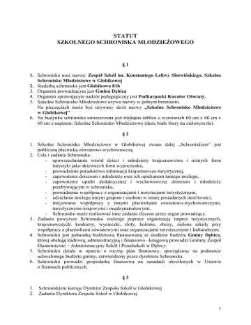 STATUT SZKOLNEGO SCHRONISKA MŁODZIEśOWEGO §1 1. Schronisko nosi nazwę: Zespół Szkół im. Konstantego Leliwy Słotwińskiego. Szkolne Schronisko MłodzieŜowe w Głobikowej 2. Siedzibą schroniska jest Głobikowa 81b 3. Organem prowadzącym jest Gmina Dębica 4. Organem sprawującym nadzór pedagogiczny jest Podkarpacki Kurator Oświaty. 5. Szkolne Schronisko MłodzieŜowe uŜywa nazwy w pełnym brzmieniu. Na pieczęciach moŜe być uŜywany skrót nazwy „Szkolne Schronisko MłodzieŜowe w Głobikowej” 6. Na budynku schroniska umieszczona jest trójkątna tablica o wymiarach 60 cm x 60 cm x 60 cm z napisem: Szkolne Schronisko MłodzieŜowe (duŜe białe litery na zielonym tle). §2 1. Szkolne Schronisko MłodzieŜowe w Głobikowej zwane dalej „Schroniskiem” jest publiczną placówką oświatowo-wychowawczą. 2. Cele i zadania Schroniska: - upowszechnianie wśród dzieci i młodzieŜy krajoznawstwa i róŜnych form turystyki jako aktywnych form wypoczynku, - prowadzenie poradnictwa informacji krajoznawczo-turystycznej, - zapewnienie dzieciom i młodzieŜy oraz ich opiekunom taniego noclegu, - zapewnienie opieki dydaktycznej i wychowawczej dzieciom i młodzieŜy przebywającym w schronisku, - prowadzenie współpracy z organizacjami i instytucjami turystycznymi, - udzielanie noclegu innym grupom i osobom w miarę posiadanych moŜliwości, - inicjowanie współpracy z innymi placówkami oświatowo-wychowawczymi, turystycznymi-krajowymi i międzynarodowymi, - Schronisko moŜe realizować inne zadania zlecone przez organ prowadzący. 3. Zadania powyŜsze Schronisko realizuje poprzez organizację imprez turystycznych, krajoznawczych: konkursy, wycieczki, zloty, kolonie, obozy, zielone szkoły przy współpracy z placówkami oświatowymi oraz organizacjami turystycznymi i kulturalnymi. 4. Schronisko jest jednostką budŜetową finansowaną ze środków budŜetu Gminy Dębica, której obsługę kadrową, administracyjną i finansowo –księgową prowadzi Gminny Zespół Ekonomiczno – Administracyjny Szkół i Przedszkoli w Dębicy. 5. Schronisko działa w oparciu o roczny plan finansowy, sporządzony na podstawie uchwalonego budŜetu gminy, zatwierdzony przez dyrektora Schroniska. 6. Schronisko prowadzi gospodarkę finansową na zasadach określonych w Ustawie o finansach publicznych. §3 1. 2. Schroniskiem kieruje Dyrektor Zespołu Szkół w Głobikowej Zadania Dyrektora Zespołu Szkół w Głobikowej 1 - 3. 4. 5. 6. kieruje działalnością placówki i reprezentuje je na zewnątrz, nadzoruje przestrzeganie praw dzieci i młodzieŜy przebywających w schronisku oraz ustala tryb składania skarg w przypadku ich naruszania, - egzekwuje przestrzeganie regulaminu schroniska przez osoby przebywające w placówce, - nadzoruje realizację planu finansowego schroniska, planuje dochody i wydatki, - organizuje administracyjną, finansową i gospodarczą obsługę schroniska, - ustala cennik korzystania ze schroniska - realizuje plan remontów, bieŜącej konserwacji oraz zakupu sprzętu, urządzeń i usług, - pozyskuje środki finansowe ze źródeł pozabudŜetowych, - wykonuje inne czynności wynikające z przepisów szczególnych lub zleconych przez organ prowadzący Schronisko. Schronisko zatrudnia pracowników pedagogicznych. Do zadań pracowników pedagogicznych naleŜy: - prowadzenie dokumentacji dotyczącej działalności opiekuńczo - wychowawczej, - Sprawowanie nadzoru nad grupami dzieci i młodzieŜy przebywającej na terenie Schroniska, - organizowanie pomocy opiekunom zorganizowanych grup, - udzielanie informacji na temat walorów turystyczno - krajoznawczych regionu, - współdziałanie z opiekunami grup w celu zachowania zasad bezpieczeństwa przez dzieci lub młodzieŜ na terenie Schroniska. Schronisko zatrudnia się recepcjonistę. Do zadań recepcjonisty naleŜy: – rejestrowanie i kwaterowanie osób korzystających z noclegu w schronisku, – przyjmowanie i rozliczanie się z przyjętej gotówki za noclegi, – udzielanie informacji turystycznej, – nadzorowanie przestrzeganie przepisów regulaminu schroniska, – prowadzenie rezerwacji. §4 1. 2. 3. 4. 5. 6. Doba noclegowa w Schronisku trwa od godziny 17,00 do godziny 10,00 dnia następnego. Obsługę Schroniska prowadzi sekretariat szkoły w godzinach pracy. Schronisko załatwia, udziela informacji i rezerwuje bezzwłocznie drogą telefoniczną, faxem, e-mail lub pisemnie. Prowadzi równieŜ wyprzedzający system rezerwacji z potwierdzeniem faxem lub w systemie rezerwacji internetowej. Ponadto Schronisko aktywnie promuje swą działalność poprzez udział w targowych imprezach turystycznych. Schronisko nie odpowiada za rzeczy wartościowe i gotówkę wniesioną przez osoby korzystające ze schroniska, nie zgłoszone do przechowania. Przedmioty cenne i rzeczy osobiste są przechowywane wg szczegółowych zasad zawartych w regulaminie Schroniska. Schronisko jest członkiem PTSM i włączone jest do krajowej i międzynarodowej sieci schronisk młodzieŜowych. Schronisko jest wyposaŜone we wszystkie niezbędne urządzenia oraz posiada stopień zorganizowania odpowiadający placówce całorocznej zgodnie z Rozporządzeniem MEN i S z dnia 07.03.2005 § 8. Schronisko posiada 40 miejsc noclegowych. Dopuszcza się okresowe zwiększenie lub zmniejszenie miejsc noclegowych. Ilość miejsc corocznie określa arkusz organizacyjny Schroniska. 2 7. 8. 9. 10. 11. 12. 13. 14. 15. 16. Schronisko spełnia wymogi placówki kategorii II zgodnie z Rozporządzeniem Ministra Gospodarki i Pracy z dnia 19.08.2004 w sprawie obiektów hotelarskich (Dz. U. z dnia 30.08.2004 załącznik nr 5 § 2). Prawa i obowiązki korzystających ze Schroniska określa ogólnodostępny regulamin placówki. Za usługi świadczone przez schronisko pobierane są opłaty ustalone w cenniku. Schronisko stosuje zniŜki dla członków Polskiego Towarzystwa Schronisk MłodzieŜowych, młodzieŜy szkolnej, akademickiej, nauczycieli, opiekunów zorganizowanych grup 