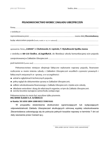 pieczęć firmowa Siedlce, dnia .......................................... PEŁNOMOCNICTWO WOBEC ZAKŁADU UBEZPIECZEŃ Firma........................................................................................................................................................................................................ z siedzibą w ........................................................................................................................................................................... reprezentowana przez ..................................................................................................... zwana dalej Zleceniodawcą będąc właścicielem pojazdu (marka, model, nr rej. i nr nadwozia)............................................................................................. ...................................................................................................................................................................................................... upowaŜnia firmę „CARSED” J. Chełstowski, K. Lipiński, T. Rybałtowski Spółka Jawna z siedzibą w 08-110 Siedlce, ul.Jagiełły4/6, do likwidacji szkody komunikacyjnej w/w pojazdu zarejestrowanej w Zakładzie Ubezpieczeń ................................................................................................... pod numerem (symbol, data) ................................................................................................................................ Pełnomocnictwo niniejsze obejmuje faktyczne wykonanie naprawy pojazdu, finansowe rozliczenie w moim imieniu szkody z Zakładem Ubezpieczeń wszelkich czynności prawnych i faktycznych związanych ze sprawą, a w szczególności: udział w oględzinach technicznych pojazdu, pełny wgląd do dokumentów sprawy w Zakładzie Ubezpieczeń, odbiór odszkodowania finansowego z Zakładu Ubezpieczeń z tytułu w/w szkody, składanie wniosków i skarg do właściwych organów, w tym do Zakładu Ubezpieczeń. zwrotu kosztów wynajęcia samochodu zastępczego Pełnomocnictwo to moŜe być wycofane tylko pisemnie. ING BANK ŚLĄSKI S.A. O/SIEDLCE nr konta: 30 1050 1894 1000 0022 3590 9161 W przypadku stwierdzenia okoliczności ograniczających lub wyłączających odpowiedzialność Zakładu Ubezpieczeń skutkujących odmową wypłaty odszkodowania Zleceniodawca zobowiązuję się do pokrycia pełnych kosztów naprawy w terminie 7 dni od daty wezwania przez Carsed sp.j. ............................................................................ (data, podpis i pieczęć imienna osoby upowaŜnionej)