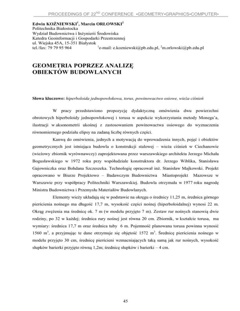 PROCEEDINGS OF 22ND CONFERENCE ▪GEOMETRY▪GRAPHICS▪COMPUTER▪ Edwin KOŹNIEWSKI1, Marcin ORŁOWSKI2 Politechnika Białostocka Wydział Budownictwa i Inżynierii Środowiska Katedra Geoinformacji i Gospodarki Przestrzennej ul. Wiejska 45A, 15-351 Białystok 1 tel./fax: 79 79 95 964 e-mail: [email protected], [email protected] GEOMETRIA POPRZEZ ANALIZĘ OBIEKTÓW BUDOWLANYCH Słowa kluczowe: hiperboloida jednopowłokowa, torus, powinowactwo osiowe, wieża ciśnień W pracy przedstawiono propozycję dydaktyczną omówienia dwu powierzchni obrotowych hiperboloidy jednopowłokowej i torusa w aspekcie wykorzystania metody Monega’a, ilustracji w aksonometrii ukośnej z zastosowaniem powinowactwa osiowego do wyznaczenia równomiernego podziału elipsy na zadaną liczbę równych części. Kanwą do omówienia, jednych a motywacją do wprowadzenia innych, pojęć i obiektów geometrycznych jest istniejąca budowla o konstrukcji stalowej – wieża ciśnień w Ciechanowie (wieżowy zbiornik wyrównawczy) zaprojektowana przez warszawskiego architekta Jerzego Michała Bogusławskiego w 1972 roku przy współudziale konstruktora dr. Jerzego Wiblika, Stanisława Gajowniczka oraz Bohdana Szczeszeka. Technologię opracował inż. Stanisław Majkowski. Projekt opracowano w Biurze Projektowo – Badawczym Budownictwa Miastoprojekt Mazowsze w Warszawie przy współpracy Politechniki Warszawskiej. Budowla otrzymała w 1977 roku nagrodę Ministra Budownictwa i Przemysłu Materiałów Budowlanych. Elementy wieży układają się w podstawie na okręgu o średnicy 11,25 m, średnica górnego pierścienia nośnego ma długość 17,7 m, wysokość części nośnej (hiperboloidalnej) wynosi 22 m. Okrąg zwężenia ma średnicę ok. 7 m (w modelu przyjęto 7 m). Zestaw rur nośnych stanowią dwie rodziny, po 32 w każdej; średnica rury nośnej jest równa 20 cm. Zbiornik, w kształcie torusa, ma wymiary: średnica 17,7 m oraz średnica tuby 6 m. Pojemność planowana torusa powinna wynosić 1560 m3, a przyjmując te dane otrzymuje się objętość 1572 m3. Średnicę pierścienia nośnego w modelu przyjęto 30 cm, średnicę pierścieni wzmacniających taką samą jak rur nośnych, wysokość słupków barierki przyjęto równą 1,2m; średnicę słupków i barierki – 4 cm. 45 PROCEEDINGS OF 22ND CONFERENCE ▪GEOMETRY▪GRAPHICS▪COMPUTER▪ Rys. 1: Konstrukcja hiperboloidy obrotowej: a) wieża ciśnień w Ciechanowie (fot. E. Koźniewski); b) założenia do konstrukcji tworzących hiperboloidy w rzutach prostokątnych; c) idea konstrukcji tworzących hiperboloidy; d) zastosowanie powinowactwa do wyznaczenia końców tworzącej (powinowactwo, podobnie jak symetria osiowa, zmienia orientację płaszczyzny; stąd wykorzystanie dwu symetrycznych rzutów poziomych) Rys. 2: a) tworząca hiperboloidy w aksonometrii (2D); b) wizualizacja jednej rodziny 32 tworzących modelu 3D oraz jednej tworzącej drugiej rodziny; c) model 3D wieży ciśnień zrealizowany w programie AutoCAD 2013 Realizacja zadania obejmuje: wykonanie rysunków 16 (12 lub 8) tworzących jednej rodziny w 2D ołówkiem (lub za pomocą programu AutoCAD) w rzutach Monge’a (rys. 1c). Następnie narysowanie tych tworzących w aksonometrii (np.) kawalerskiej z wykorzystaniem powinowactwa osiowego (rys. 1d, 2a). W przypadku wykonywania rysunku aksonometrycznego w AutoCADzie i zamiaru narysowania elips warto skorzystać z konstrukcji wyznaczenia tzw. kierunków głównych powinowactwa lub metody Ritz’a konstrukcji osi elipsy na podstawie średnic sprzężonych. Wszystko po to, by móc narysować, zadaną przez średnice sprzężone, elipsę w oparciu o osie. 46 PROCEEDINGS OF 22ND CONFERENCE ▪GEOMETRY▪GRAPHICS▪COMPUTER▪ Zadanie to stwarza znakomitą okazję do omówienia wielu zagadnień/poleceń modelowania 3D w programie AutoCAD. W szczególności: rysowanie linii 3D; wielokrotne korzystanie z polecenia PRZECIĄGNIĘCIE/SWEEP; wielokrotne korzystanie z polecenia SZYK 3D/3D ARRAY; TORUS/TORUS, RENDERMATERIAL BROWSER/RENDERUJ MATERIAŁY. Literatura: [1] Pikoń A.: AutoCAD wersja 2013. Helion, Gliwice, 2014. 47